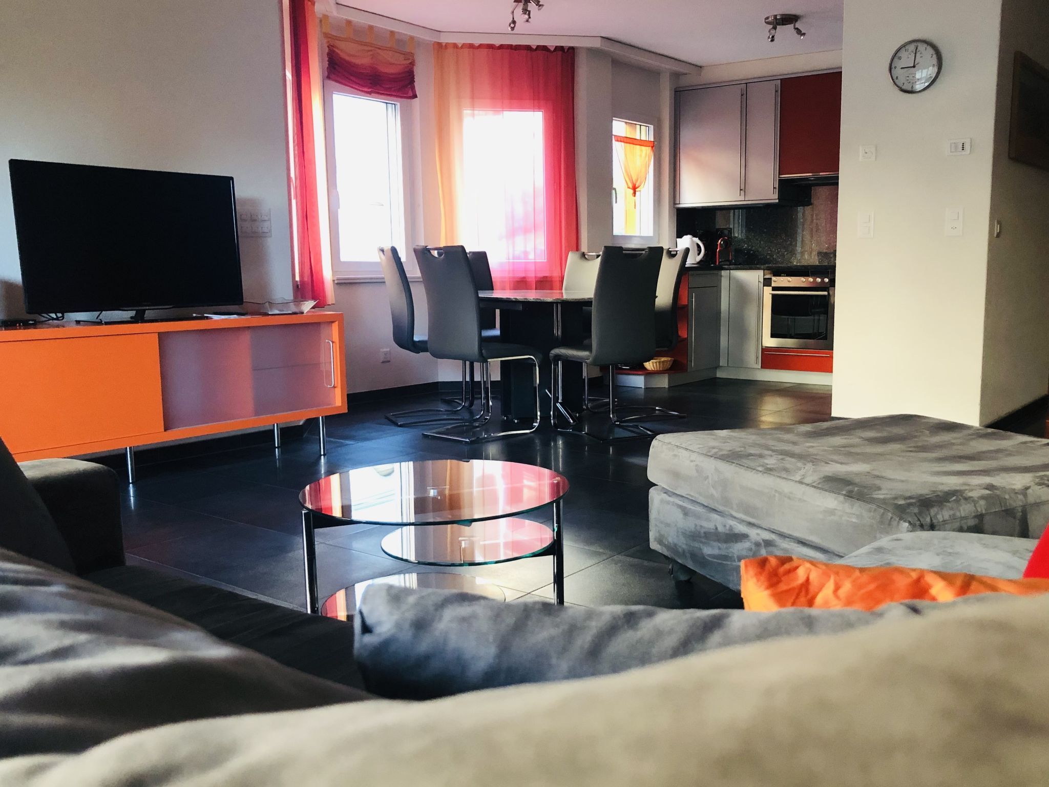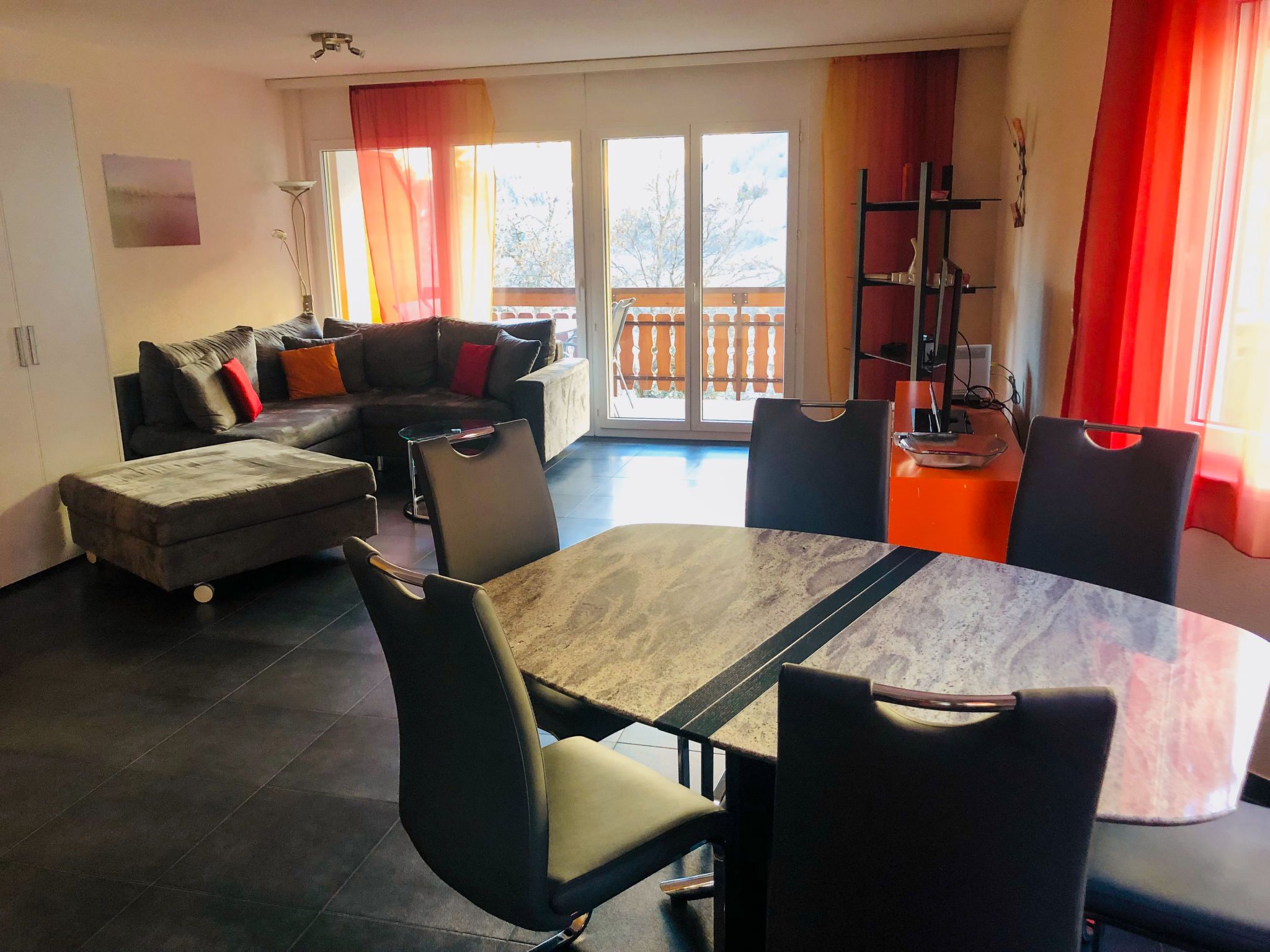 3-Zimmer-Wohnung 90 m2 im 1. Stock. Komfortabel und schön eingerichtet: Wohn-/Esszimmer mit Kabel-TV, Flachbildschirm, Stereoanlage und DVD. Ausgang zum Balkon, Richtung Süden. 1 Doppelzimmer mit 2 Betten und Dusche/WC. 1 Doppelzimmer mit 2 Betten. Offene Küche (Backofen, Geschirrspüler, 4 Glaskeramikplatten, Mikrowelle, elektrische Kaffeemaschine). Dusche/WC. Terrassenmöbel. Sehr schöne Sicht auf die Berge. Zur Verfügung: Kinderhochstuhl, Babybett. Internet (Wireless LAN, gratis). Garage (extra). Bitte beachten: Nichtraucher-Unterkunft.