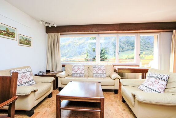 1-Zimmer-Wohnung 50 m2 im 2. Stock. Zweckmässig eingerichtet: Wohn-/Esszimmer mit 2 Wandschrankbetten und Kabel-TV (Flachbildschirm). Schlafnische mit Vorhang mit 2 Betten. Küche (Backofen, Geschirrspüler, 4 Glaskeramikplatten, Mikrowelle, elektrische Kaffeemaschine). Bad/WC. Balkon. Terrassenmöbel. Sicht auf die Berge und das Tal. Zur Verfügung: Internet (Wireless LAN, gratis). Bitte beachten: Nichtraucher-Unterkunft. Maximal 1 Haustier/Hund erlaubt. Anstelle eines abgeschlossenen Schlafzimmers befinden sich manche Schlafplätze in einem offenen Bereich (Galerie, Nische etc.).