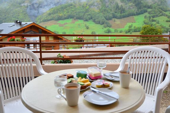 1-Zimmer-Wohnung 51 m2 im 1. Stock. Zweckmässig und gemütlich eingerichtet: Wohn-/Esszimmer mit 2 Wandschrankbetten und Kabel-TV (Flachbildschirm). Ausgang zur Terrasse. Schlafnische mit Vorhang mit 2 Betten. Küche (3 Kochplatten, Backofen, Toaster, Wasserkocher, elektrische Kaffeemaschine, Kapseln für die Kaffeemaschine (Nespresso) extra, Racletteofen, Fondue Set (Käse)) mit Durchreiche. Bad/WC, sep. WC. Terrasse 10 m2, Südwestlage. Terrassenmöbel. Schöne Sicht auf die Berge, die Landschaft und die Ortschaft. Zur Verfügung: Babybett (extra). Internet (WLAN, gratis). Bitte beachten: Nichtraucher-Unterkunft. Maximal 1 Haustier/Hund erlaubt. Anstelle eines abgeschlossenen Schlafzimmers befinden sich manche Schlafplätze in einem offenen Bereich (Galerie, Nische etc.).
