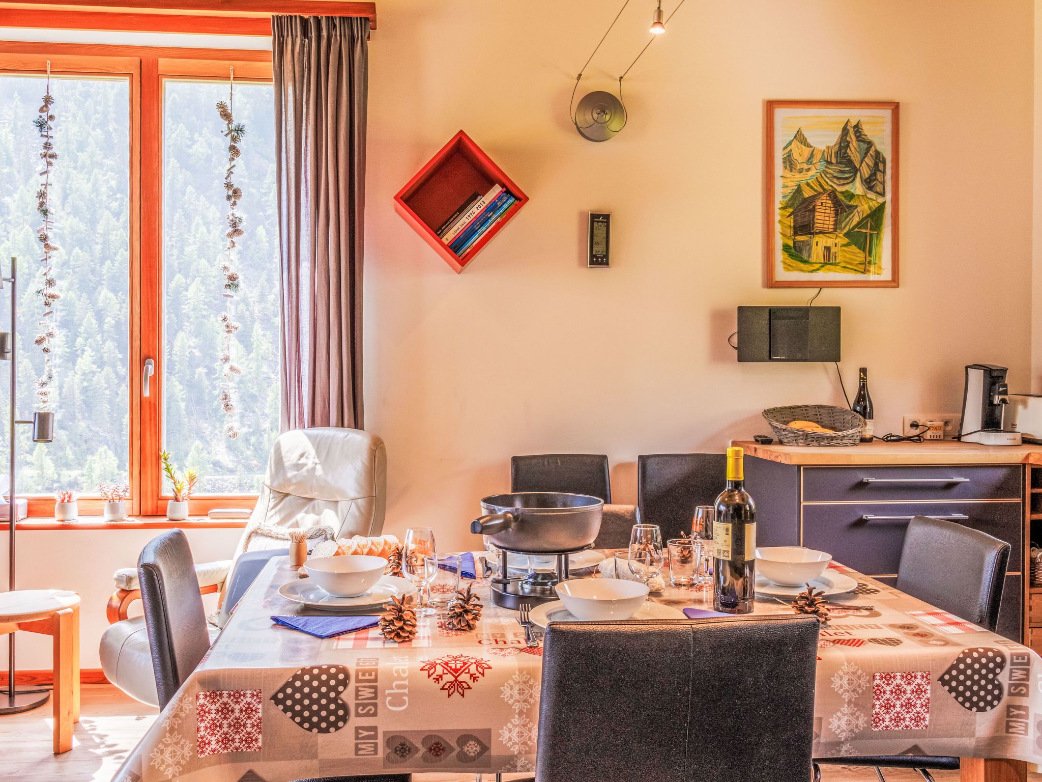 Ryad C, 4-Zimmer-Wohnung 85 m2, im Obergeschoss, Südlage. Komfortabel und geschmackvoll eingerichtet: Wohn-/Esszimmer mit Schwedenofen, Kabel-TV und E-Heizung. Ausgang zum Balkon, Richtung Süden. 1 Zimmer mit 1 Doppelbett (2 x 90 cm, Länge 200 cm). 1 kleines Zimmer mit 1 Ausziehbett (2 Pers. 2 x 90 cm, Länge 200 cm). Offene Küche (Backofen, Geschirrspüler, 4 Glaskeramikplatten, Toaster, Wasserkocher, Mikrowelle, Tiefkühler, elektrische Kaffeemaschine, Kapseln für die Kaffeemaschine (Nespresso), Racletteofen, Fondue Set (Käse)). Bad/WC, sep. WC. Warmluftheizung. Obergeschoss: 1 Zimmer mit 2 Betten (90 cm, Länge 200 cm). Parkettboden. Balkon. Balkonmöbel. Sehr schöne Sicht auf die Berge, die Landschaft und die Ortschaft. Zur Verfügung: Bügeleisen, Haartrockner, Holz (gratis). Internet (Wireless LAN, gratis). Parkplatz Nr. Ryad C beim Haus. Bitte beachten: Nichtraucher-Unterkunft.