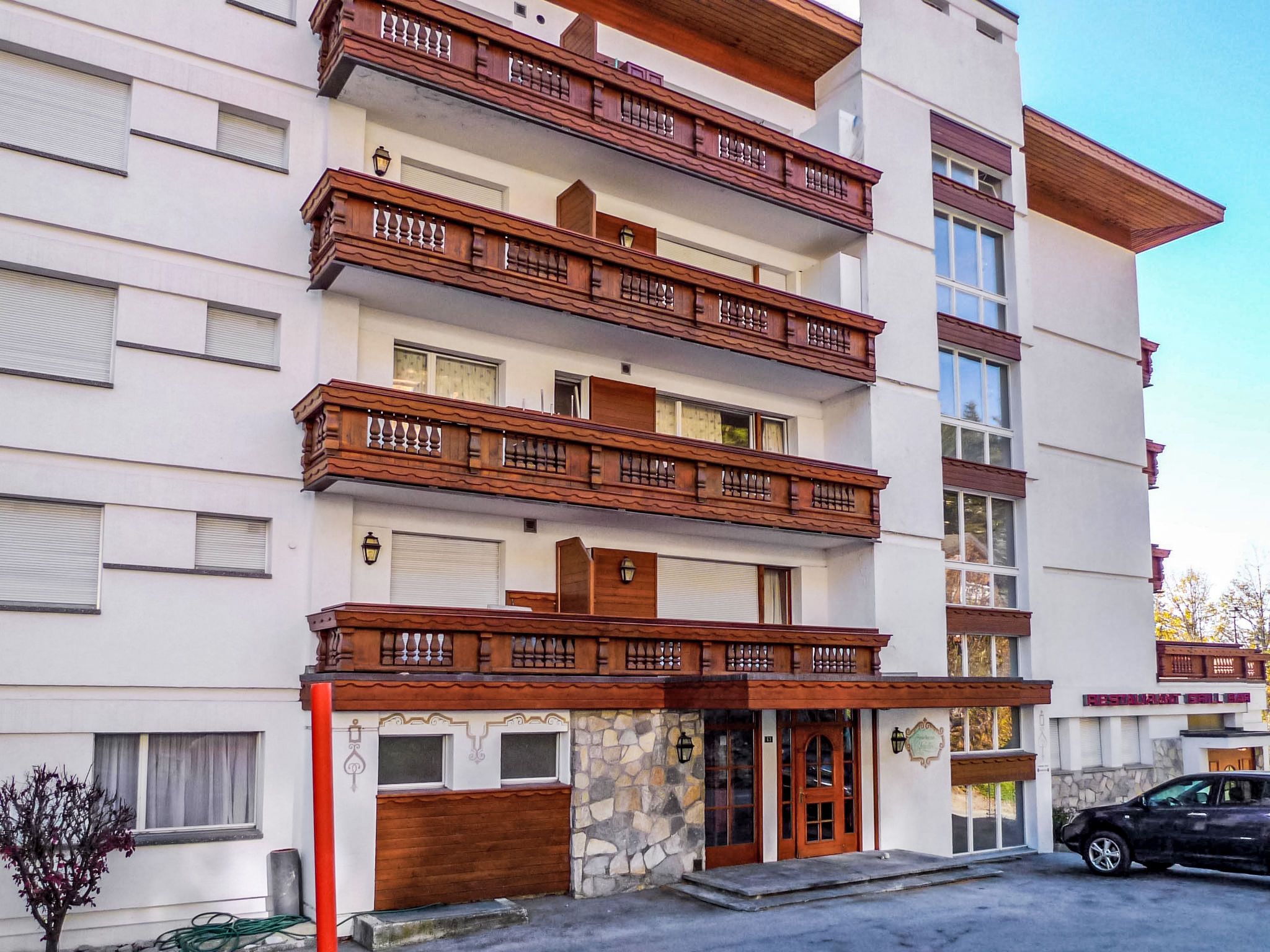 Komfortable Residenz Christina, auf 5 Stockwerken. Im Ortsteil Le Pas de l'Ours, im Ort, 800 m vom Zentrum von Crans, 1.4 km vom See, 800 m vom Skigebiet, an einer Hauptstrasse. Zur Mitbenutzung: Hallenbad beheizt (15 x 6 m, saisonale Verfügbarkeit: z. - 10.Apr. und 20.Jun. - 10.Sep. Öffnungszeiten Schwimmbad: 08:00-20:00). In der Anlage: Aufenthaltsraum, Sauna (alles inkl.), Fahrstuhl, Skiraum, Zentralheizung, Waschmaschine, Wäschetrockner (zur Mitbenutzung, extra), Trockenraum. Parkplatz (beschränkte Anzahl) beim Haus. Einkaufsgeschäft, Supermarkt 800 m, Restaurant 5 m, Bäckerei 900 m, Bushaltestelle Zier-Régent 10 m, Bahnstation Funiculaire Montana Gare 2.7 km, Badesee Moubra 2.9 km. Golfplatz (18 Loch) 1.2 km, Skisportanlagen 800 m, Ski-Kindergarten 1 km, Langlaufloipe 850 m. Bekannte Seen in der Umgebung sind gut erreichbar: Lac Grenon 1.4 km. Bitte beachten: Gratis Skibus. Sauna: Öffnung und Zeitplan wie beim Schwimmbad.