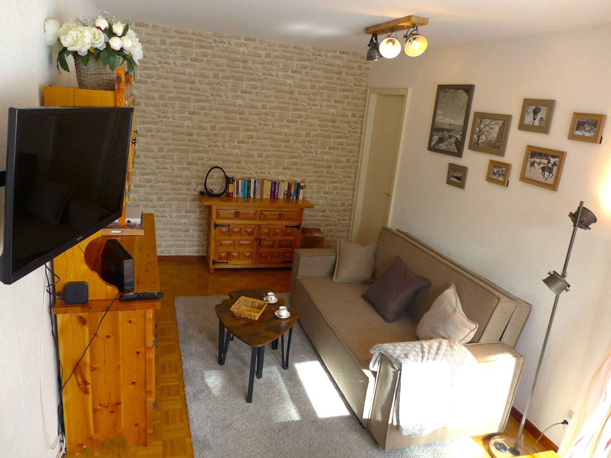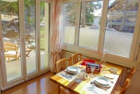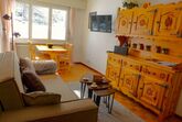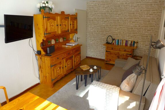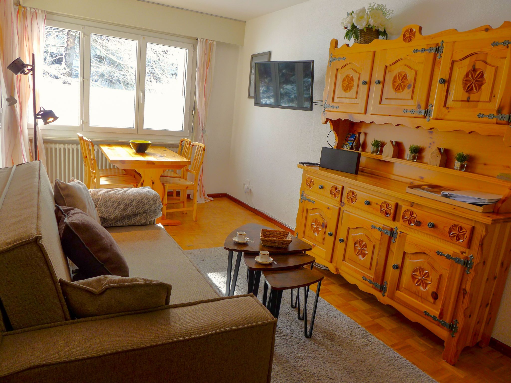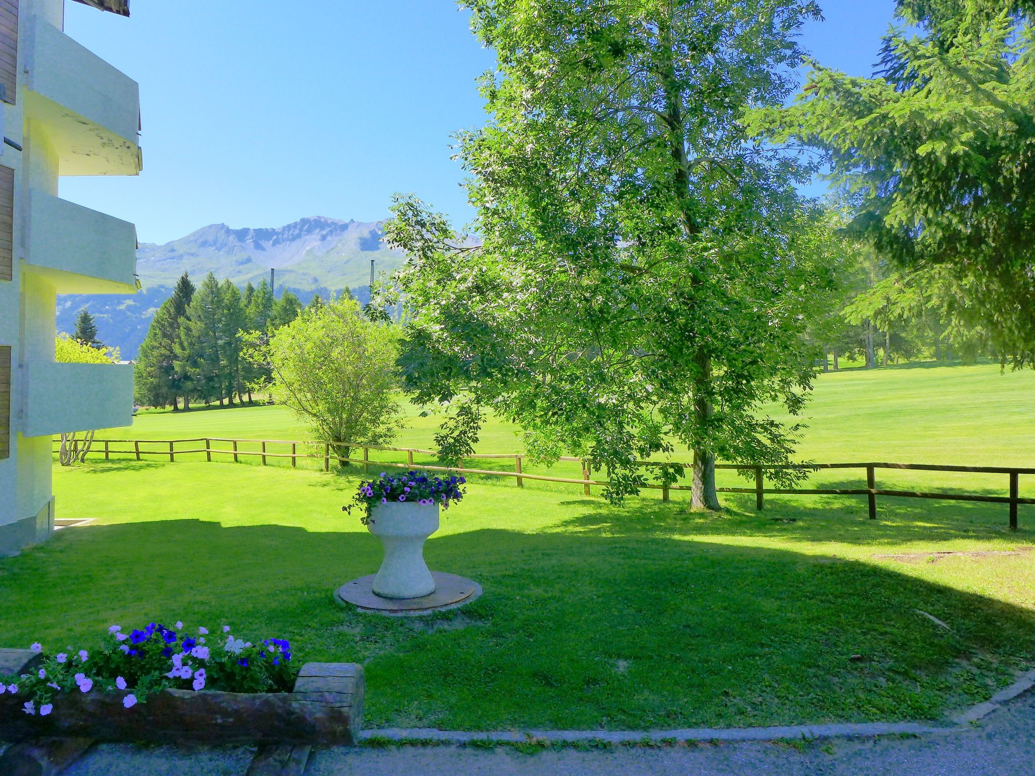 Résidence du Golf A 07, 2-Zimmer-Wohnung 36 m2, im Erdgeschoss, Ostlage. Teilweise renoviert im Jahre 2022, komfortabel und schön eingerichtet: Wohn-/Esszimmer mit Kabel-TV, Flachbildschirm und Radio. Ausgang zur Terrasse, Richtung Osten. 1 Zimmer mit 1 franz. Bett (1 x 160 cm, Länge 200 cm). Küche (3 Kochplatten, Backofen, Toaster, Wasserkocher, Mikrowelle, elektrische Kaffeemaschine, Kapseln für die Kaffeemaschine (Nespresso) extra, Racletteofen, Fondue Set (Chinoise)). Bad/WC. Kleine Terrasse 7 m2. Terrassenmöbel, Liegestühle (2). Zur Verfügung: Haartrockner. Internet (WLAN, gratis). Garage Nr. 19 in 50 m, Höhe 190 cm, Breite 230 cm. Bitte beachten: Nichtraucher-Unterkunft. Maximal 1 Haustier/Hund erlaubt.