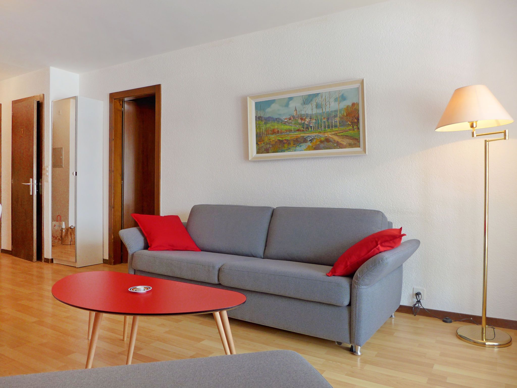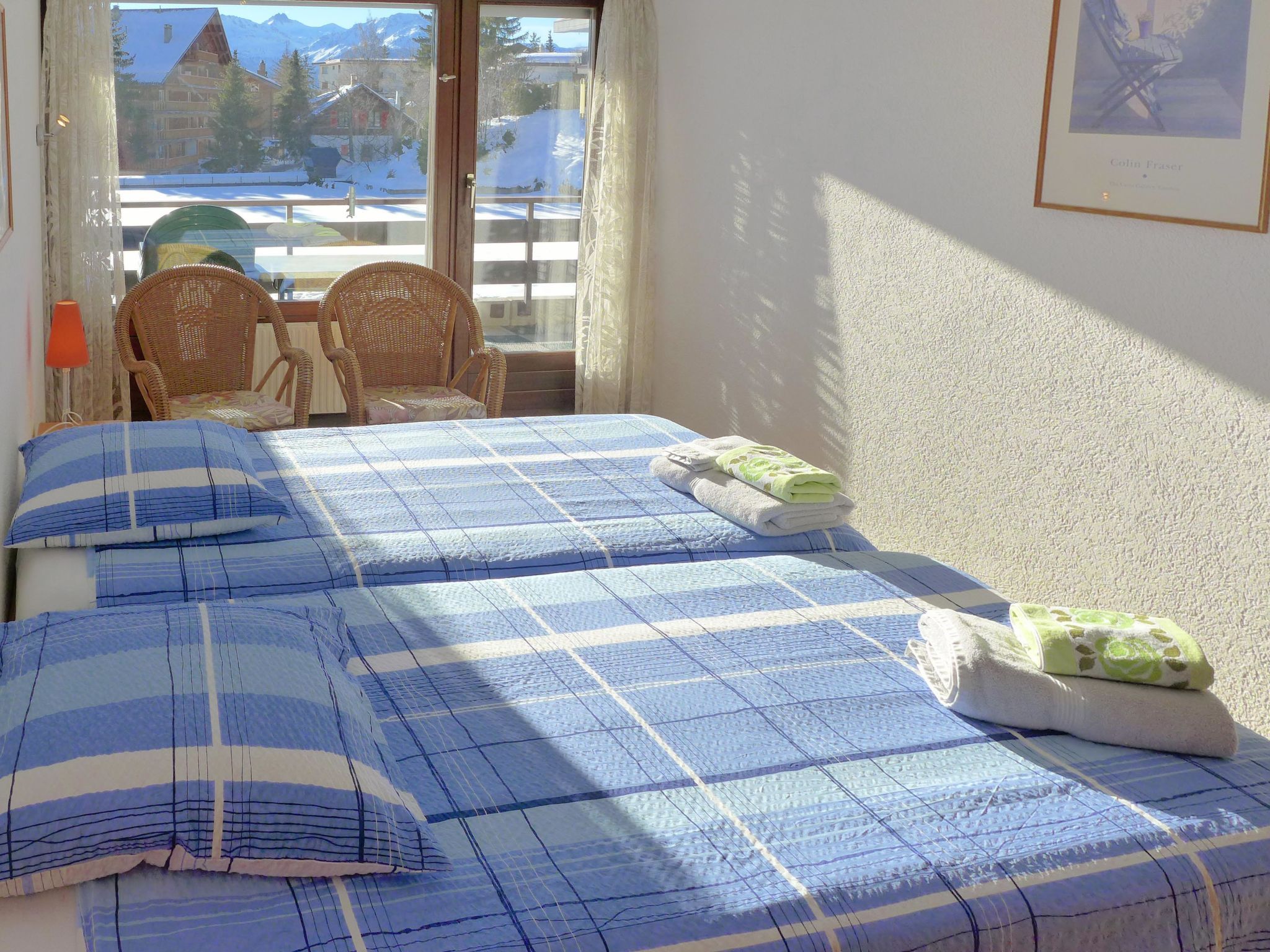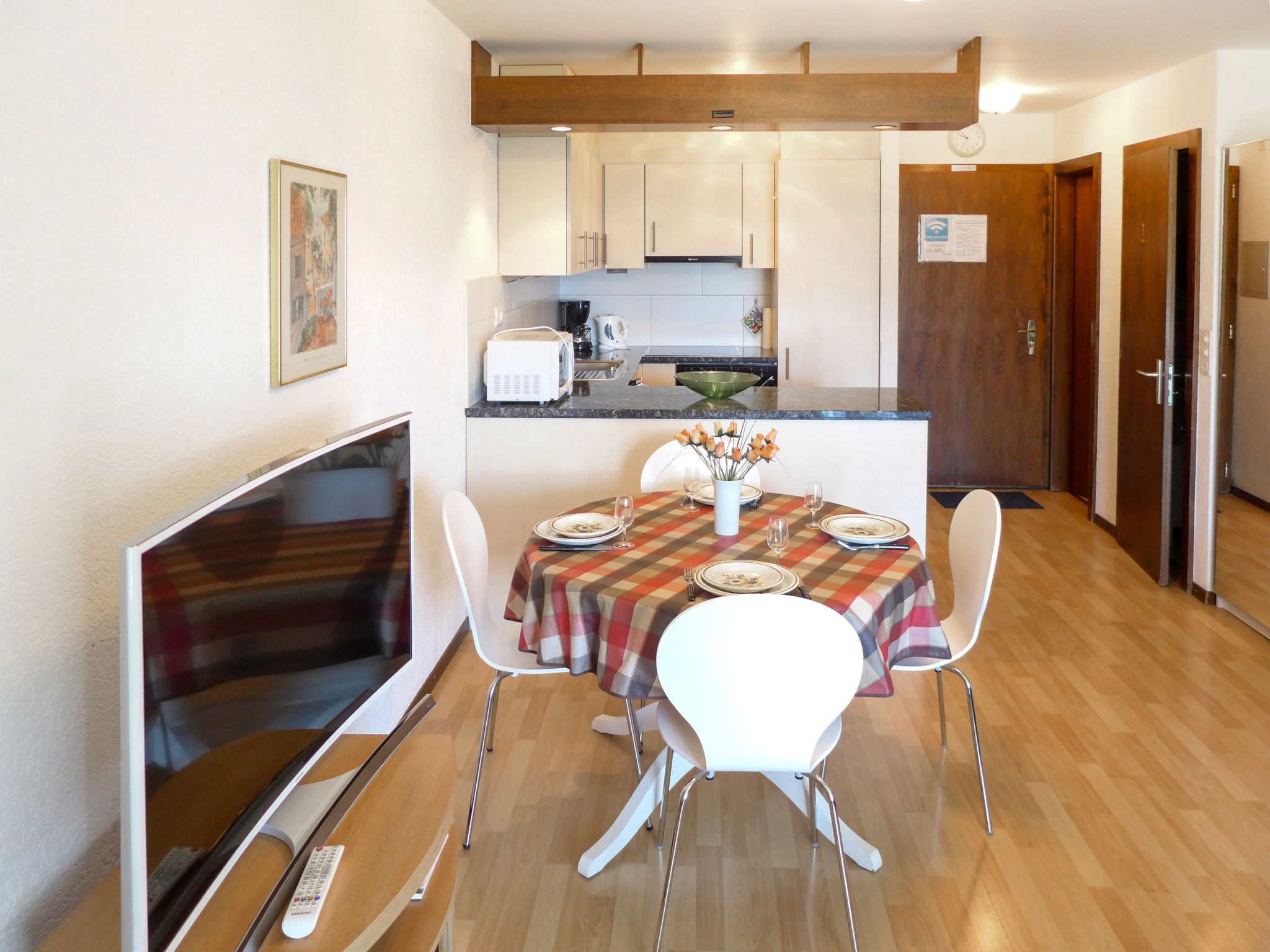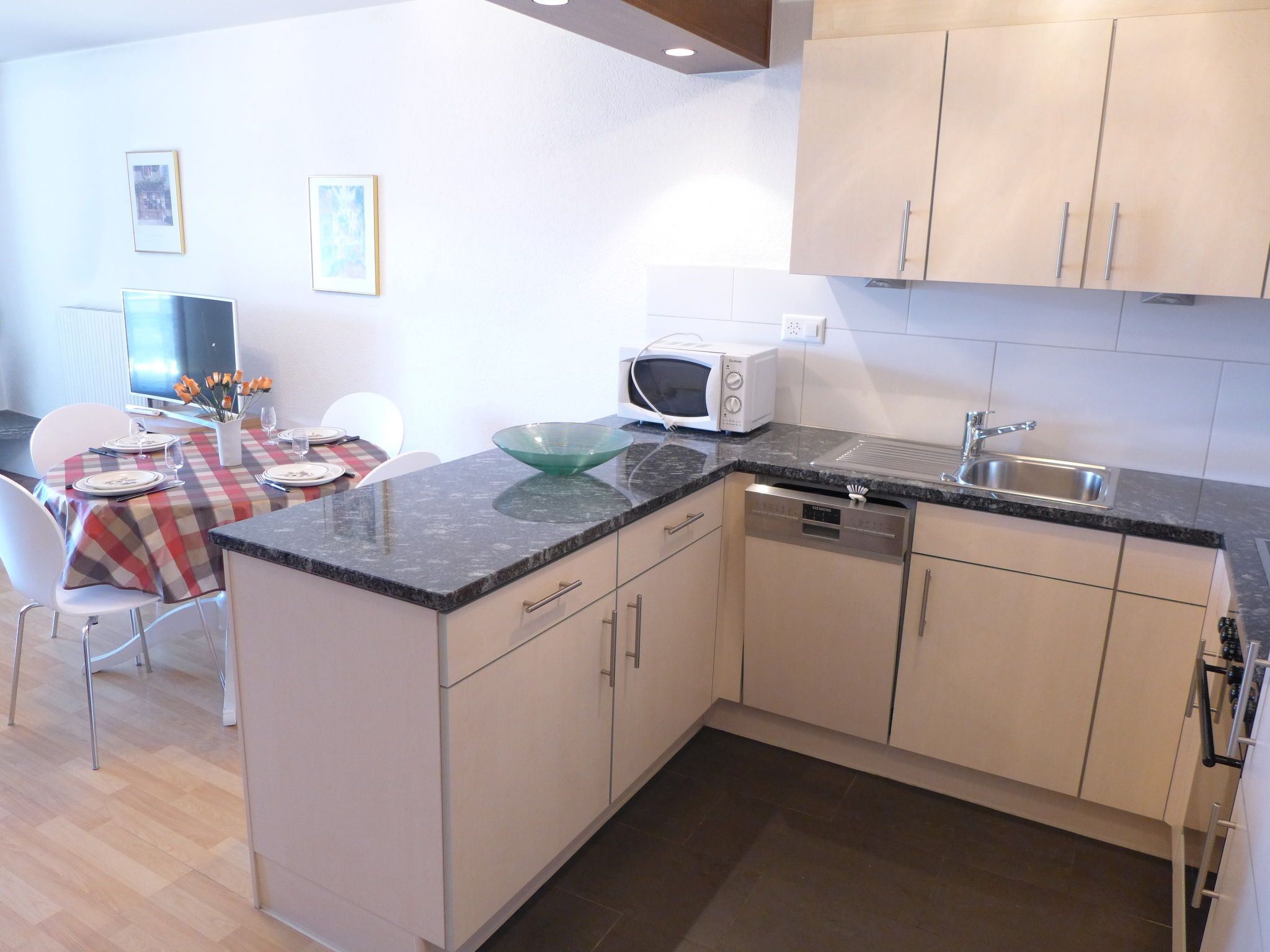 Victoria B 7, 2-Zimmer-Wohnung 50 m2 im 2. Stock. Komfortabel eingerichtet: Wohn-/Esszimmer mit 1 Diwanbett (160 cm, Länge 200 cm), Kabel-TV (Flachbildschirm). Ausgang zum Balkon. 1 Zimmer mit 2 Betten (90 cm, Länge 190 cm). Ausgang zum Balkon. Offene Küche (Backofen, Geschirrspüler, 4 Glaskeramikplatten, Toaster, Wasserkocher, Mikrowelle, elektrische Kaffeemaschine, Kapseln für die Kaffeemaschine (NESPRESSO) extra, Racletteofen, Fondue Set (Käse)) mit Bar. Bad, sep. WC. Balkon 11 m2, Südlage. Balkonmöbel, Liegestühle (2). Schöne Sicht auf die Berge. Zur Verfügung: Bügeleisen, Haartrockner. Internet (Wireless LAN, gratis). Garage Nr. 7, Höhe 200 cm, Breite 230 cm. Bitte beachten: Nichtraucher-Unterkunft.