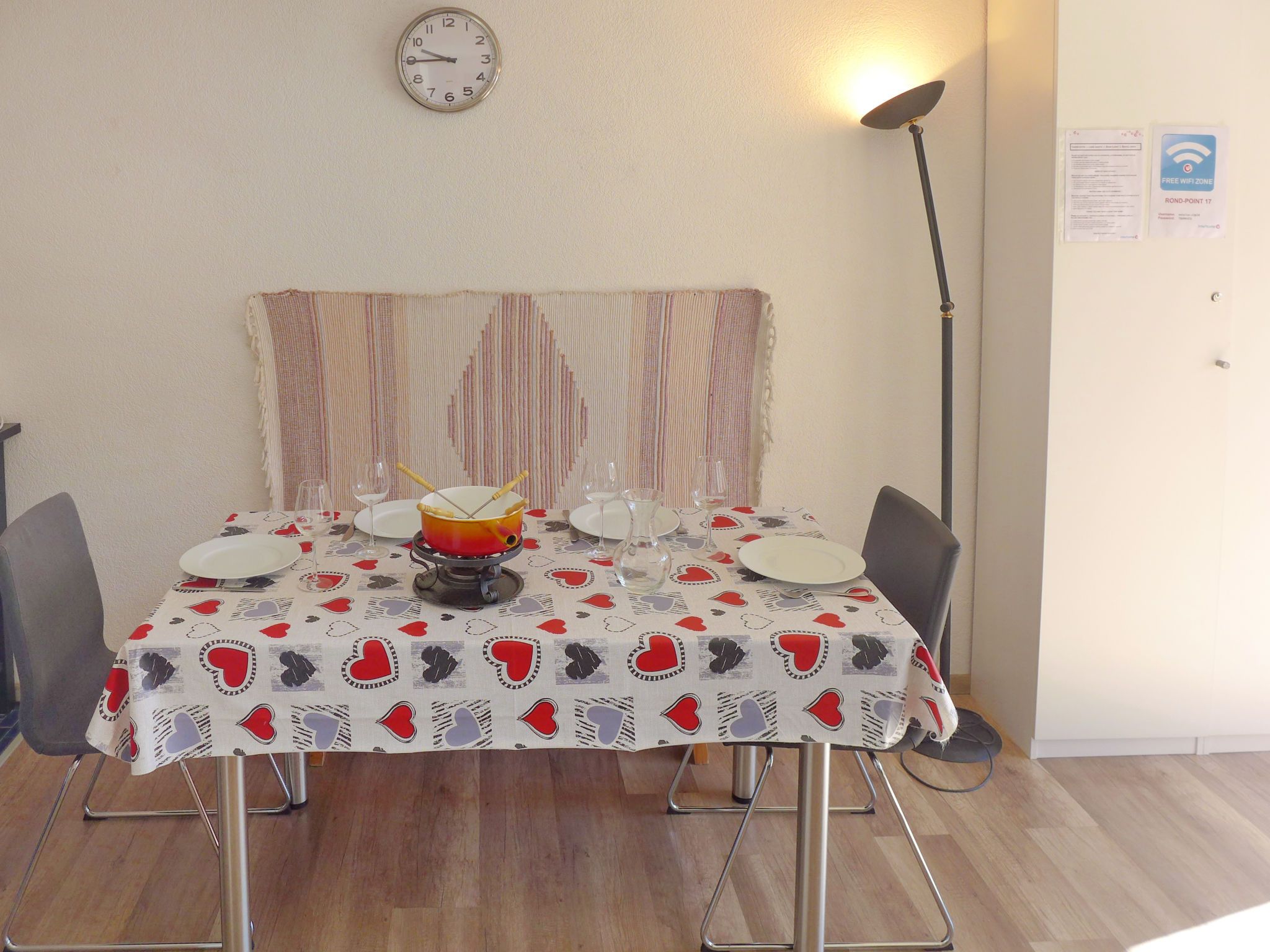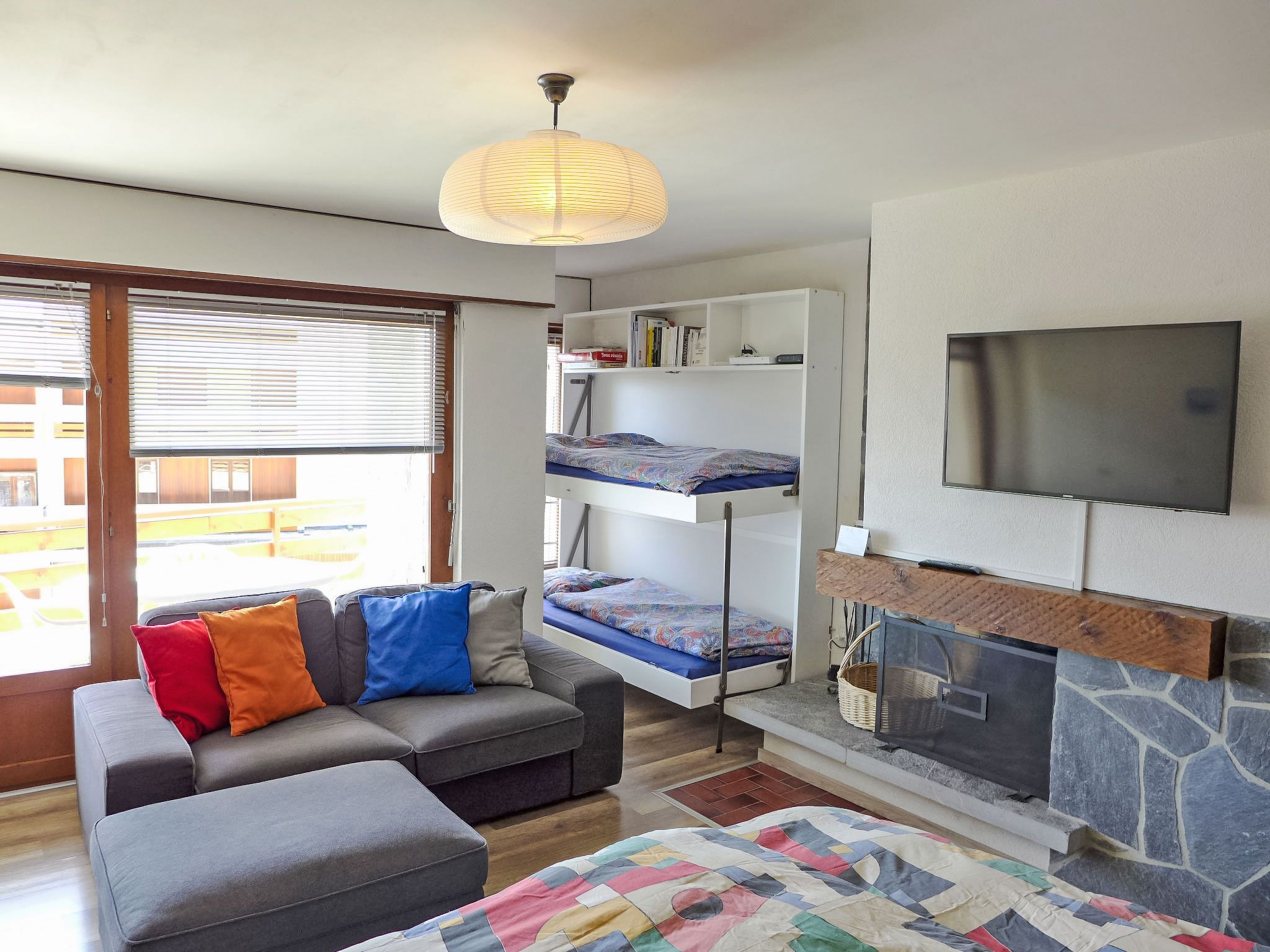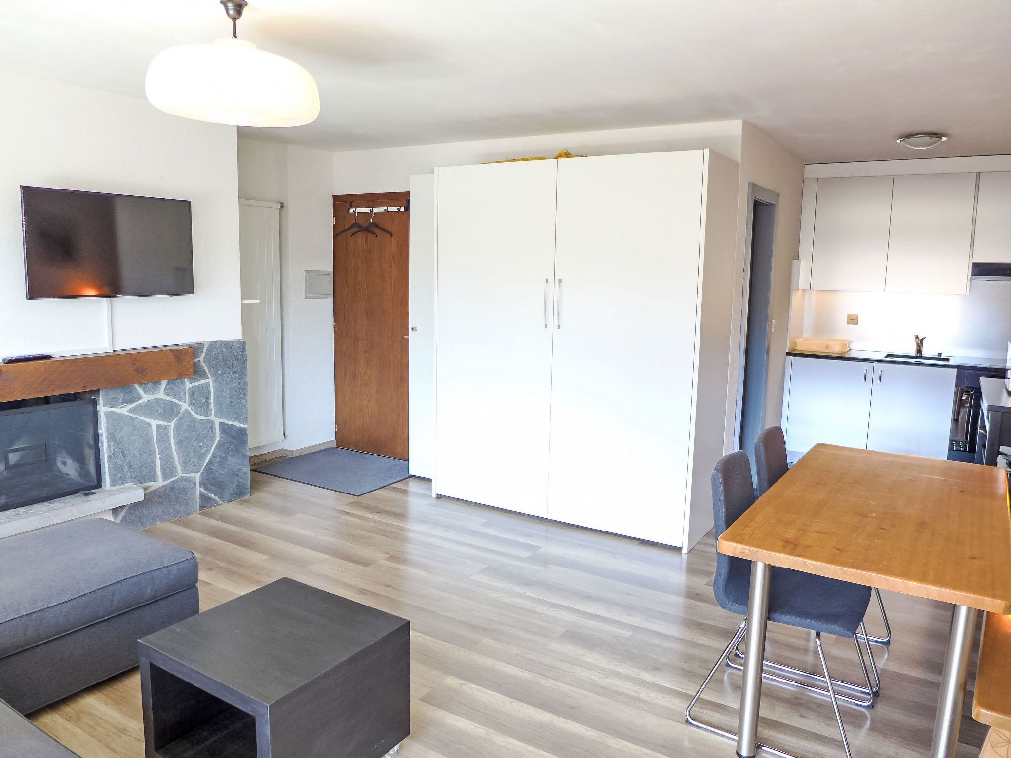 Rond-Point Apt. 17, 1-Zimmer-Wohnung 35 m2 im 2. Stock, Südlage. Objekt geeignet für 2 Erwachsene + 2 Kinder. Teilweise renoviert im Jahre 2015, zweckmässig eingerichtet: Wohn-/Esszimmer mit 1 x 2 Etagenbetten (80 cm, Länge 190 cm), 1 Doppelwandschrankbett (2 x 80 cm, Länge 190 cm), offenem Kamin, Esstisch, Kabel-TV und DVD. Ausgang zum Balkon. Offene Küche (Backofen, 4 Induktionskochplatten, Toaster, Wasserkocher, Mikrowelle, elektrische Kaffeemaschine, Kapseln für die Kaffeemaschine (Dolce Gusto) extra, Fondue Set (Käse)). Bad/Bidet/WC. Kleiner Balkon, Südlage. Balkonmöbel. Schöne Sicht auf das Tal und die Landschaft. Zur Verfügung: Haartrockner. Internet (WLAN, gratis). Garage Nr. 17 (1 Auto), Höhe 183 cm, Breite 200 cm. Bitte beachten: Wohnung auf Strassenseite. Nichtraucher-Unterkunft. Vorsicht mit niedrigen Autos, steiler Abstieg in die Garage.