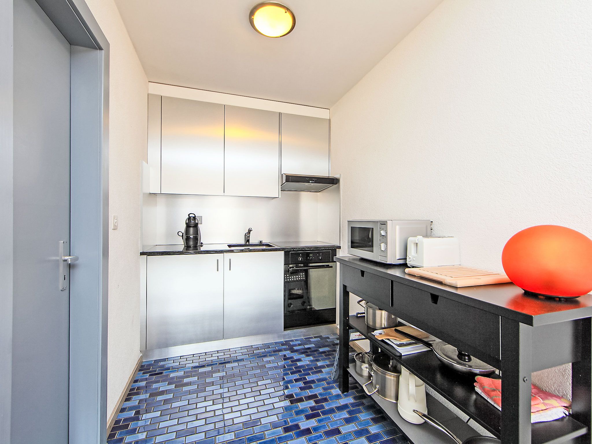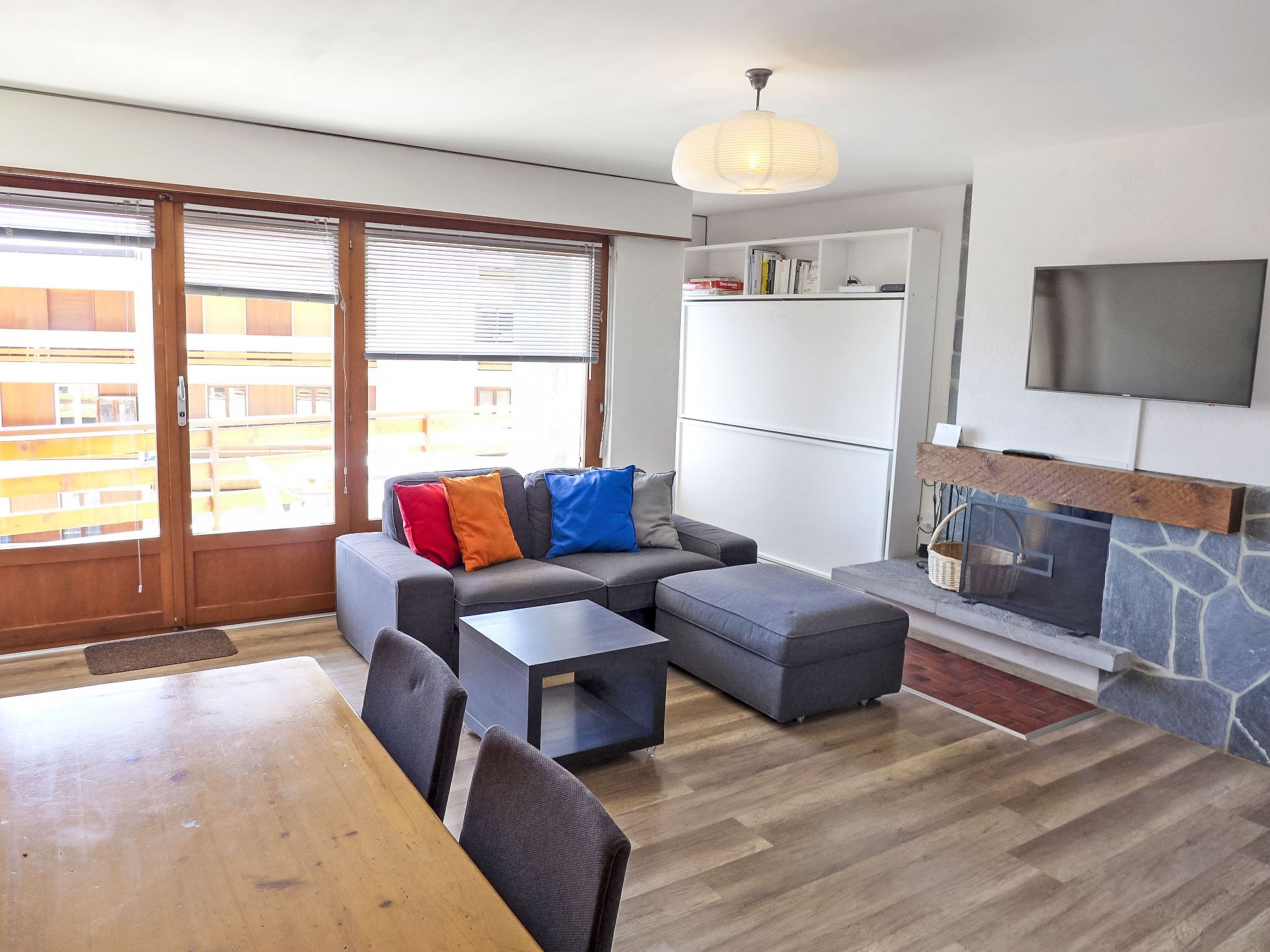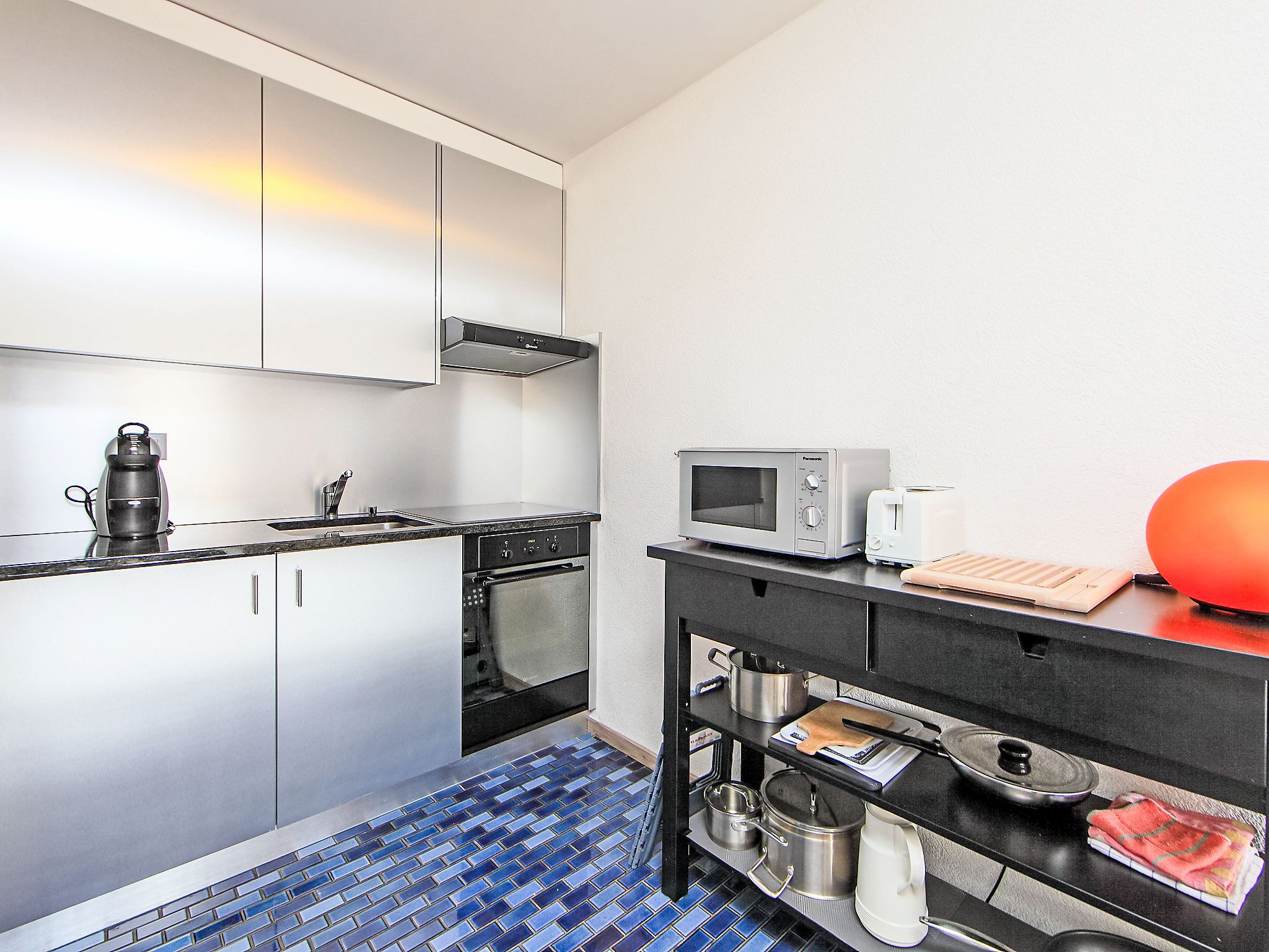 Rond-Point Apt. 17, 1-Zimmer-Wohnung 35 m2 im 2. Stock, Südlage. Objekt geeignet für 2 Erwachsene + 2 Kinder. Teilweise renoviert im Jahre 2015, zweckmässig eingerichtet: Wohn-/Esszimmer mit 1 x 2 Etagenbetten (80 cm, Länge 190 cm), 1 Doppelwandschrankbett (2 x 80 cm, Länge 190 cm), offenem Kamin, Esstisch, Kabel-TV und DVD. Ausgang zum Balkon. Offene Küche (Backofen, 4 Induktionskochplatten, Toaster, Wasserkocher, Mikrowelle, elektrische Kaffeemaschine, Kapseln für die Kaffeemaschine (Dolce Gusto) extra, Fondue Set (Käse)). Bad/Bidet/WC. Kleiner Balkon, Südlage. Balkonmöbel. Schöne Sicht auf das Tal und die Landschaft. Zur Verfügung: Haartrockner. Internet (WLAN, gratis). Garage Nr. 17 (1 Auto), Höhe 183 cm, Breite 200 cm. Bitte beachten: Wohnung auf Strassenseite. Nichtraucher-Unterkunft. Vorsicht mit niedrigen Autos, steiler Abstieg in die Garage.