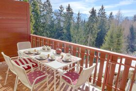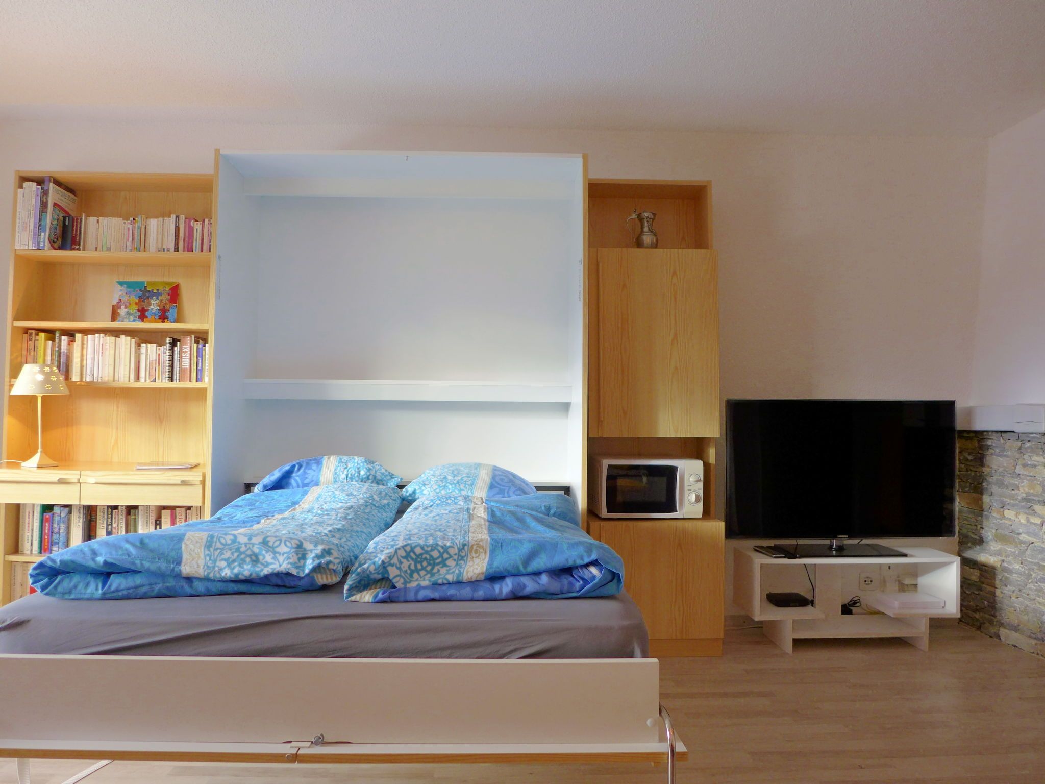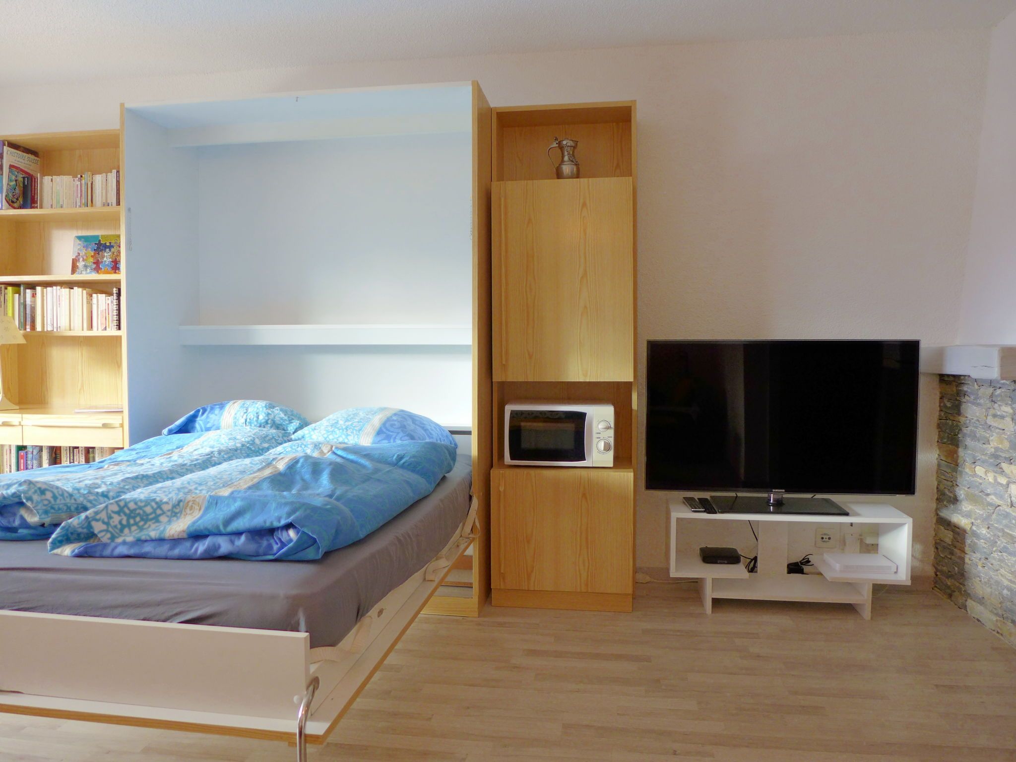 Les Faverges 1, 1-Zimmer-Studio 35 m2, im erhöhten Erdgeschoss. Objekt geeignet für 2 Erwachsene + 1 Kind. Wohn-/Esszimmer mit 1 Diwanbett (144 cm, Länge 200 cm), 1 franz. Wandklappbett (135 cm, Länge 190 cm), Kabel-TV (Flachbildschirm). Ausgang zum Balkon, Richtung Süden mit Flachbildschirm. Küche (3 Kochplatten, Backofen, Geschirrspüler, Toaster, Wasserkocher, Mikrowelle, elektrische Kaffeemaschine, Kapseln für die Kaffeemaschine (Nespresso) extra, Racletteofen). Bad/Bidet/WC. Balkon, Südlage. Balkonmöbel. Sicht auf den Wald. Zur Verfügung: Bügeleisen, Babybett bis 2 Jahre, Haartrockner. Internet (Wireless LAN, gratis). Garage Nr. 1, Höhe 200 cm, Breite 210 cm. Bitte beachten: Nichtraucher-Unterkunft. Faltbares Babybett ohne Bettwäsche und ohne Decke.