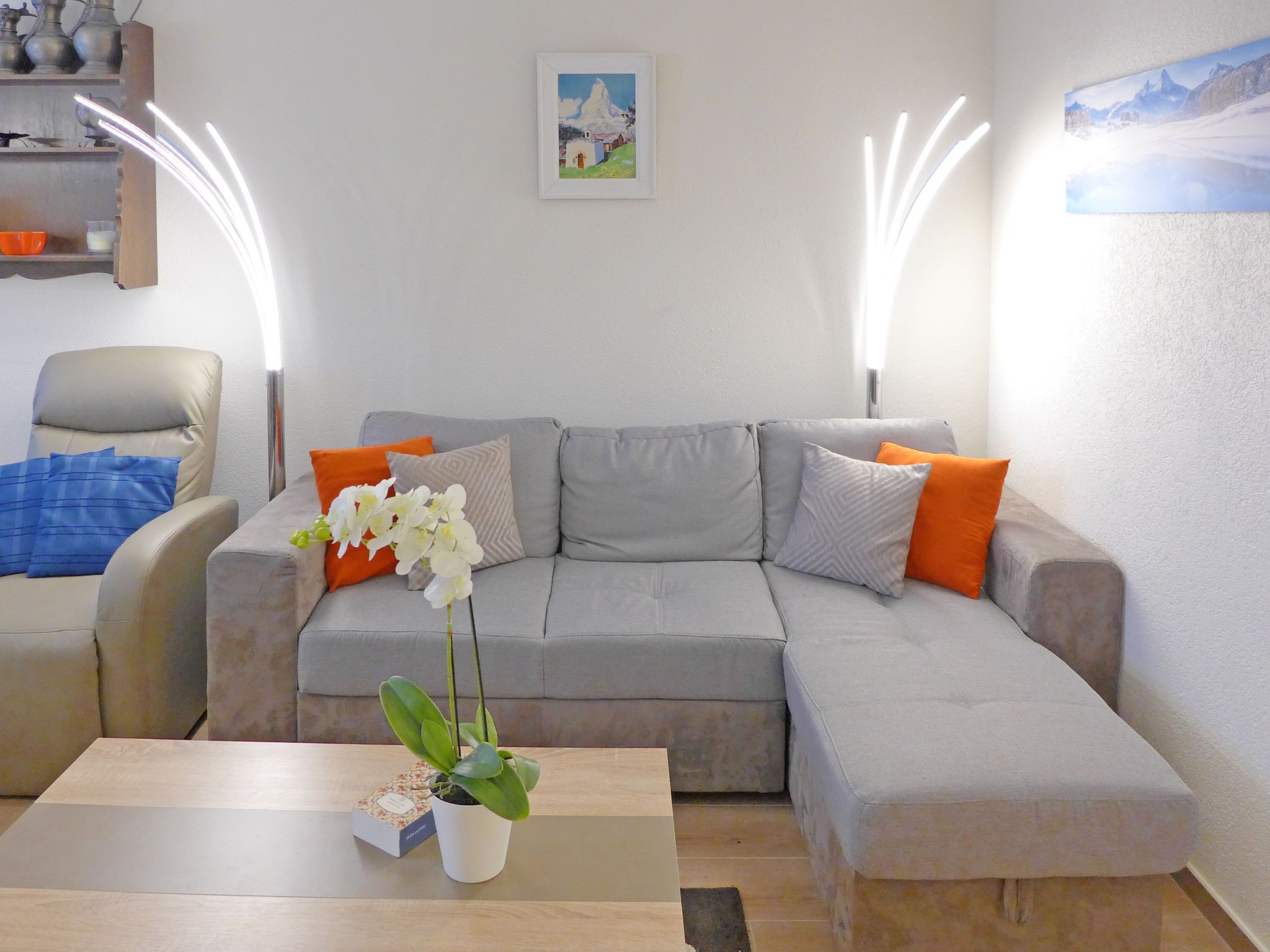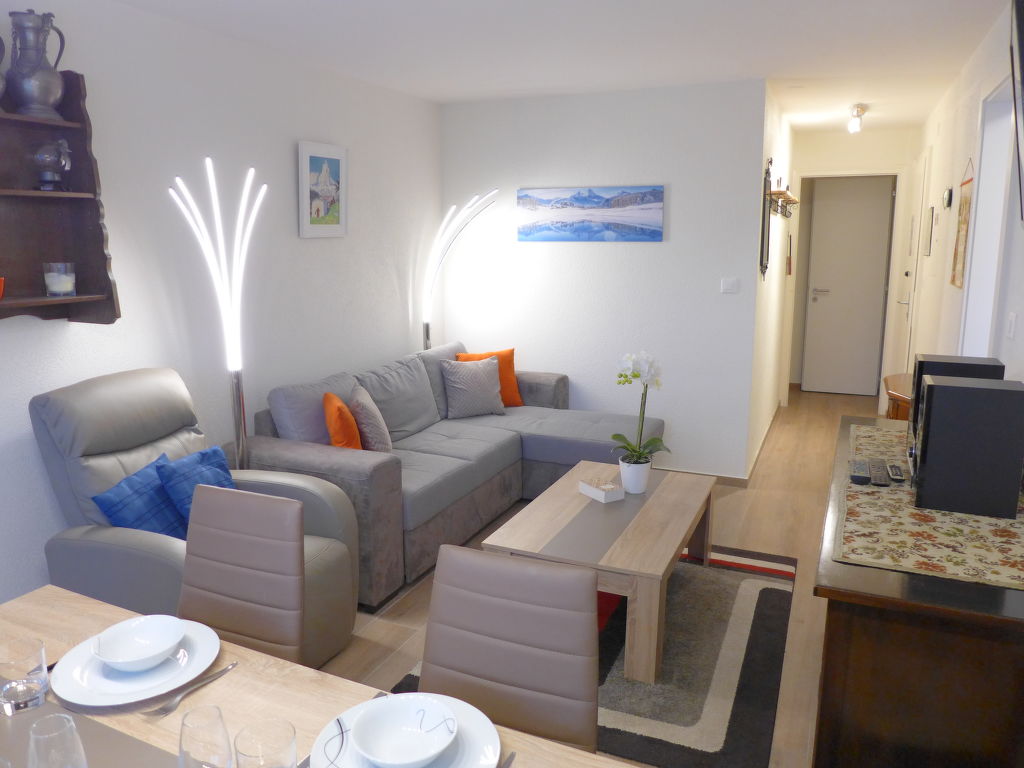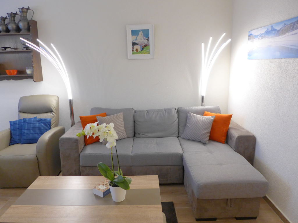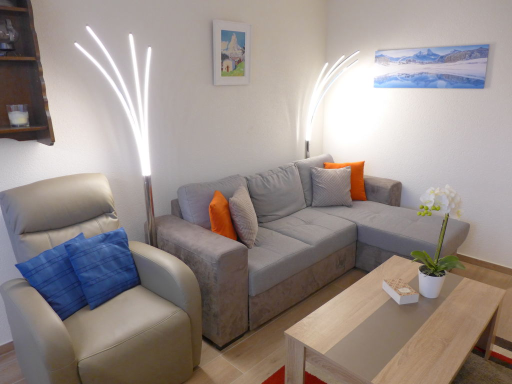 Barzettes-Vacances 553 / Entrée N° 14, 2-Zimmer-Wohnung 46 m2 im 3. Stock. Objekt geeignet für 2 Erwachsene + 1 Kind. Teilweise renoviert im Jahre 2017, komfortabel und schön eingerichtet: Wohn-/Esszimmer mit 1 Diwanbett (128 cm, Länge 180 cm), Kabel-TV (Flachbildschirm). Ausgang zum Balkon. 1 Zimmer, Richtung Nordwesten mit 1 franz. Bett (140 cm, Länge 200 cm). Küche (Backofen, Geschirrspüler, Toaster, Wasserkocher, elektrische Kaffeemaschine, Kapseln für die Kaffeemaschine (NESPRESSO) extra, Racletteofen, Fondue Set (Chinoise, Käse)). Dusche/WC. Kleiner Balkon, Südlage und Ostlage. Balkonmöbel. Seitliche Sicht auf die Berge. Zur Verfügung: Haartrockner. Internet (Wireless LAN, gratis). Bitte beachten: Nichtraucher-Unterkunft.