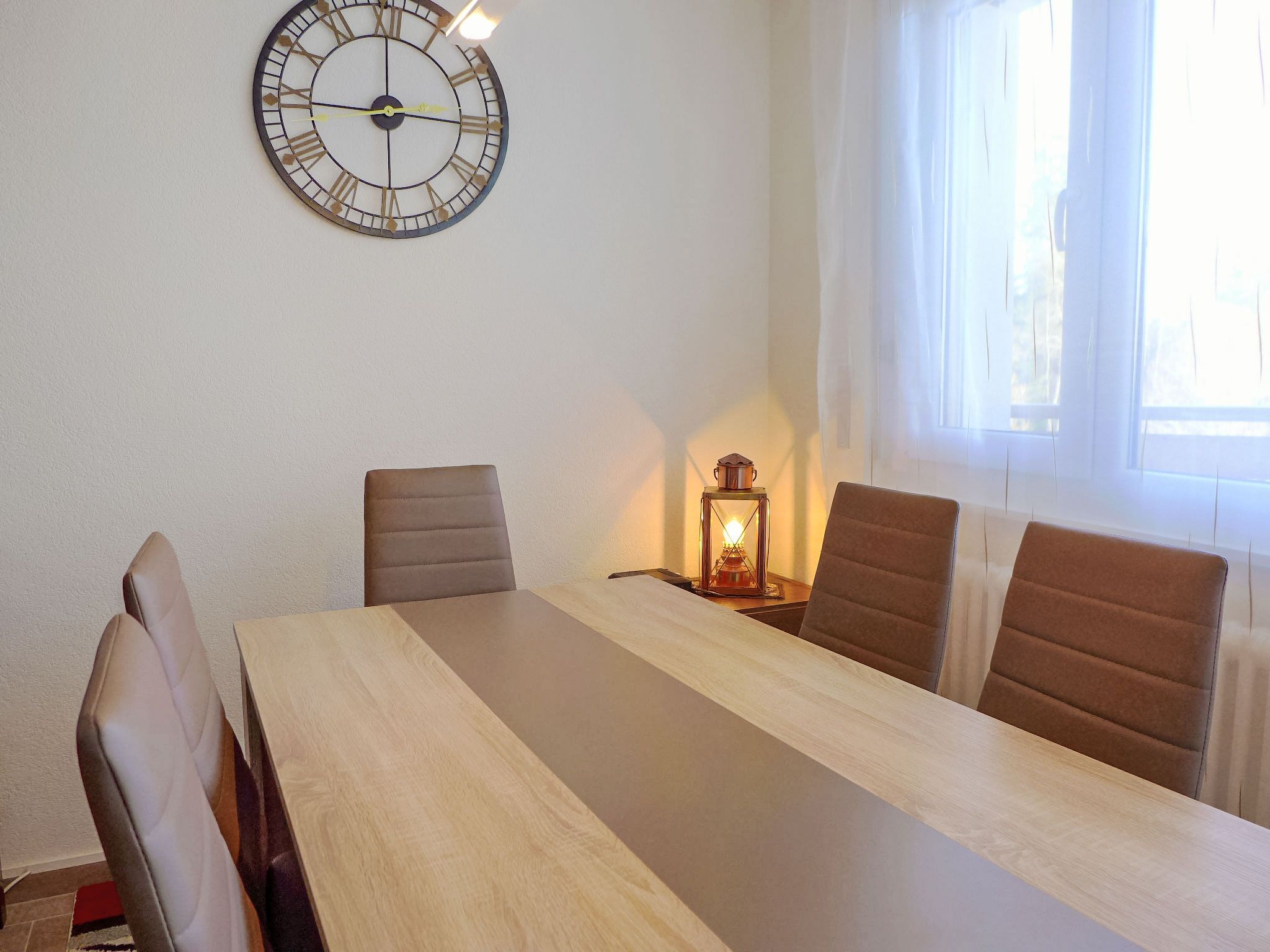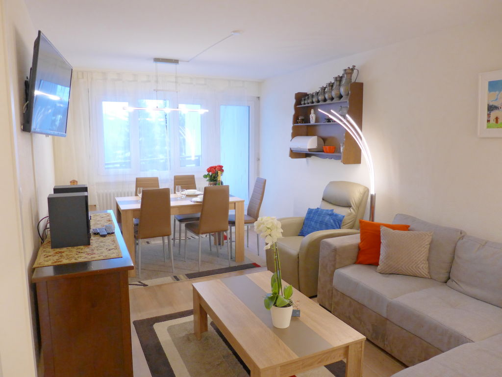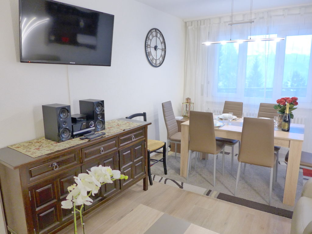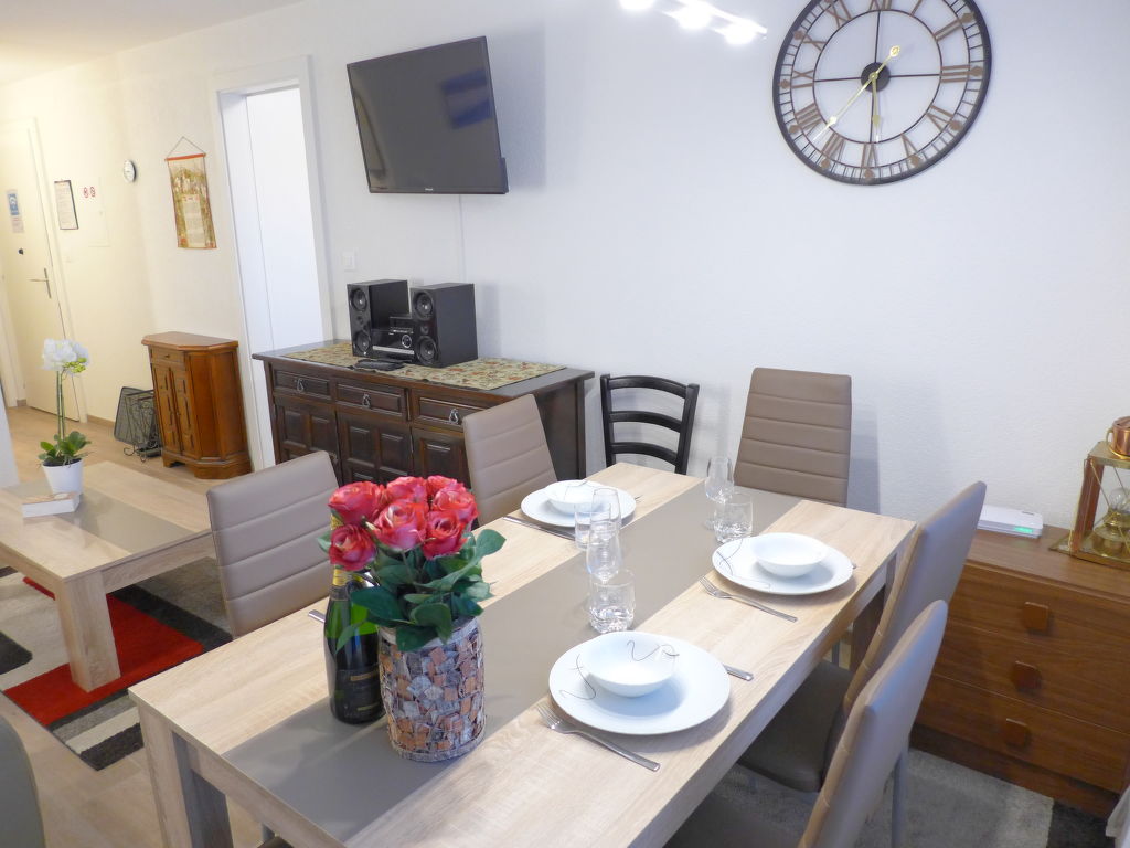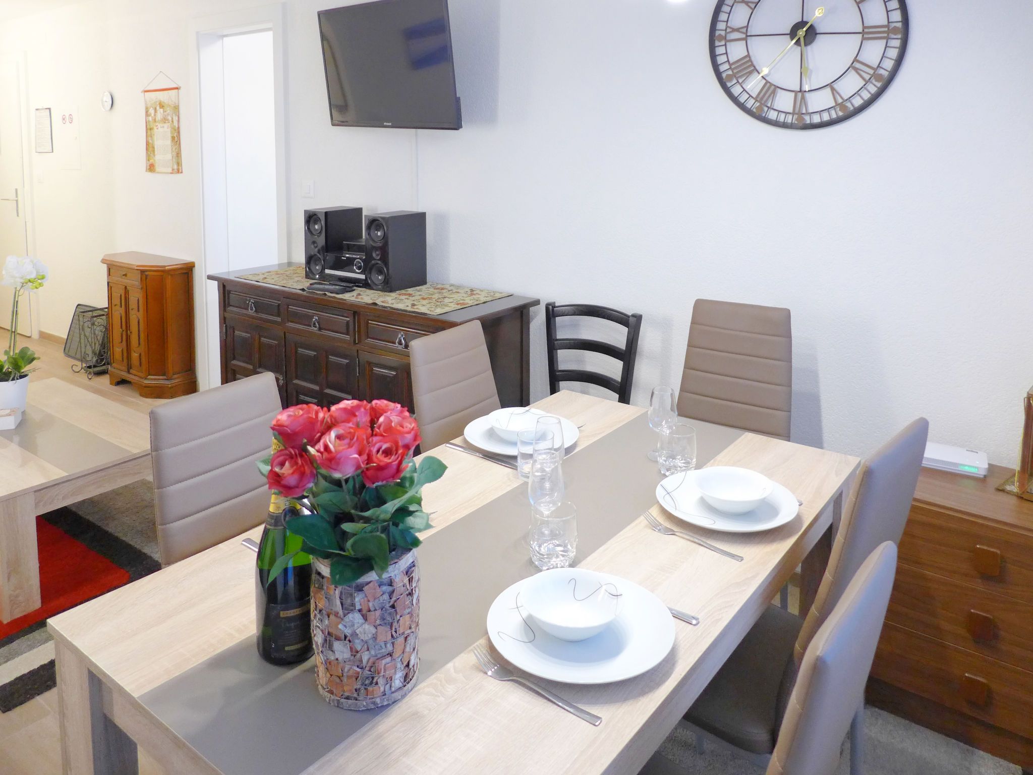Barzettes-Vacances 553 / Entrée N° 14, 2-Zimmer-Wohnung 46 m2 im 3. Stock. Objekt geeignet für 2 Erwachsene + 1 Kind. Teilweise renoviert im Jahre 2017, komfortabel und schön eingerichtet: Wohn-/Esszimmer mit 1 Diwanbett (128 cm, Länge 180 cm), Kabel-TV (Flachbildschirm). Ausgang zum Balkon. 1 Zimmer, Richtung Nordwesten mit 1 franz. Bett (140 cm, Länge 200 cm). Küche (Backofen, Geschirrspüler, Toaster, Wasserkocher, elektrische Kaffeemaschine, Kapseln für die Kaffeemaschine (NESPRESSO) extra, Racletteofen, Fondue Set (Chinoise, Käse)). Dusche/WC. Kleiner Balkon, Südlage und Ostlage. Balkonmöbel. Seitliche Sicht auf die Berge. Zur Verfügung: Haartrockner. Internet (Wireless LAN, gratis). Bitte beachten: Nichtraucher-Unterkunft.