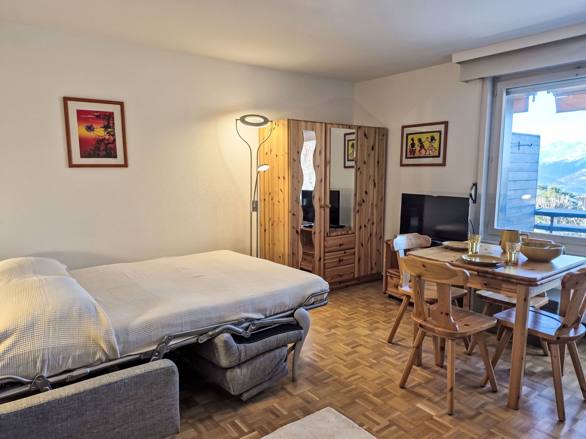 Cransalpin Apt. 3 / Secteur 1, 1-Zimmer-Wohnung 25 m2 im 1. Stock. Wohnzimmer mit 1 Diwanbett (140 cm, Länge 200 cm), Kabel-TV und Flachbildschirm. Küche (2 Kochplatten, Toaster, Wasserkocher, Mikrowelle, elektrische Kaffeemaschine, Kapseln für die Kaffeemaschine (Nespresso) extra, Fondue Set (Käse)). Dusche/WC. Balkon 7 m2, Südlage und Westlage. Terrassenmöbel. Schöne Sicht auf die Berge, das Tal und die Ortschaft. Zur Verfügung: Bügeleisen, Haartrockner. Internet (WLAN, gratis). Bitte beachten: Nichtraucher-Unterkunft.