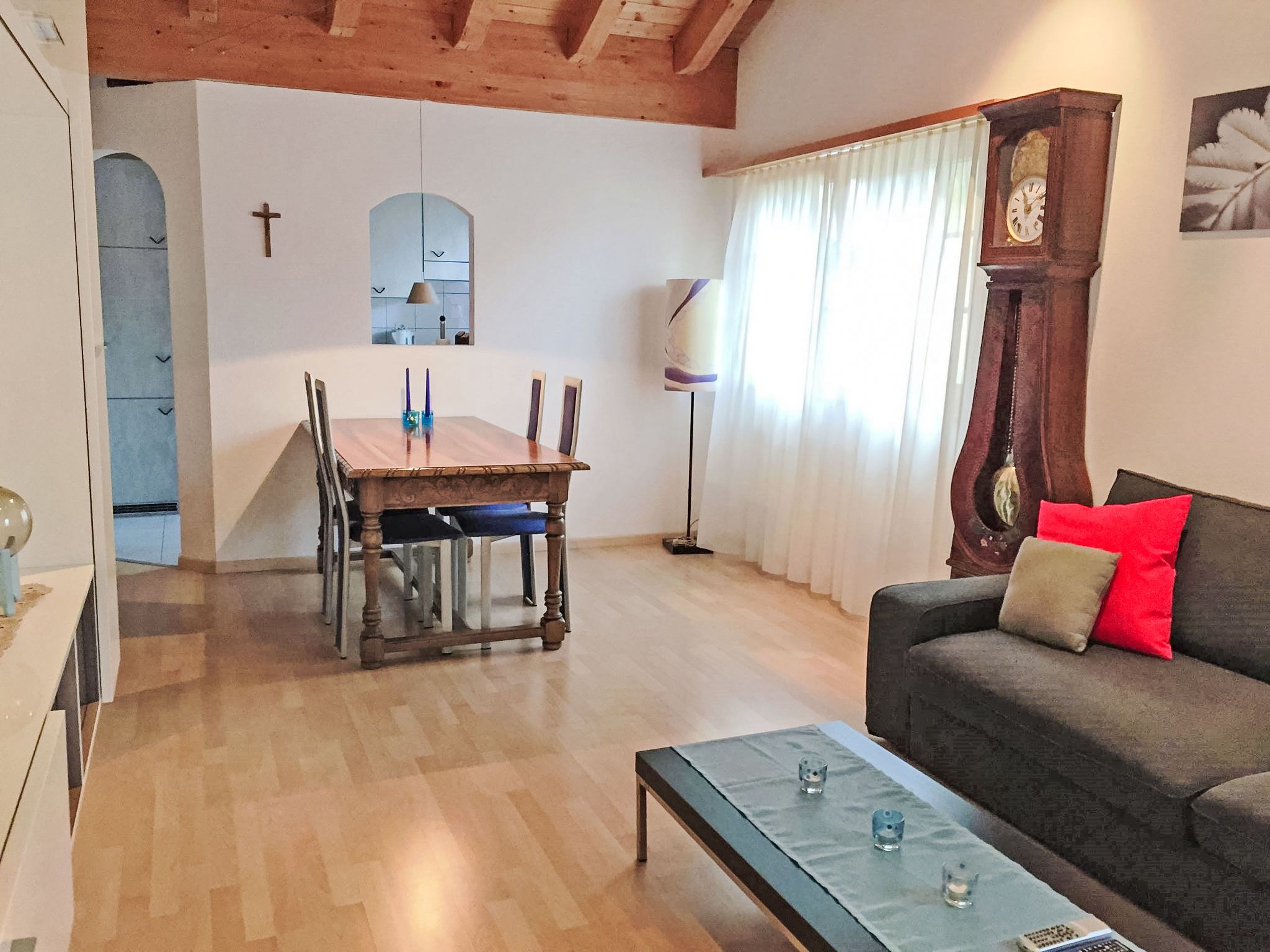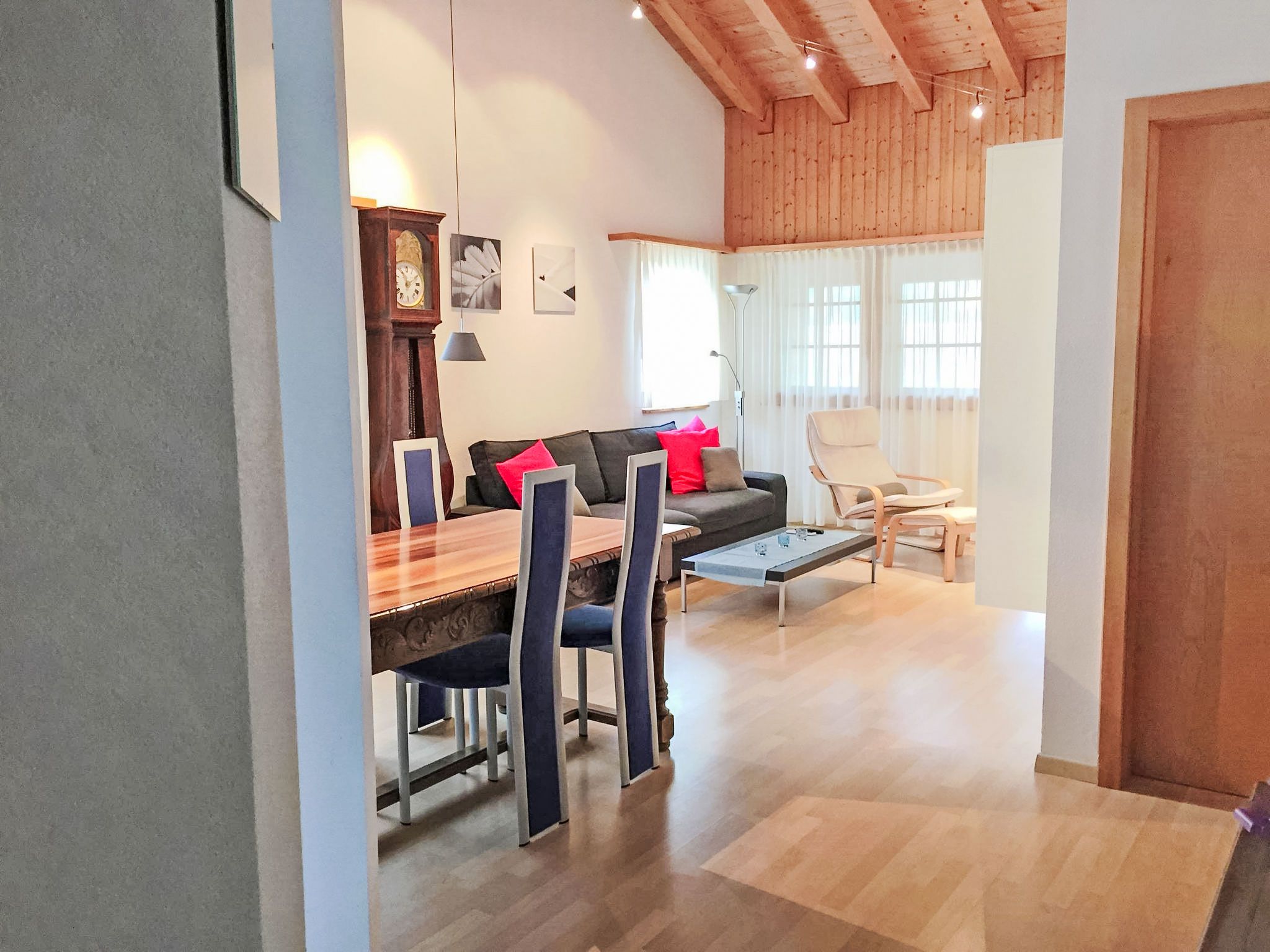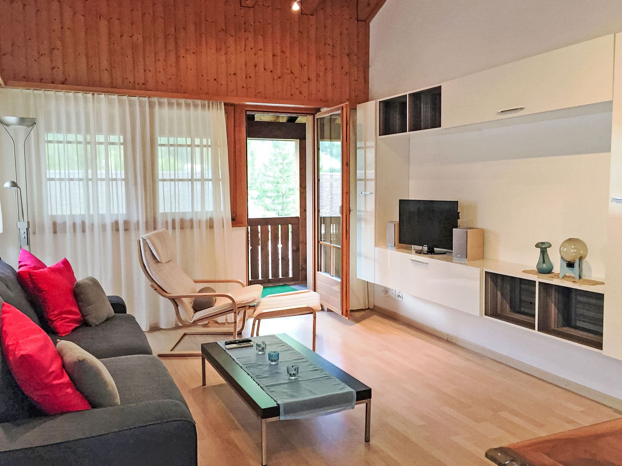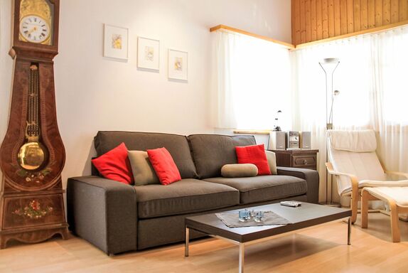 2-Zimmer-Wohnung 55 m2 im 3. Stock. Komfortabel und gemütlich eingerichtet: Wohn-/Esszimmer mit 1 Diwanbett, Sat-TV, Flachbildschirm und Stereoanlage. Ausgang zum Balkon. 1 Doppelzimmer mit 1 Doppelbett. Ausgang zum Balkon. Offene Küche (Backofen, 4 Glaskeramikplatten, Mikrowelle, elektrische Kaffeemaschine, Kapseln für die Kaffeemaschine (Nespresso) extra, Racletteofen, Fondue Set (Chinoise, Käse)). Bad/WC. Balkon. Terrassenmöbel, Liegestühle (1). Sehr schöne Sicht auf die Berge und die Landschaft. Zur Verfügung: Babybett. Internet (Wireless LAN, gratis). Parkplatz beim Haus. Bitte beachten: Nichtraucher-Unterkunft. Internet (Wireless LAN) schaltet um 23.00 Uhr aus und um 07.30h wieder an.