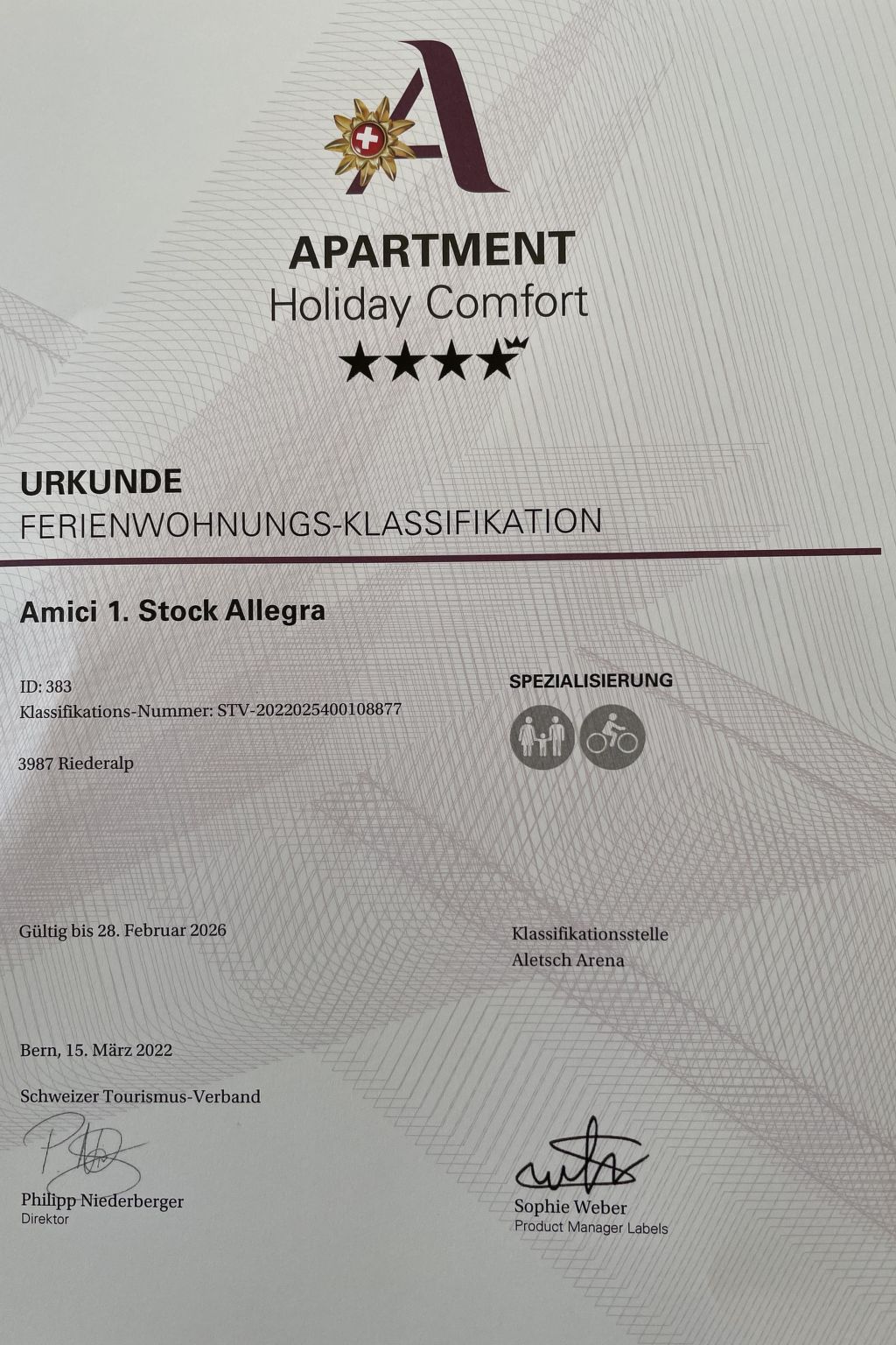 74 m2. Weitere Angaben des Anbieters: Das Haus Amici ist ein CO2-neutrales Minergie-Haus mit nachhaltiger Erdwärmeheizung und befindet sich in ausgezeichneter Lage auf der Riederalp-West, direkt neben der Kapelle und nur 50 Meter von der Sesselbahn Hohfluh entfernt. Im Winter bietet es einen optimalen Zugang zu den Skipisten, die direkt vor der Haustür starten und zurückkehren. Die Einkaufsmöglichkeit Prima sowie die Gondelbahn Mörel Riederalp-West sind nur 80 Meter entfernt. In der Nähe befinden sich zudem ein neuer Kinderspielplatz sowie der Golfplatz. Gäste haben gegen Gebühr Zugang zum umfangreichen Wellnessangebot des Golfhotels Riederhof, das rund 100 Meter entfernt liegt. Die Wohnung verfügt über zwei Doppelschlafzimmer mit Holzlaminatboden sowie einen stilvollen Wohn- und Essbereich mit Granitboden. Die Küche ist voll ausgestattet mit Glaskeramikkochfeld, Heissluftbackofen, Kühlschrank, Geschirrspüler, Mikrowelle und Nespresso-Maschine. Ein SAT-TV-Flachbildschirm im Wohnraum sowie ein weiterer im Schlafzimmer, eine PS4 und ein DAB/Internet-Radio sorgen für Unterhaltung. WLAN ist vorhanden. Das Badezimmer bietet eine Eckbadewanne mit direktem Zugang vom Elternschlafzimmer, zusätzlich gibt es eine separate Dusche mit WC. Zwei möblierte Balkone laden zum Verweilen ein. Einer mit Südausrichtung und herrlicher Aussicht, der andere mit Abendsonne. Ein grosszügiger Skiraum mit Skischuhheizung sowie ein separater Veloraum stehen zur Verfügung. Ein Lift ist vorhanden. Rauchen ist nur auf dem Balkon gestattet, Haustiere sind auf Anfrage erlaubt. Mietpreis exklusive: Kurtaxe, Endreinigung, Bett-, Frottier- und Küchenwäsche.