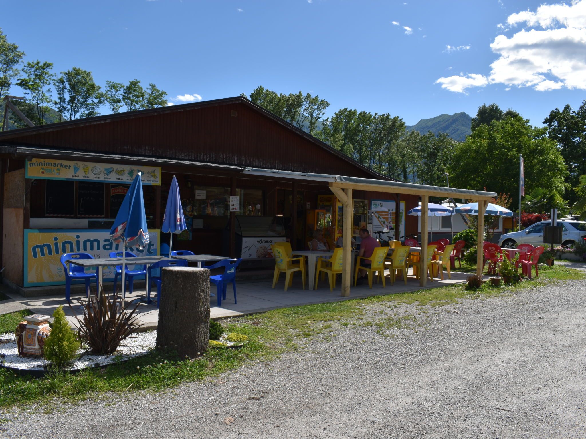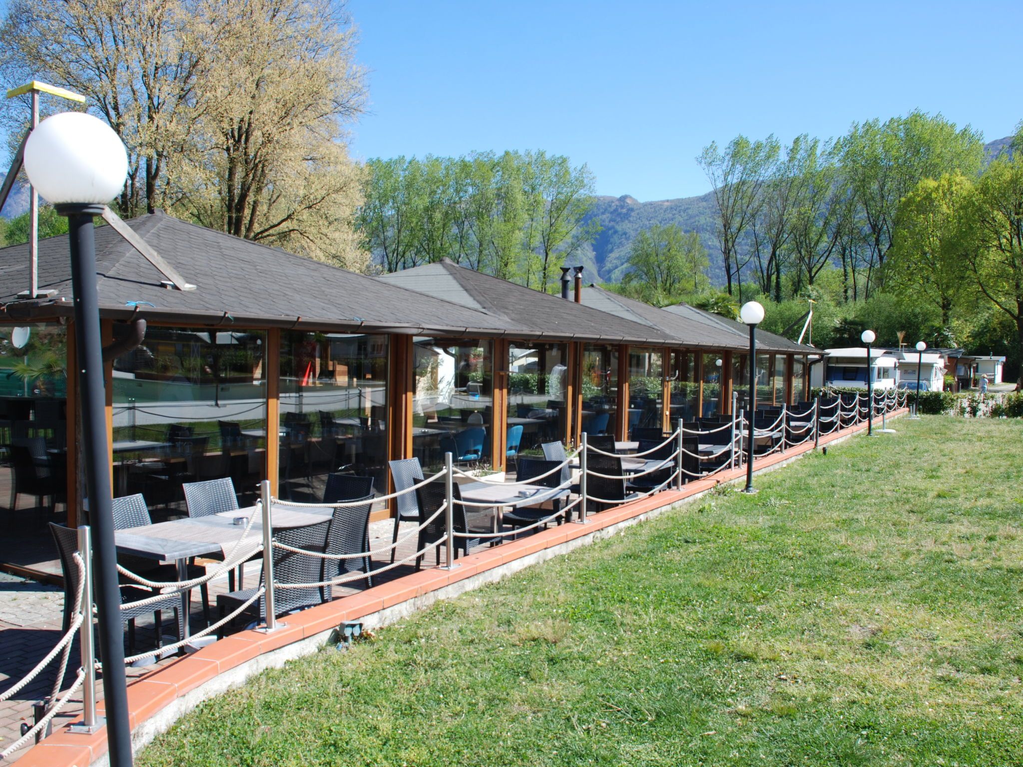 Gudo 16 km von Locarno: Moderner, gemütlicher Bungalow Isola, umgeben von Bäumen und Wiesen. 6 Häuser im Ferienresort. Am Ortsrand Gudo, sonnige Lage, im Grünen. Zur Mitbenutzung: naturbelassenes Grundstück, schöner, gepflegter Garten, Wiese, Schwimmbad eckig (24 x 12 m, 300 m2, 40 - 160 cm tief, saisonale Verfügbarkeit: 20.Mai. - 15.Okt.) mit Innentreppe. Aussendusche, Tischtennis, Kinderspielplatz. In der Anlage: Empfang, Restaurant, Aufenthaltsraum, Wireless LAN, Spielzimmer, Tischfussball, Einkaufsmöglichkeit, Kiosk, Einstellraum für Fahrräder, Zentralheizung. Frühstück und Halbpension möglich auf Anfrage (extra). Zufahrt bis zum Grundstück. Lebensmittelgeschäft 50 m, Supermarkt 4 km, Restaurant 50 m, Café, Bushaltestelle Linie 311 500 m, Bahnstation SBB- CFF Riazzino 4.4 km. Radweg 200 m. Nahe gelegene Sehenswürdigkeiten: Castelli di Bellinzona, Piazza Grande, Locarno, Ascona, Ronco sopra Ascona, Isole di Brissago, Cardada, Madonna del Sasso, Mercato Luino e Cannobio IT. Bekannte Seen in der Umgebung sind gut erreichbar: Lago Maggiore, Lago di Lugano, Lago di Como. Wandergebiete: Valle Verzasca, Centovalli, Vallemaggia. Bitte beachten: geeignet für Familien. Jugendgruppen nur auf Anfrage. In dieser Anlage zusätzlich mietbar: 5 Bungalows.