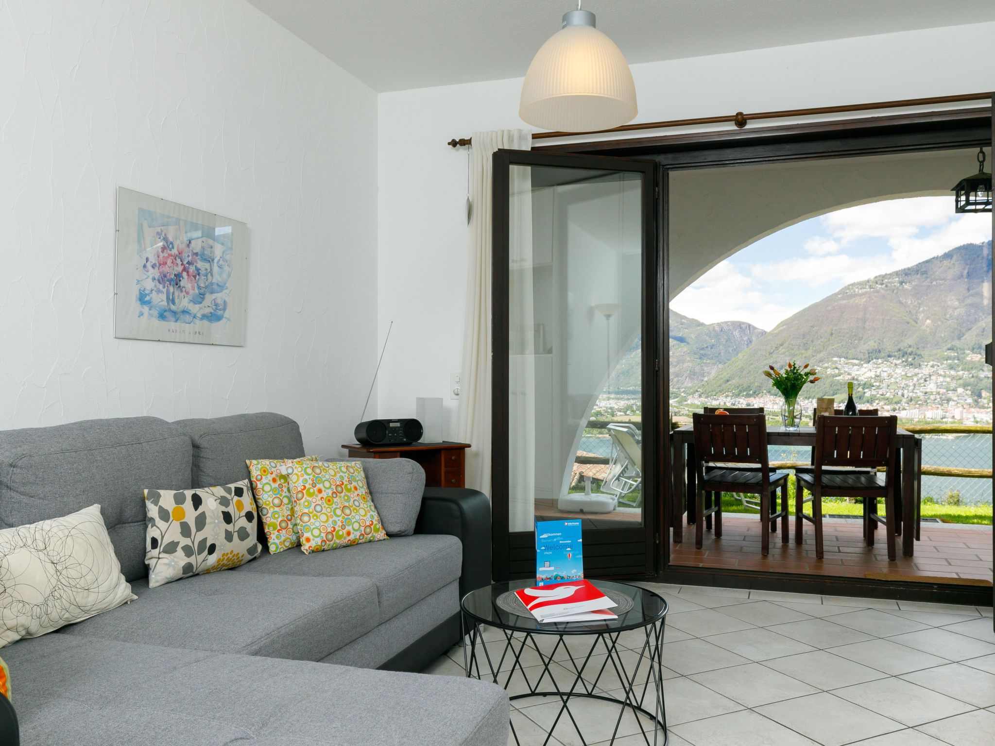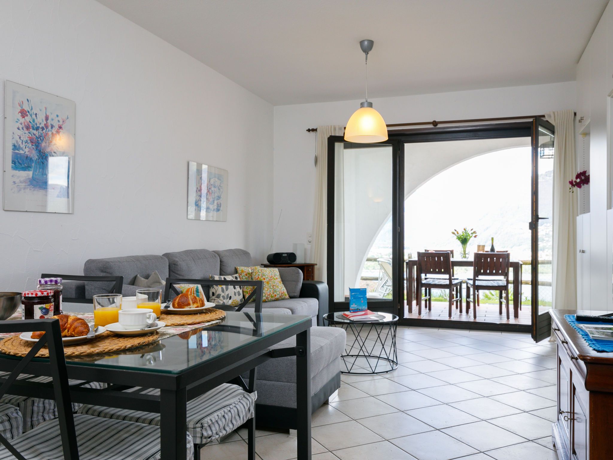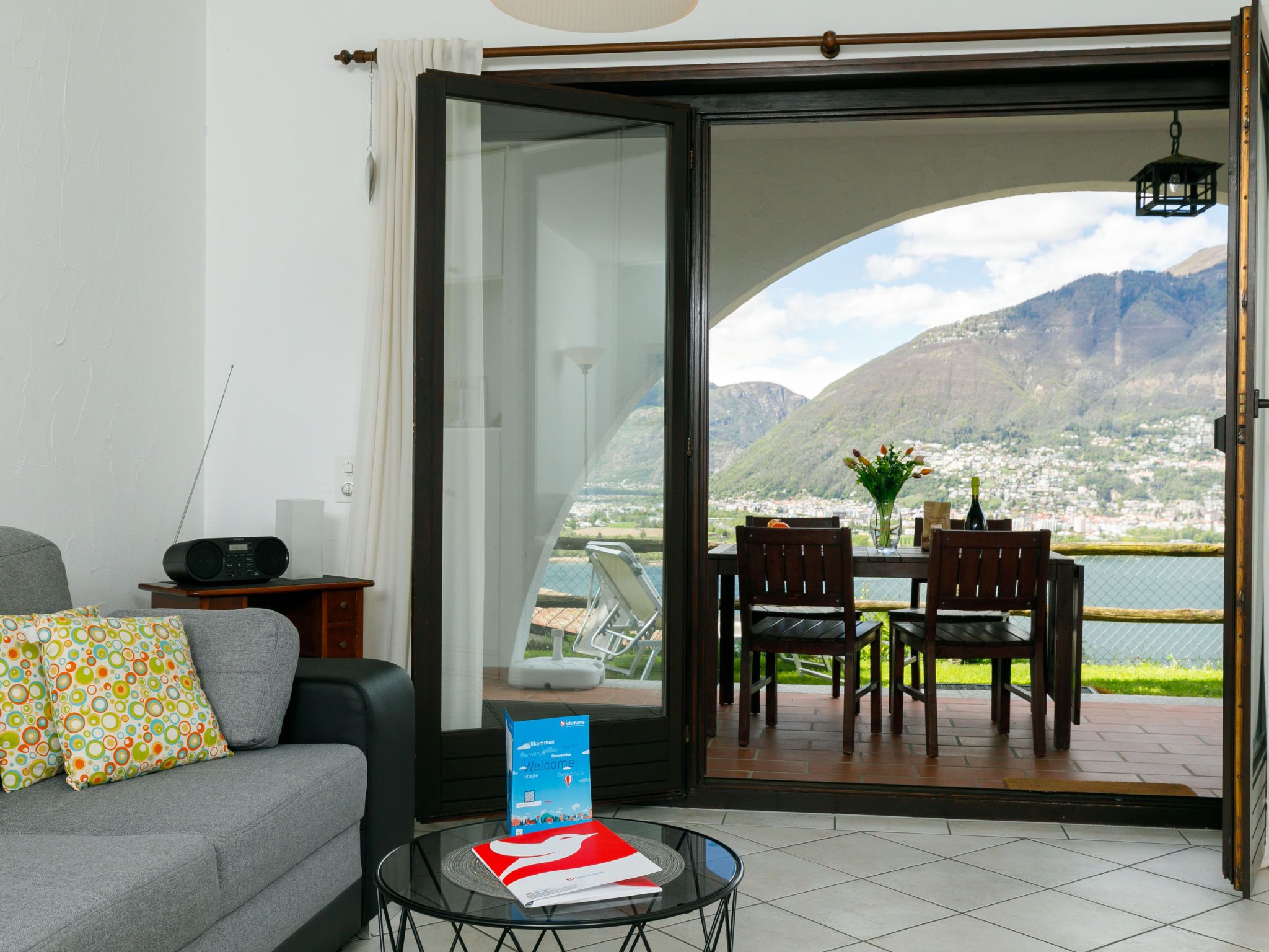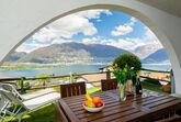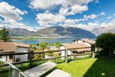 Residenza Miralago Apt. B13, 2-Zimmer-Wohnung 73 m2, Südwestlage. Hell, komfortabel und gemütlich eingerichtet: offenes Wohn-/Esszimmer mit Esstisch und Sat-TV (Flachbildschirm). Ausgang zur Terrasse. 1 Zimmer mit 2 Betten (90 cm, Länge 200 cm). Ausgang zur Terrasse. Kleine Küche (4 Kochplatten, Backofen). Dusche/WC. Heizung. Gartensitzplatz teilweise überdacht, Südlage und Westlage. Terrassenmöbel. Sehr schöne Panoramasicht auf den See, die Berge und die Landschaft. Bitte beachten: Nichtraucher-Unterkunft. NL-