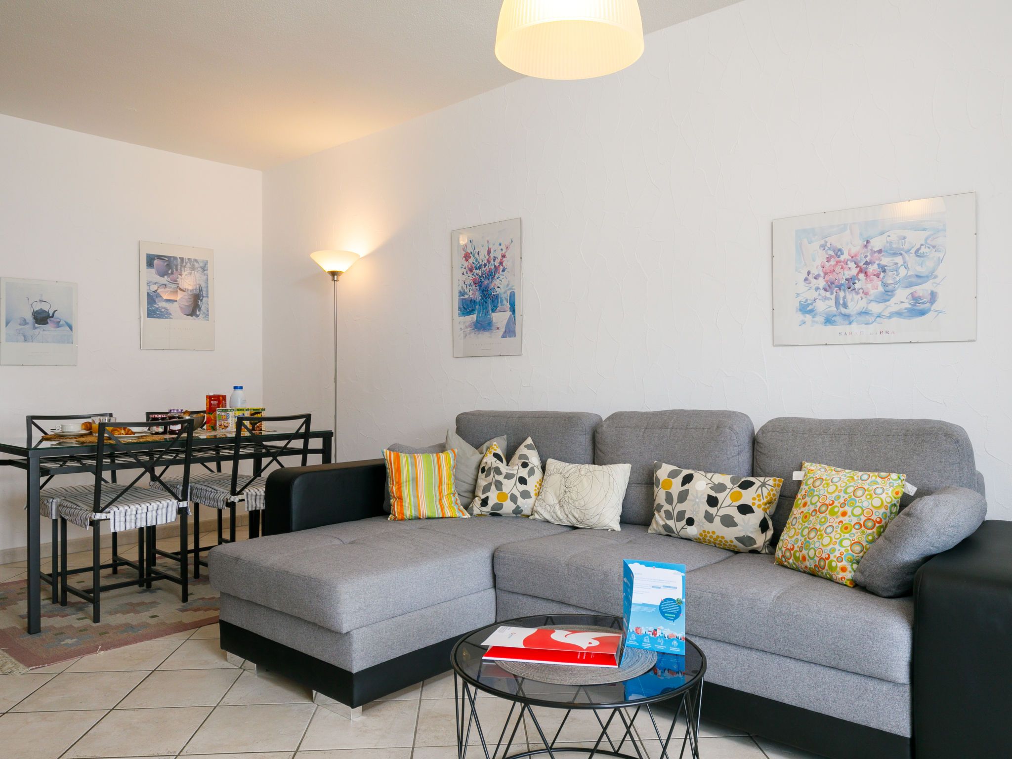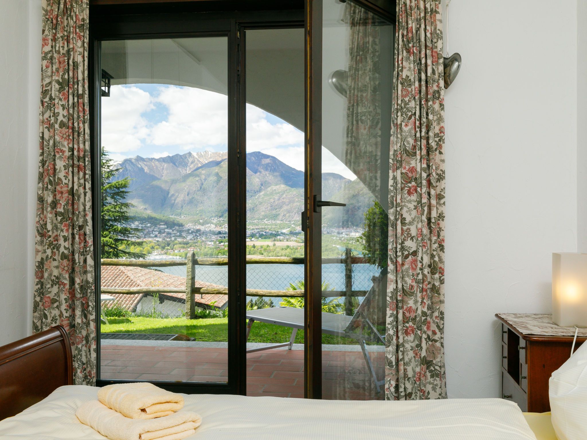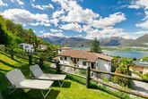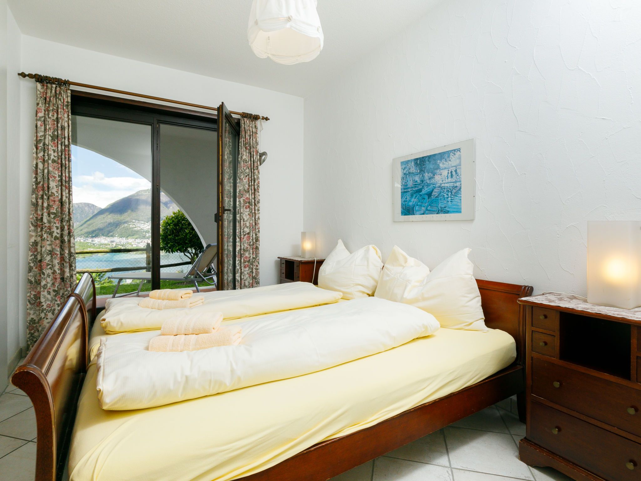 Residenza Miralago Apt. B13, 2-Zimmer-Wohnung 73 m2, Südwestlage. Hell, komfortabel und gemütlich eingerichtet: offenes Wohn-/Esszimmer mit Esstisch und Sat-TV (Flachbildschirm). Ausgang zur Terrasse. 1 Zimmer mit 2 Betten (90 cm, Länge 200 cm). Ausgang zur Terrasse. Kleine Küche (4 Kochplatten, Backofen). Dusche/WC. Heizung. Gartensitzplatz teilweise überdacht, Südlage und Westlage. Terrassenmöbel. Sehr schöne Panoramasicht auf den See, die Berge und die Landschaft. Bitte beachten: Nichtraucher-Unterkunft. NL-