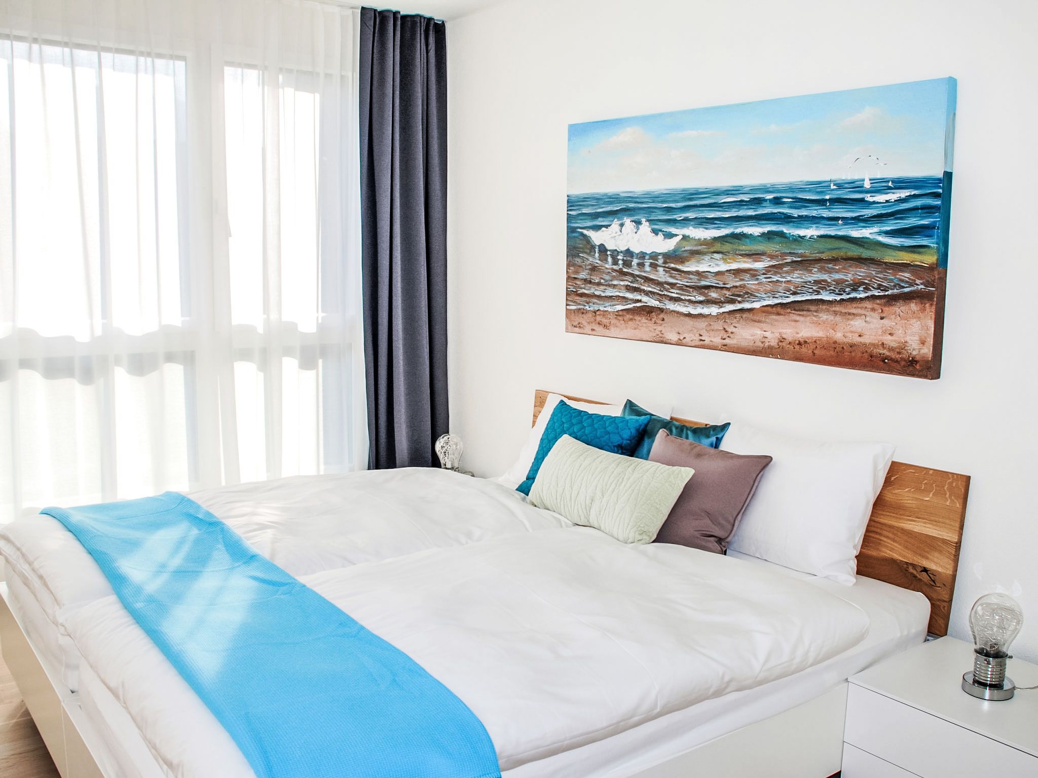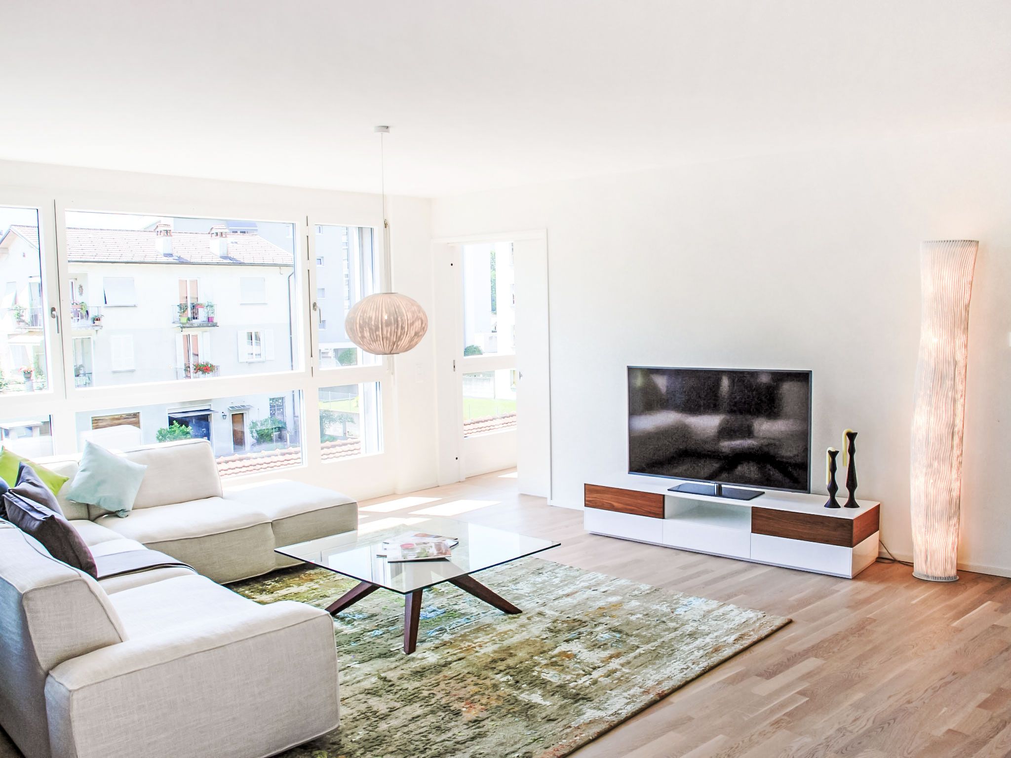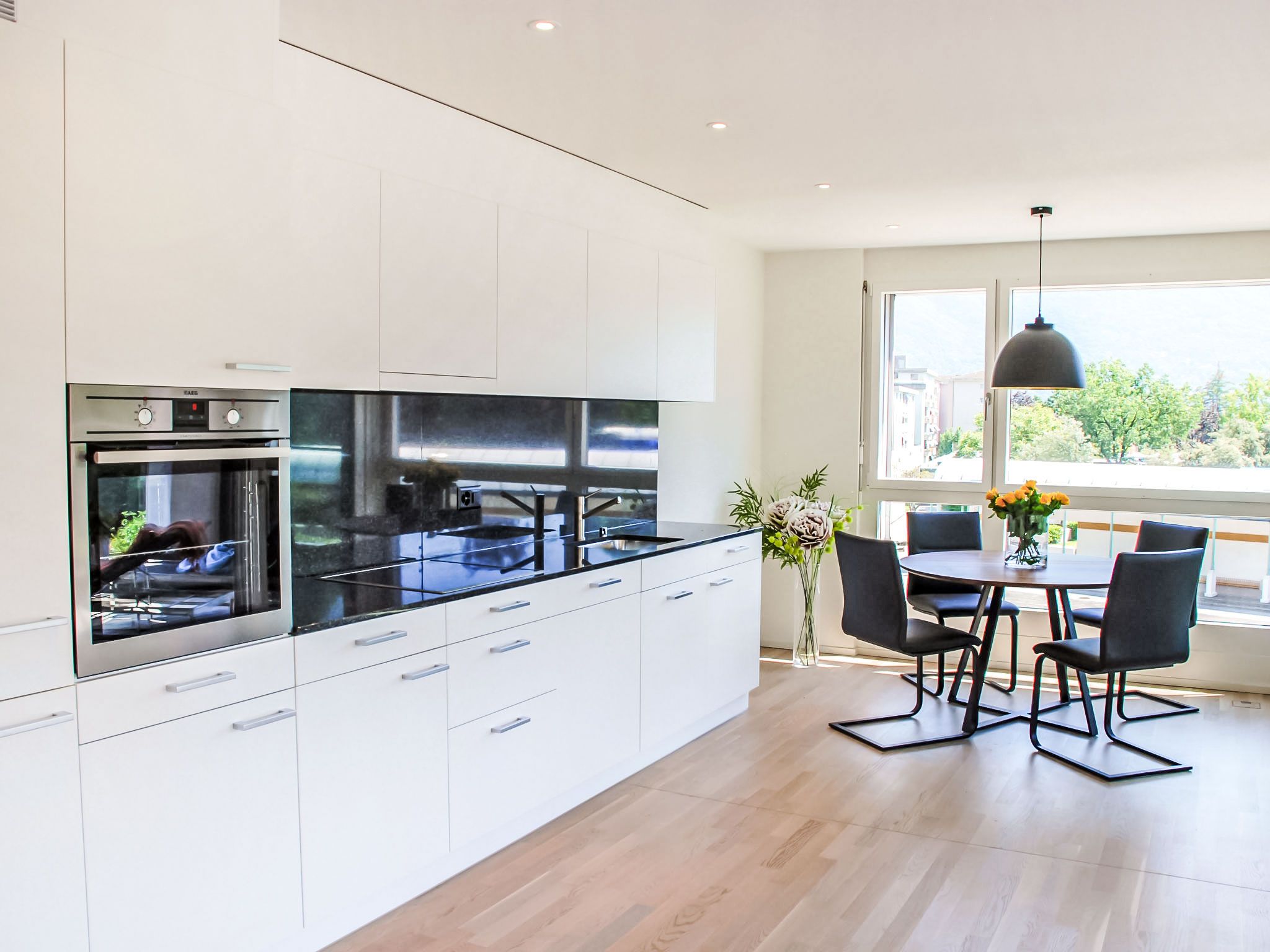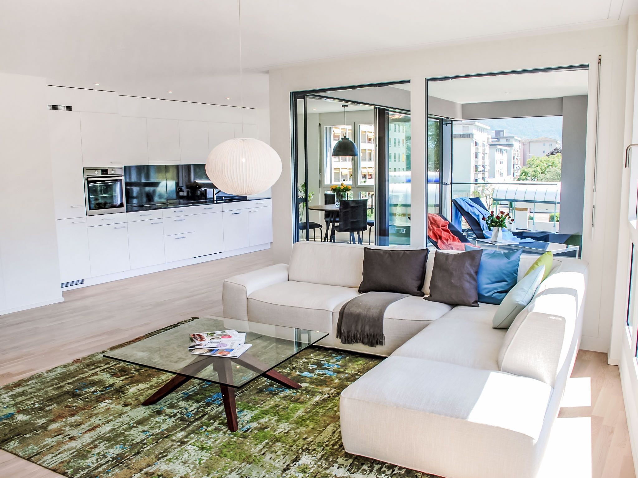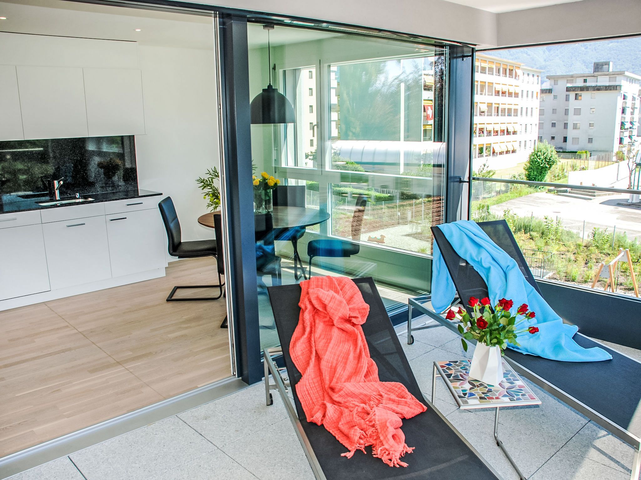LaVille B-2-3, 3-Zimmer-Wohnung 95 m2 im 2. Stock, Südwestlage. Geräumig und hell, modern und geschmackvoll eingerichtet: offenes grosses Wohn-/Esszimmer mit Sat-TV und Flachbildschirm. 1 Doppelzimmer mit 1 Doppelbett (2 x 90 cm, Länge 200 cm). 1 Zimmer mit 2 Betten (90 cm, Länge 200 cm). Grosse, offene Küche (Backofen, Geschirrspüler, 4 Induktionskochplatten, Tiefkühler, elektrische Kaffeemaschine, Kapseln für die Kaffeemaschine (Nespresso) extra) mit Esstisch. Ausgang zum Balkon. Bad/WC, Dusche/WC. Bodenheizung. Balkon 12 m2, Südlage und Westlage. Balkonmöbel, Liegestühle (1). Sicht auf die Berge und die Landschaft. Zur Verfügung: Waschmaschine, Wäschetrockner, Bügeleisen, Kinderhochstuhl, Babybett bis 2 Jahre (extra), Haartrockner. Internet (WLAN, gratis). Parkplatz Nr. 46 (extra), Höhe 210 cm, Breite 230 cm. Bitte beachten: Nichtraucher-Unterkunft. NL-