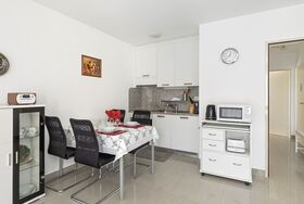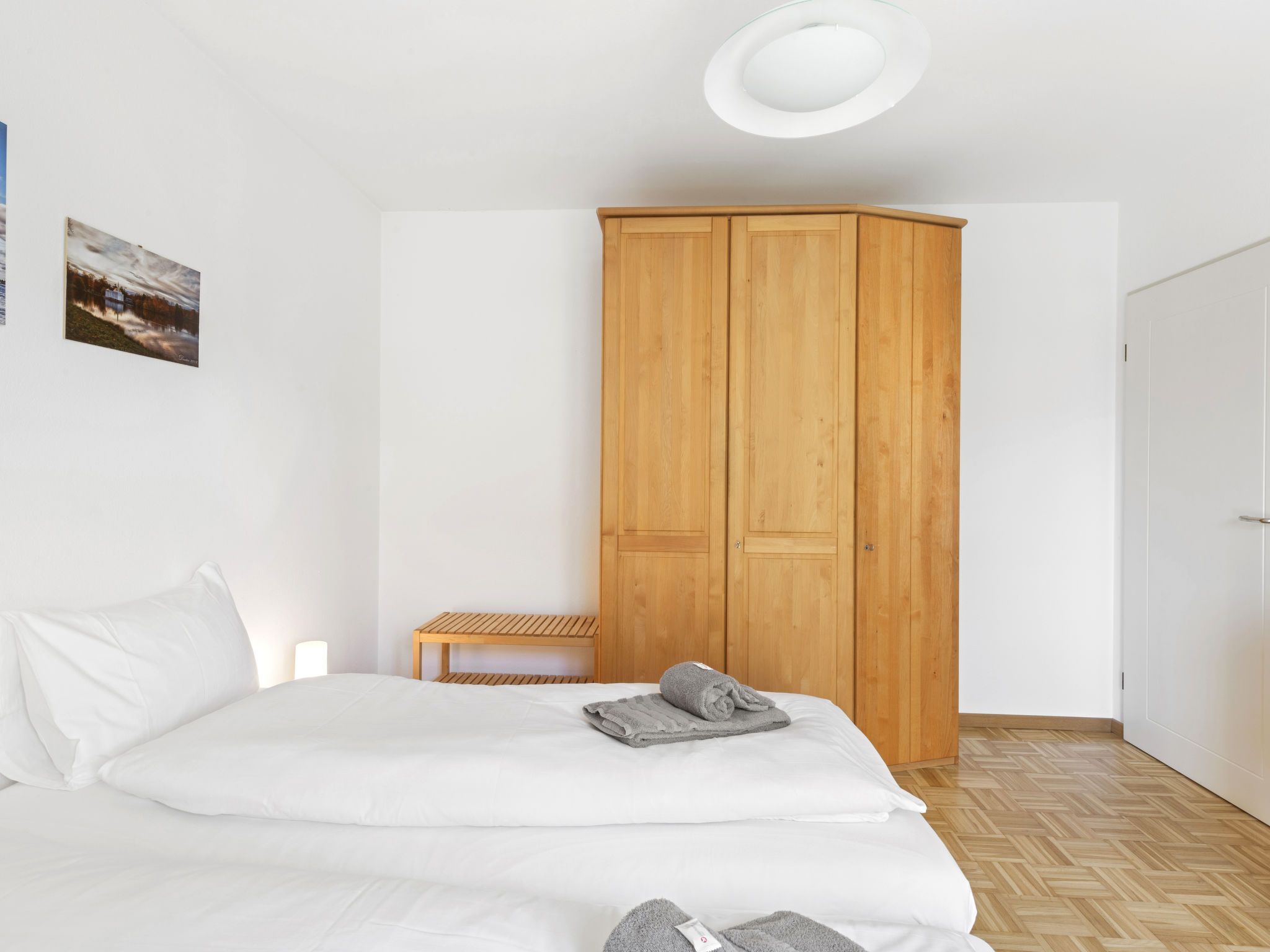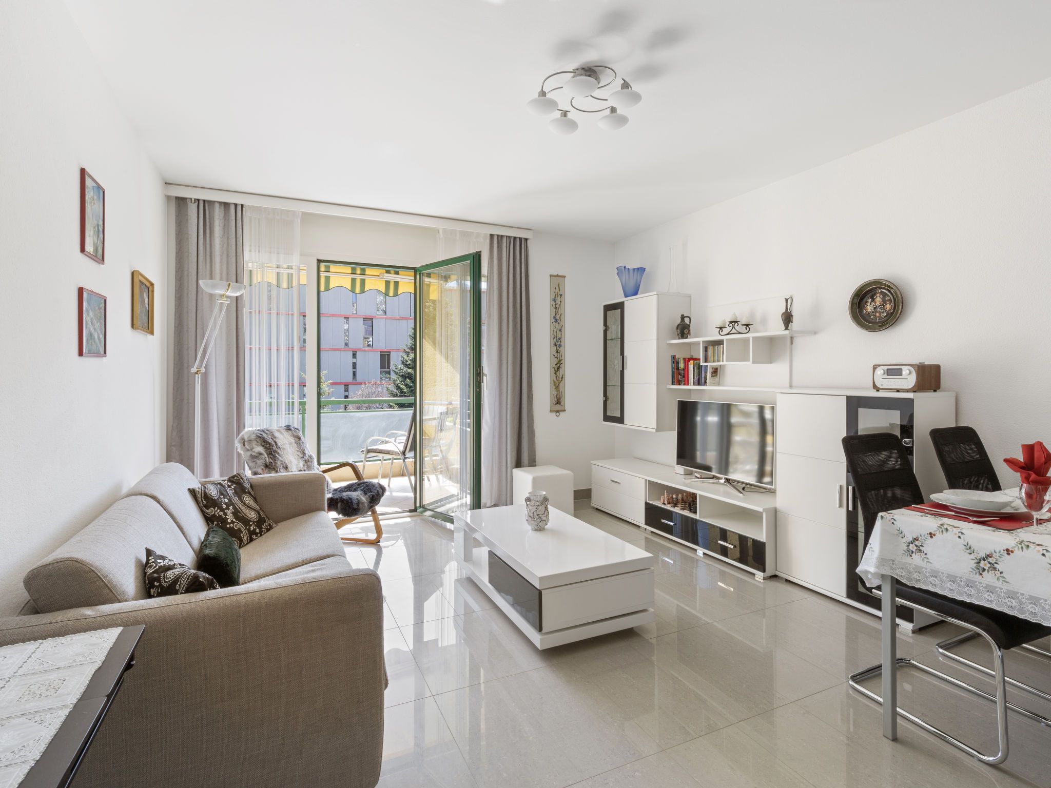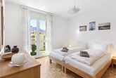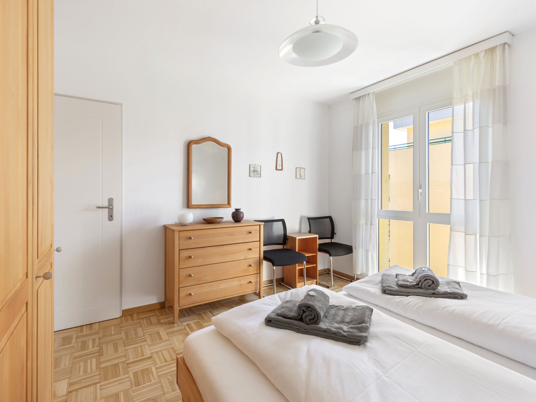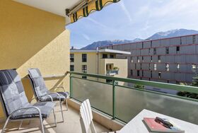 Robinia-City, 2-Zimmer-Wohnung 45 m2 im 4. Stock, Südwestlage. Hell, komfortabel und gemütlich eingerichtet: offenes Wohn-/Esszimmer mit Esstisch und Kabel-TV (Flachbildschirm), Radio. Ausgang zum Balkon. 1 Doppelzimmer mit 1 Doppelbett (2 x 90 cm, Länge 200 cm). Kleine, offene Küche (Backofen, 4 Glaskeramikplatten, Toaster, Wasserkocher, Mikrowelle, elektrische Kaffeemaschine, Kapseln für die Kaffeemaschine (Delizia) extra, Racletteofen, Fondue Set (Käse)). Dusche/WC. Bodenheizung. Balkon. Balkonmöbel, Liegestühle (1). Schöne Sicht auf die Berge, den Garten, die Landschaft und die Ortschaft. Zur Verfügung: Bügeleisen, Kinderhochstuhl, Babybett bis 2 Jahre (extra), Haartrockner. Internet (WLAN, gratis). Parkplatz Nr. 6. Bitte beachten: Nichtraucher-Unterkunft. Maximal 1 Haustier/Hund erlaubt. NL-