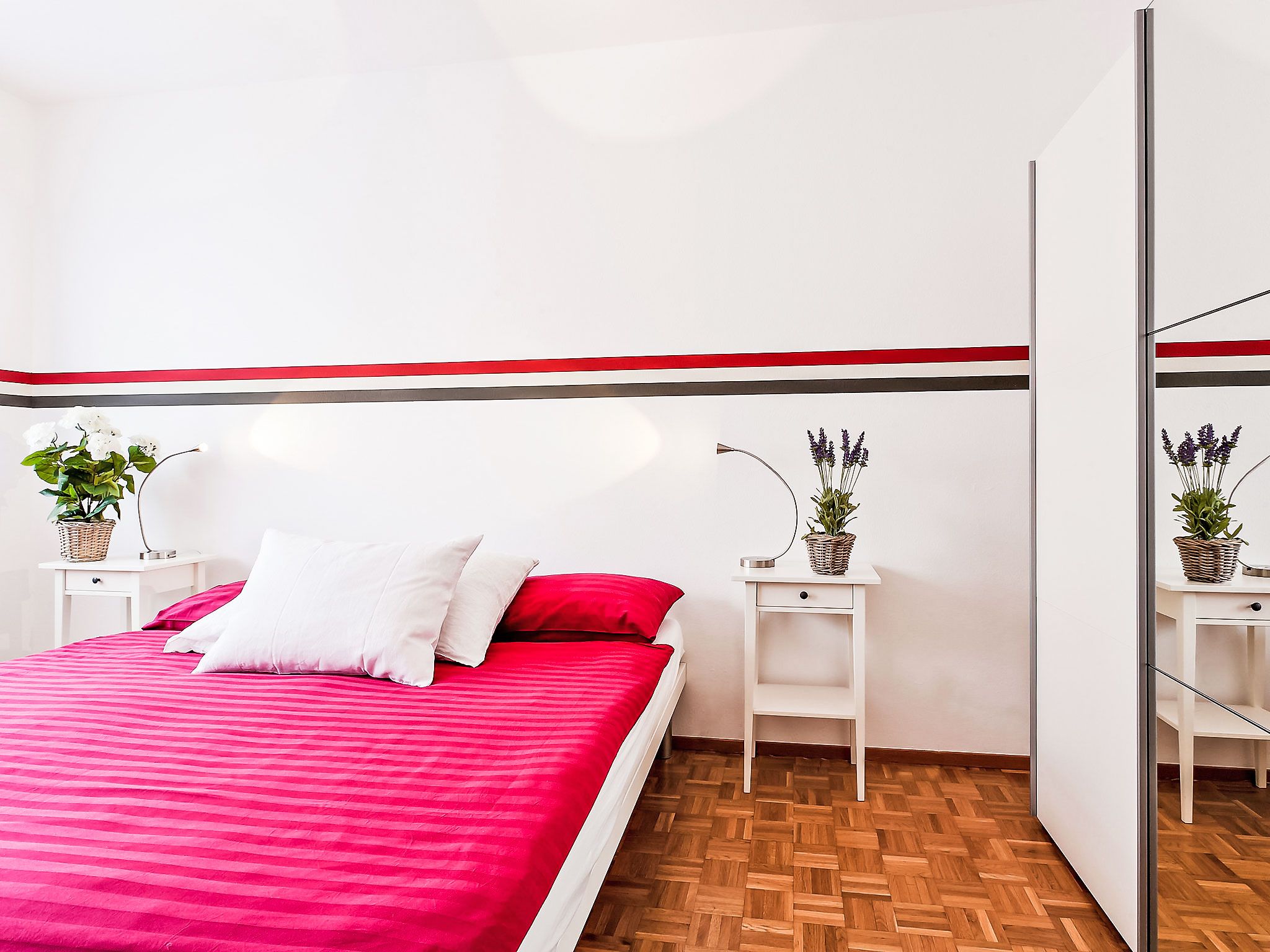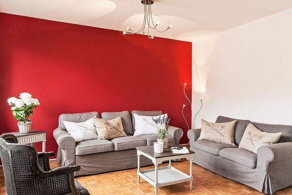 Large Suite, 3-Zimmer-Wohnung 80 m2 im 2. Stock, Westlage. Zweckmässig eingerichtet: Wohn-/Esszimmer mit 1 Diwanbett (160 cm, Länge 200 cm), offenem Kamin, Sat-TV und Radio. 1 Zimmer mit 2 Betten (90 cm, Länge 200 cm). 1 Doppelzimmer mit 2 Betten (90 cm, Länge 200 cm). Küche (4 Kochplatten, Backofen, Geschirrspüler, elektrische Kaffeemaschine, Kapseln für die Kaffeemaschine (Nespresso) extra). Bad/WC, sep. WC. Warmluftheizung. Balkon, Westlage. Terrassenmöbel. Zur Verfügung: Internet (Wireless LAN, gratis). Bitte beachten: Nichtraucher-Unterkunft. Maximal 1 Haustier/Hund erlaubt. NL-