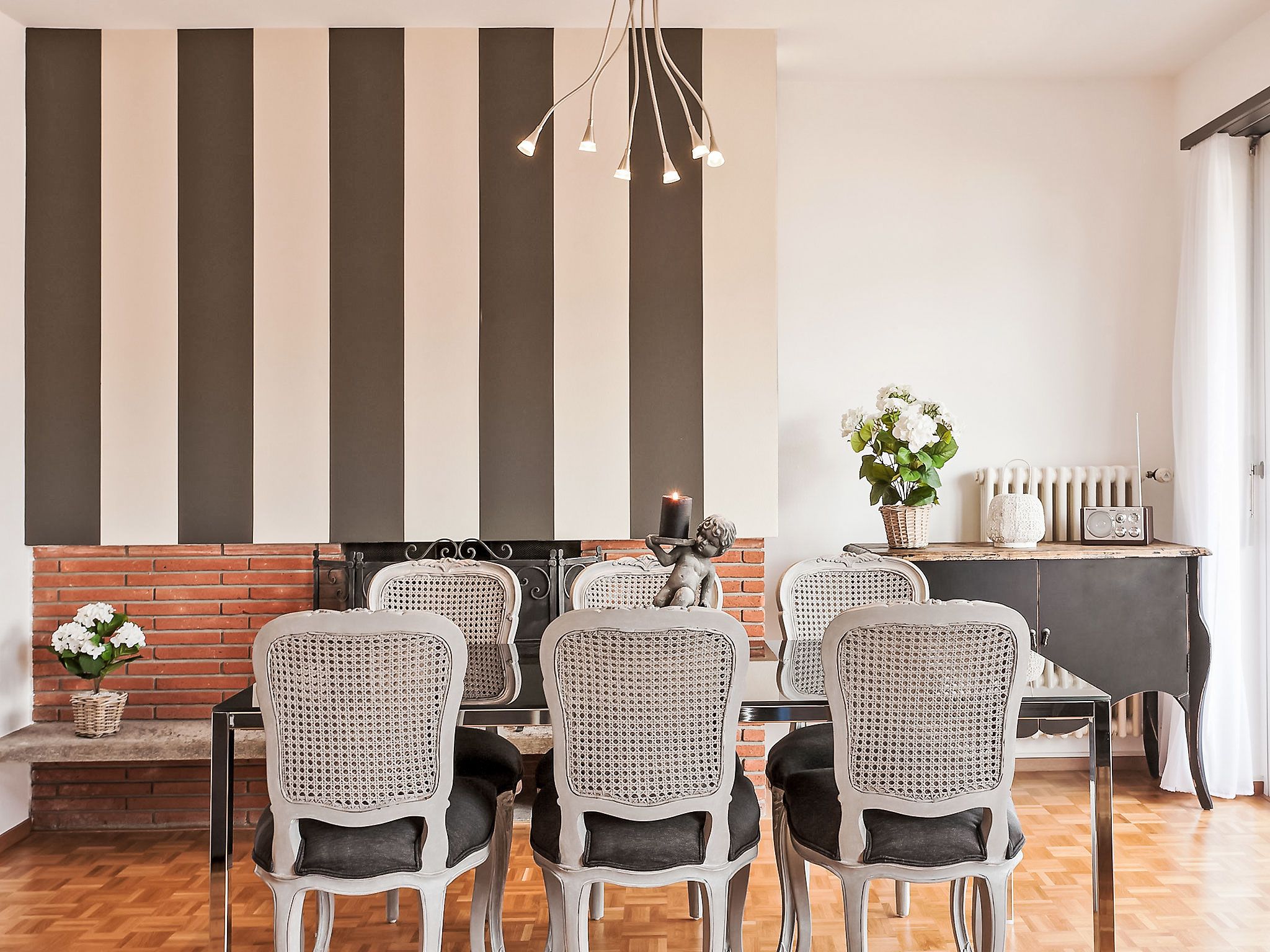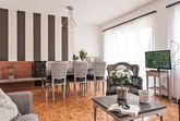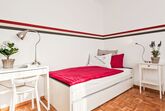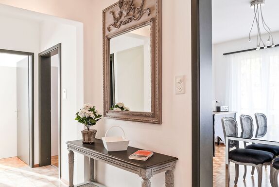 Large Suite, 3-Zimmer-Wohnung 80 m2 im 3. Stock, Westlage. Zweckmässig eingerichtet: Wohn-/Esszimmer mit 1 Diwanbett (160 cm, Länge 200 cm), offenem Kamin, Sat-TV und Radio. 1 Zimmer mit 2 Betten (90 cm, Länge 200 cm). 1 Doppelzimmer mit 2 Betten (90 cm, Länge 200 cm). Küche (4 Kochplatten, Backofen, Geschirrspüler, elektrische Kaffeemaschine, Kapseln für die Kaffeemaschine (Nespresso) extra). Bad/WC, sep. WC. Warmluftheizung. Balkon, Westlage. Terrassenmöbel. Eingeschränkte Sicht. Zur Verfügung: Internet (Wireless LAN, gratis). Bitte beachten: Nichtraucher-Unterkunft. Maximal 1 Haustier/Hund erlaubt. NL-