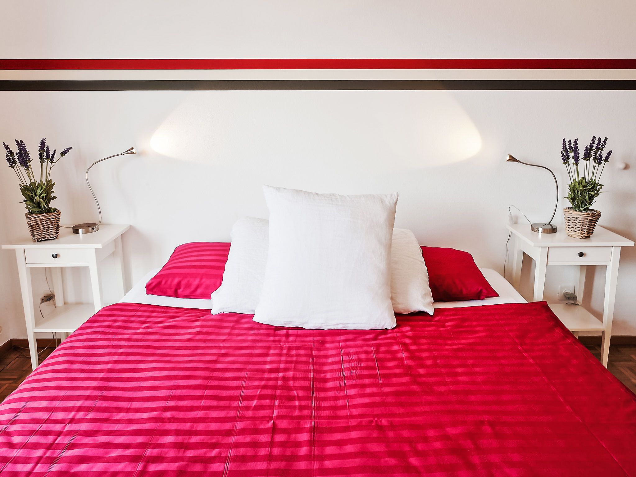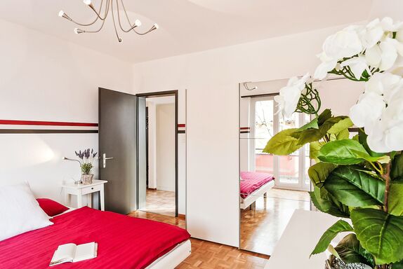 Penthouse Suite, 4-Zimmer-Wohnung 95 m2 im 4. Stock. Zweckmässig eingerichtet: Wohn-/Esszimmer mit Sat-TV und Radio. 1 Zimmer mit 2 Betten (90 cm, Länge 200 cm). 2 Doppelzimmer, jedes Zimmer mit 2 Betten (90 cm, Länge 200 cm). Küche (4 Kochplatten, Backofen, Geschirrspüler, elektrische Kaffeemaschine, Kapseln für die Kaffeemaschine (Nespresso) extra). Bad/WC, sep. WC. Warmluftheizung. Balkon, Westlage. Terrassenmöbel. Sicht. Zur Verfügung: Internet (Wireless LAN, gratis). Bitte beachten: Nichtraucher-Unterkunft. Maximal 1 Haustier/Hund erlaubt. NL-