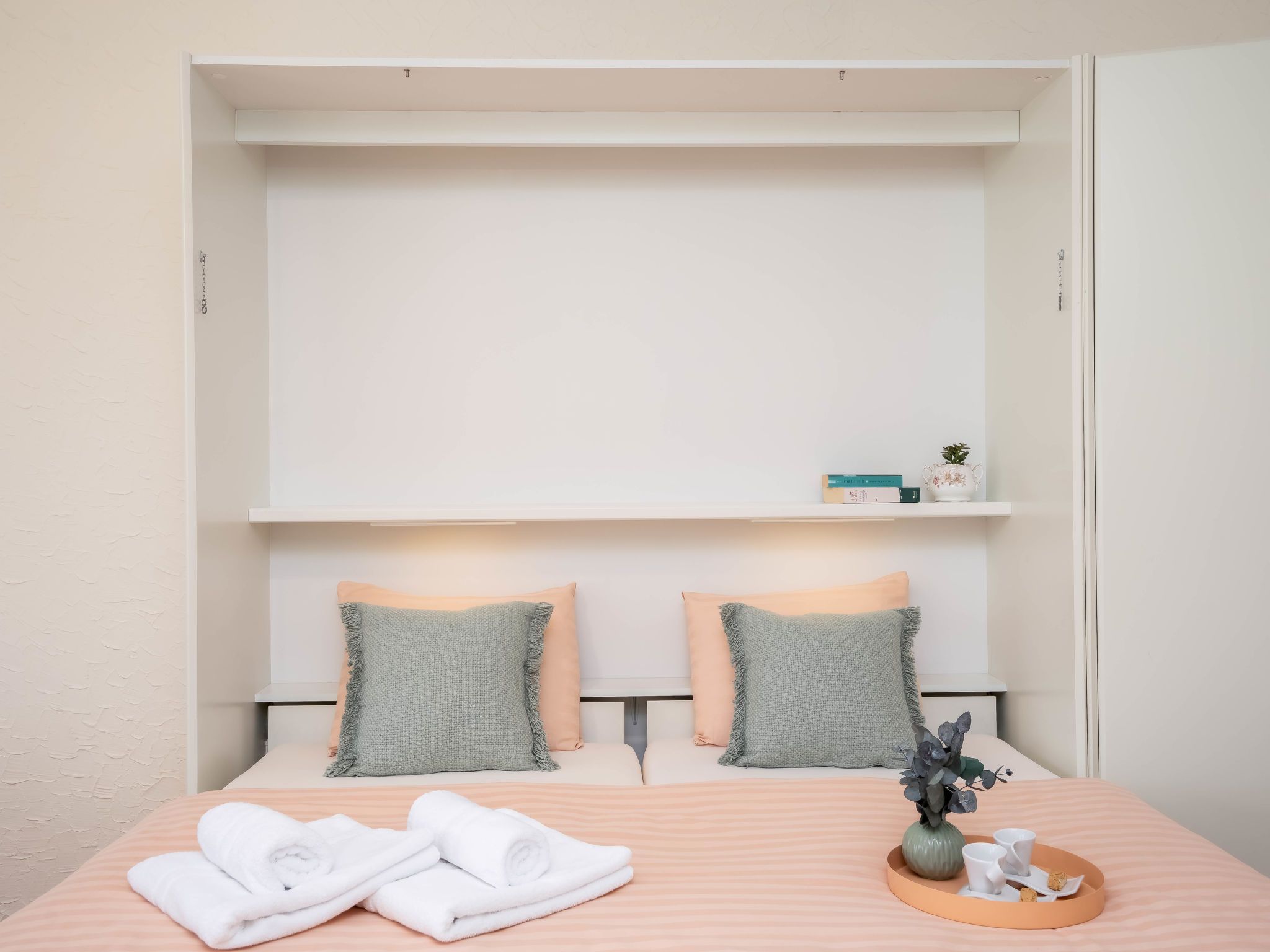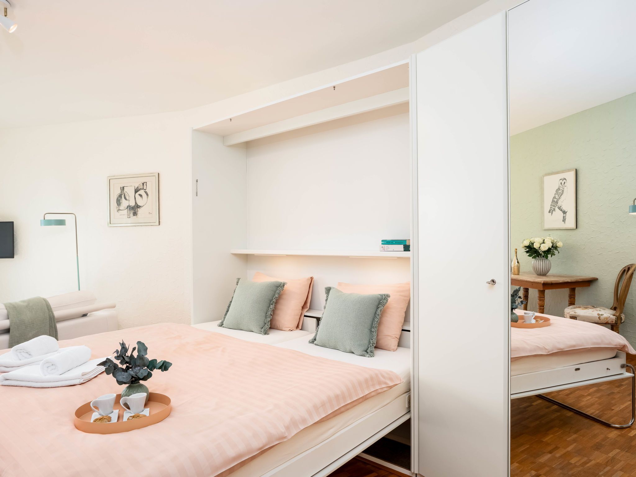 Double Room Classic, 1-Zimmer-Wohnung 35 m2 im 1. Stock, Südlage. Wohn-/Esszimmer mit 1 Doppelwandschrankbett (2 x 90 cm, Länge 200 cm), Sat-TV und Radio. Kochnische (Backofen, elektrische Kaffeemaschine, Kapseln für die Kaffeemaschine (Nespresso) extra). Bad/WC. Ölheizung. Balkon, Südlage. Schöne Sicht auf den See und die Berge. Zur Verfügung: Internet (Wireless LAN, gratis). Bitte beachten: Nichtraucher-Unterkunft, Nichtraucher-Haus. Maximal 1 Haustier/Hund erlaubt. NL-