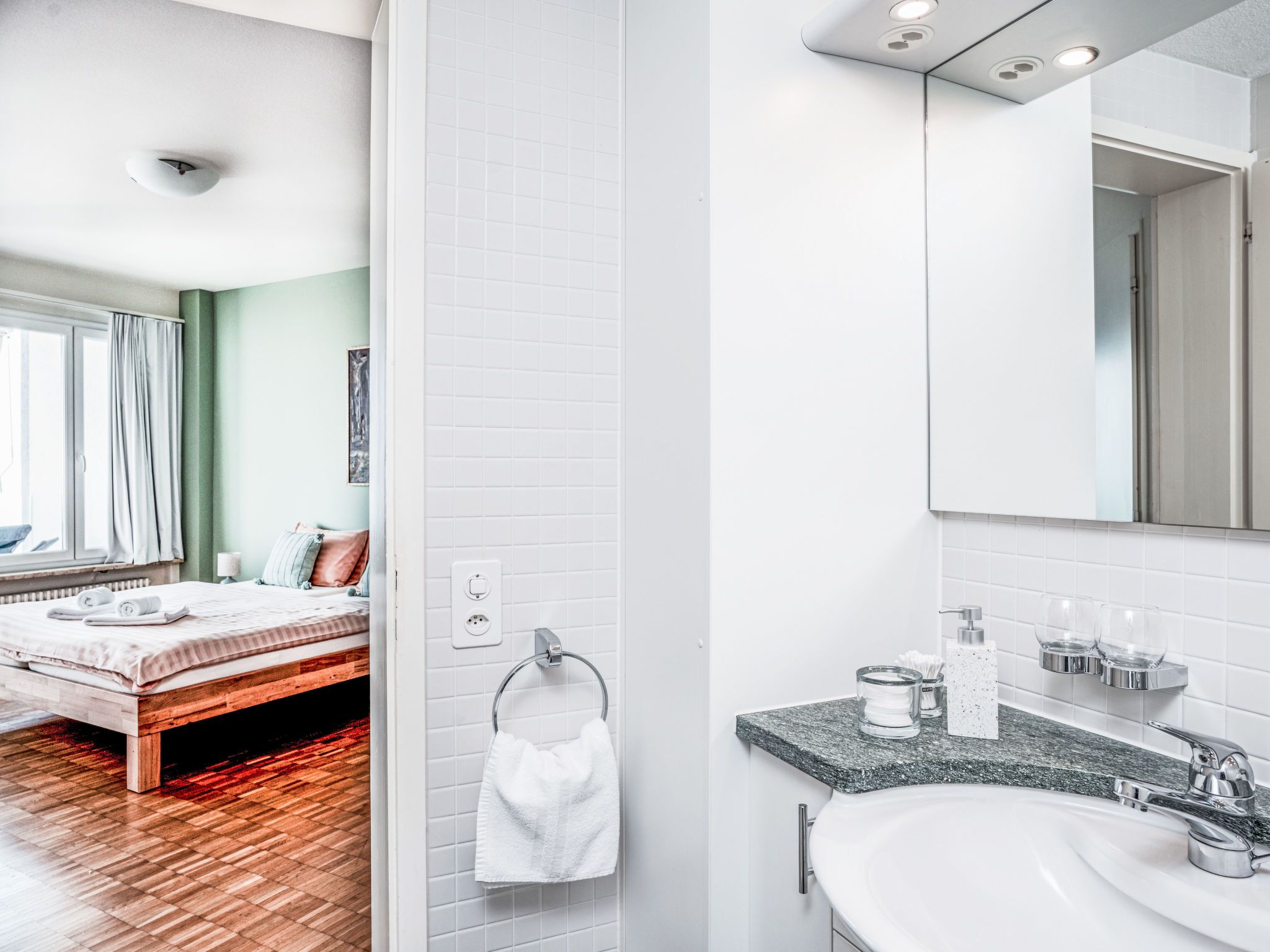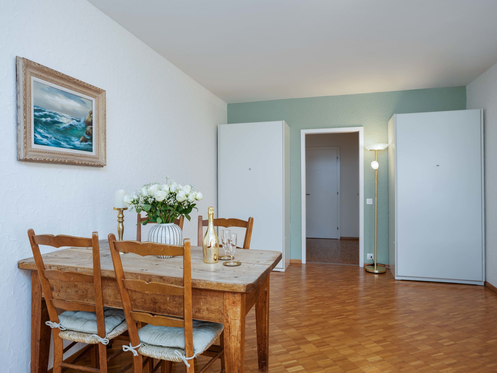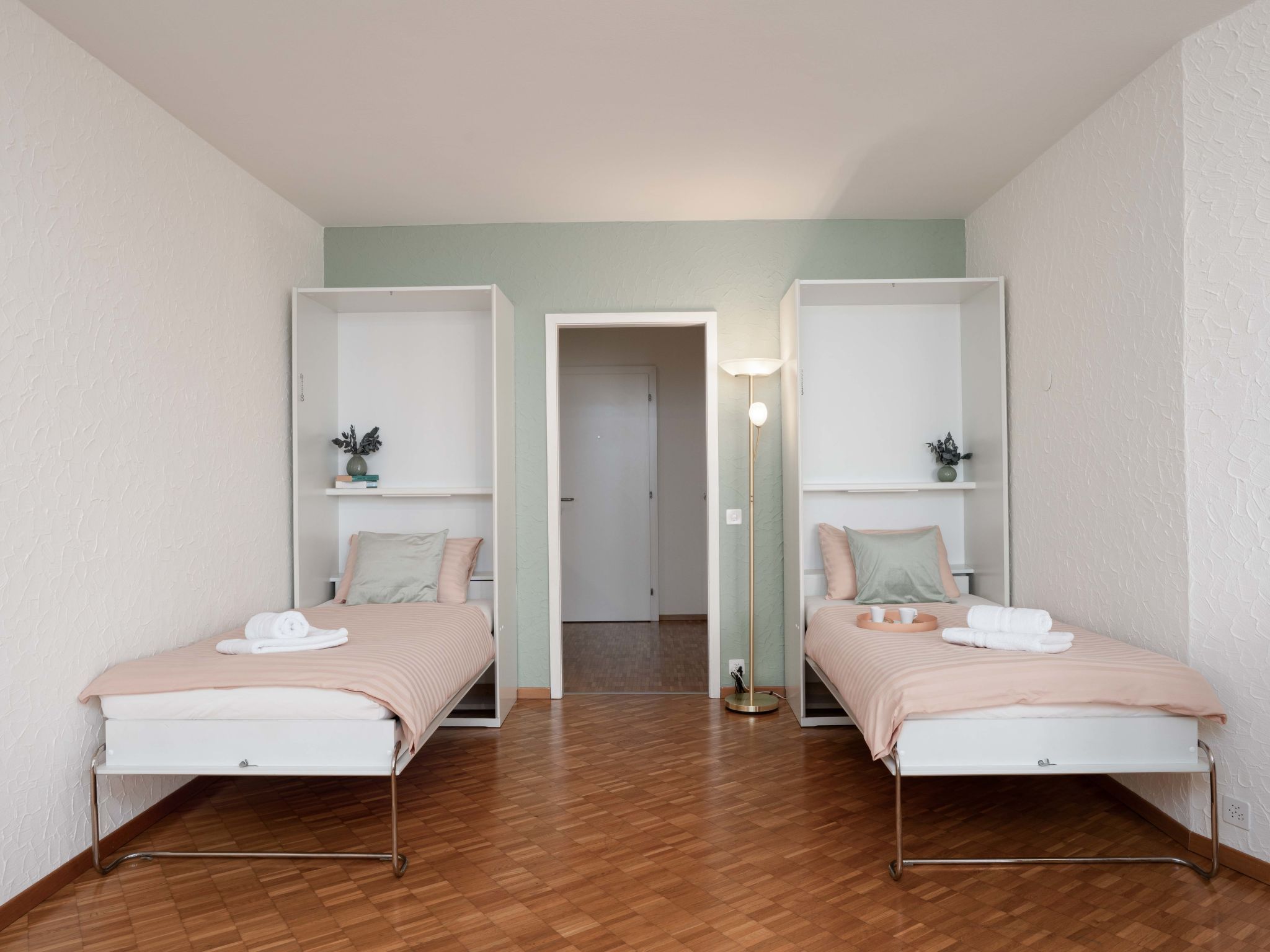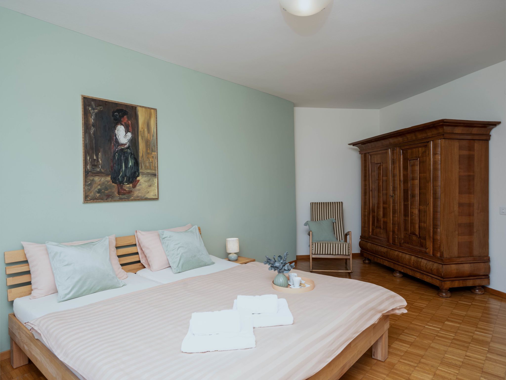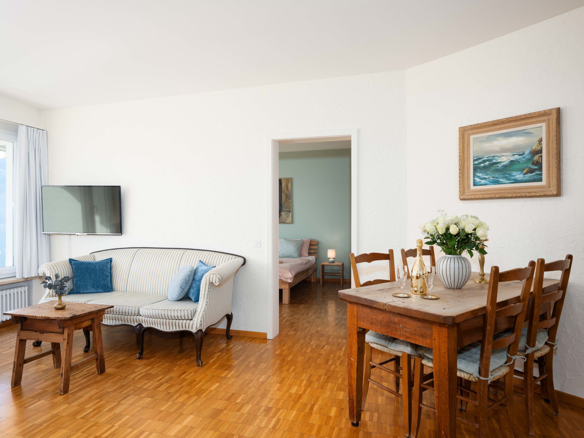 Suite Classic, 2-Zimmer-Wohnung 70 m2 im 3. Stock, Südlage. Wohn-/Esszimmer mit 2 Wandschrankbetten (90 cm, Länge 200 cm), Sat-TV und Radio. 1 Zimmer mit 1 Doppelbett (1 x 180 cm, Länge 200 cm). Kochnische (Backofen, elektrische Kaffeemaschine, Kapseln für die Kaffeemaschine (Nespresso) extra). Bad/WC, sep. WC. Ölheizung. Grosser Balkon. Schöne Panoramasicht auf den See, die Berge und die Ortschaft. Zur Verfügung: Internet (WLAN, gratis). Bitte beachten: Nichtraucher-Unterkunft, Nichtraucher-Haus. Maximal 1 Haustier/Hund erlaubt. NL-