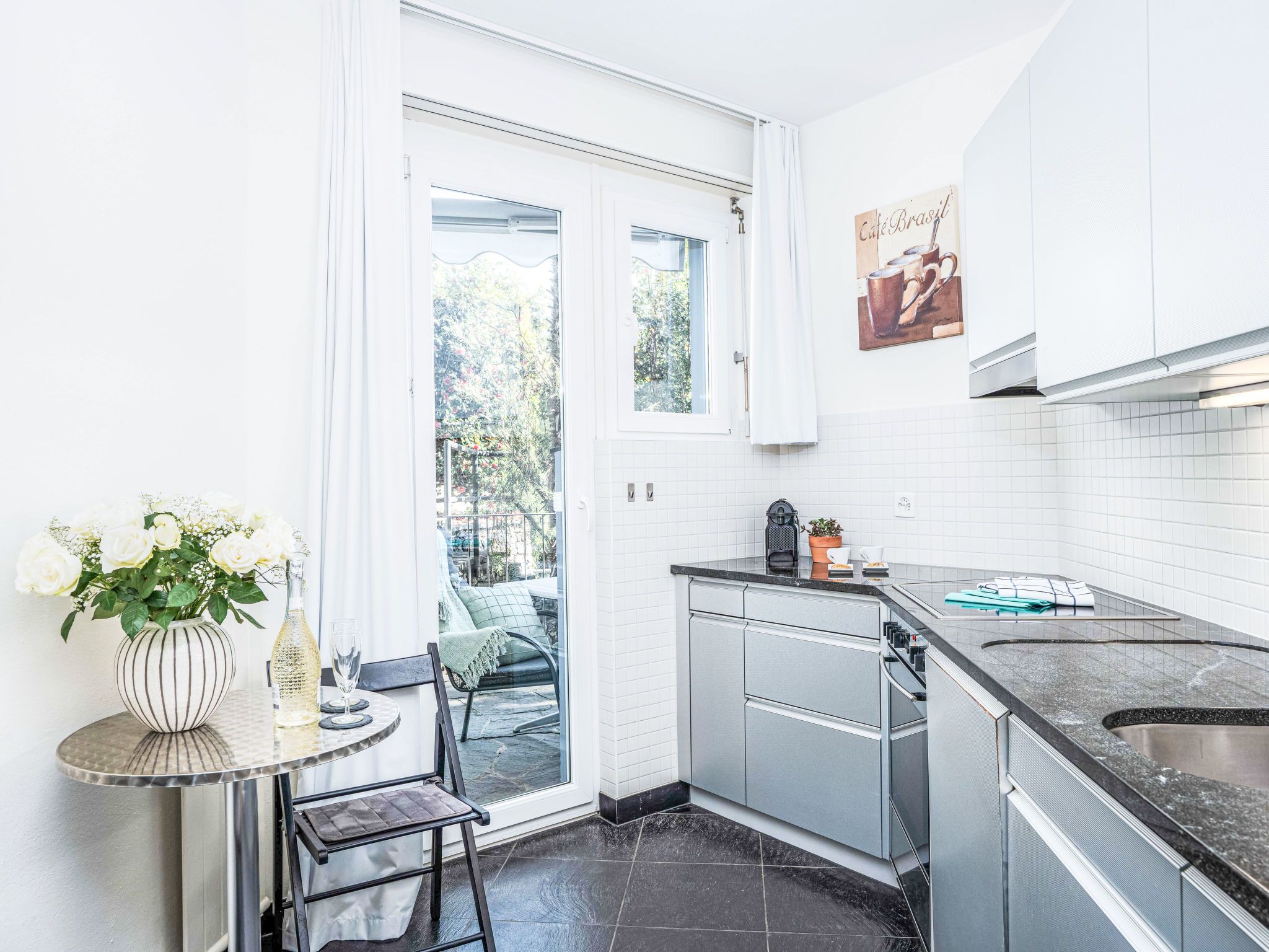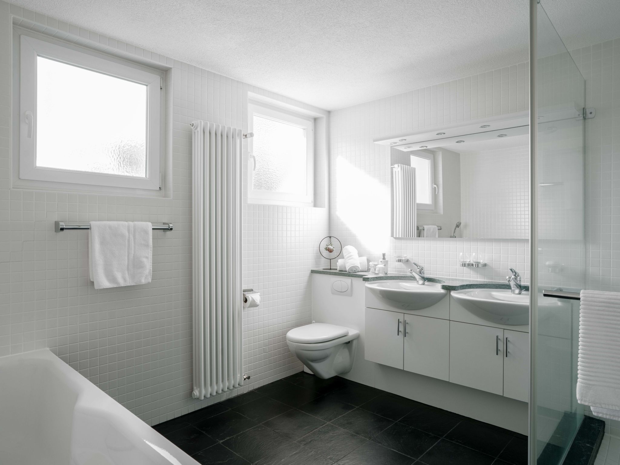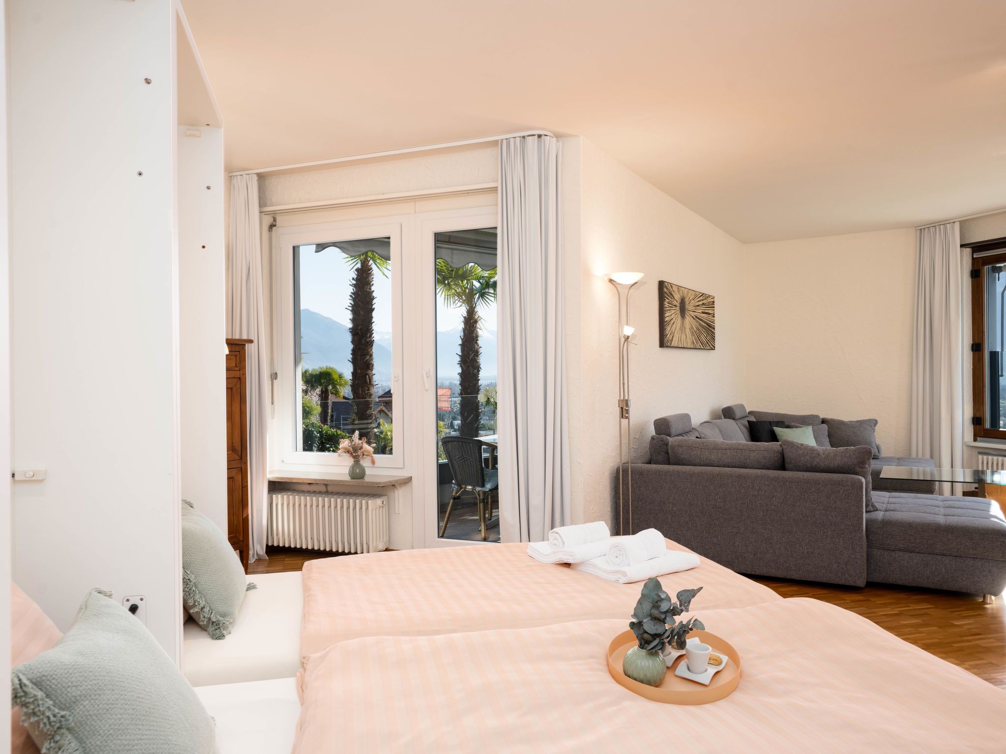 Suite Classic, 2-Zimmer-Wohnung 90 m2 im 1. Stock, Südostlage. Wohn-/Schlafzimmer mit 2 Wandschrankbetten (90 cm, Länge 200 cm), Sat-TV und Radio. 1 Zimmer mit 1 Doppelbett (1 x 200 cm, Länge 200 cm). Küche (Backofen, Geschirrspüler, elektrische Kaffeemaschine, Kapseln für die Kaffeemaschine (Nespresso) extra). Bad/WC. Ölheizung. Balkon, Ostlage, Gartensitzplatz. Schöne Sicht auf den See, die Berge und die Ortschaft. Maximal 1 Haustier/Hund erlaubt. NL-