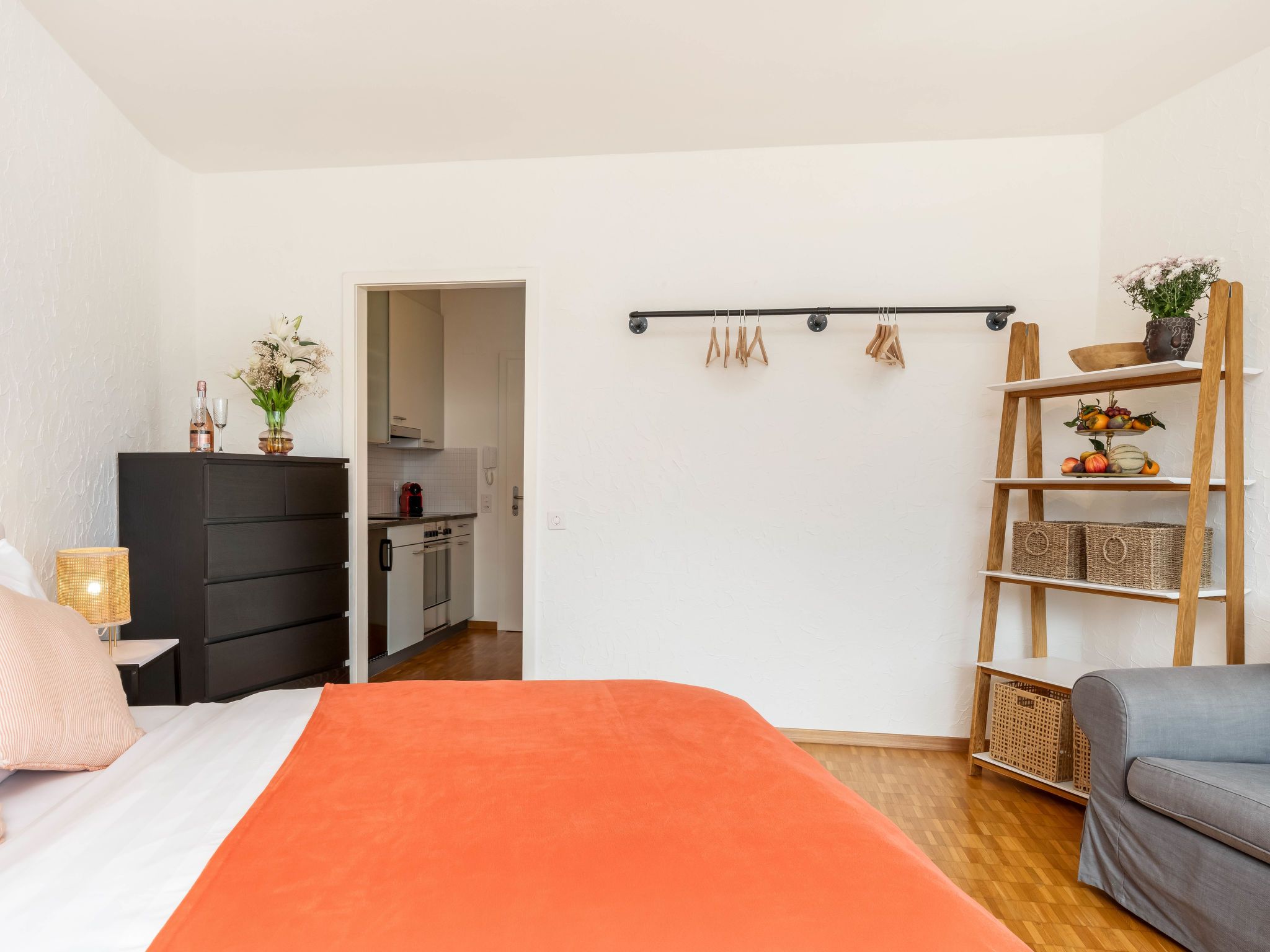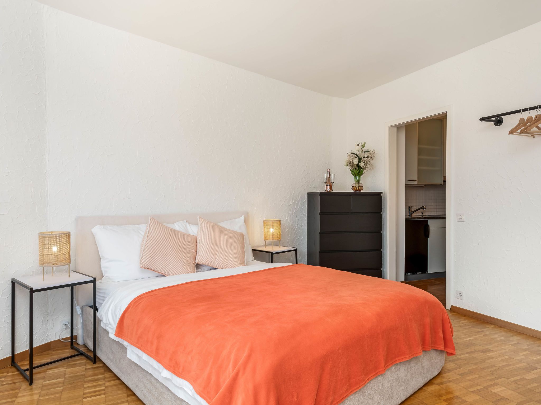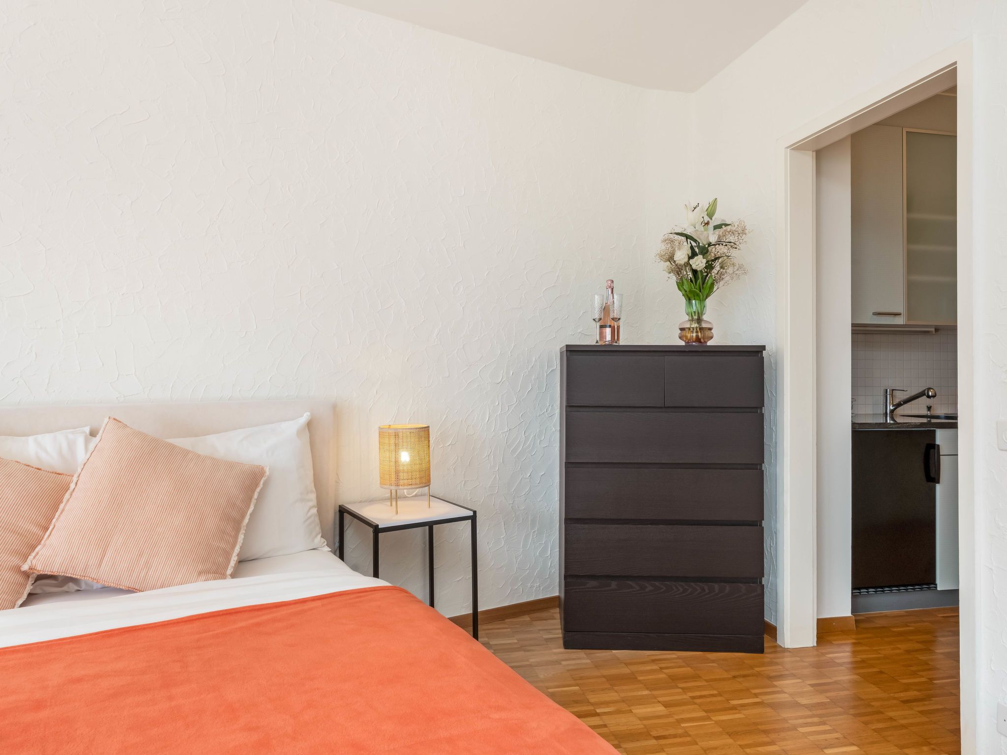 Double Room Modern, 1-Zimmer-Wohnung 35 m2 im 2. Stock, Südlage. Renoviert: Wohn-/Esszimmer mit 1 Doppelbett (1 x 160 cm, Länge 200 cm), Sat-TV und Radio. Kochnische (Backofen, elektrische Kaffeemaschine, Kapseln für die Kaffeemaschine (Nespresso) extra). Bad/WC. Ölheizung. Balkon, Südlage. Herrliche Sicht auf den See, die Berge und die Ortschaft. Zur Verfügung: Internet (Wireless LAN, gratis). Bitte beachten: Nichtraucher-Unterkunft. Maximal 1 Haustier/Hund erlaubt. NL-