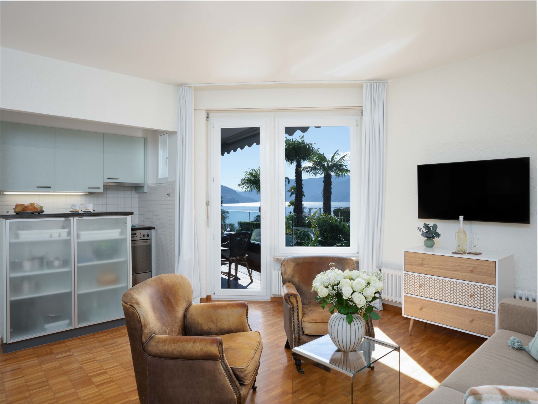 Junior Suite Classic - Isole di Brissago, 2-Zimmer-Wohnung 60 m2 im 3. Stock, Westlage. Wohn-/Schlafzimmer mit 1 Doppeldiwanbett (1 x 160 cm, Länge 200 cm), Sat-TV und Radio. 1 Zimmer mit 1 Doppelbett (1 x 200 cm, Länge 200 cm). Offene Küche (Backofen, elektrische Kaffeemaschine, Kapseln für die Kaffeemaschine (Nespresso) extra). Bad/WC. Ölheizung. Balkon. Eingeschränkte Sicht auf den See. Zur Verfügung: Internet (WLAN, gratis). Bitte beachten: Nichtraucher-Unterkunft, Nichtraucher-Haus. Maximal 1 Haustier/Hund erlaubt. NL-