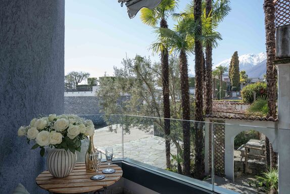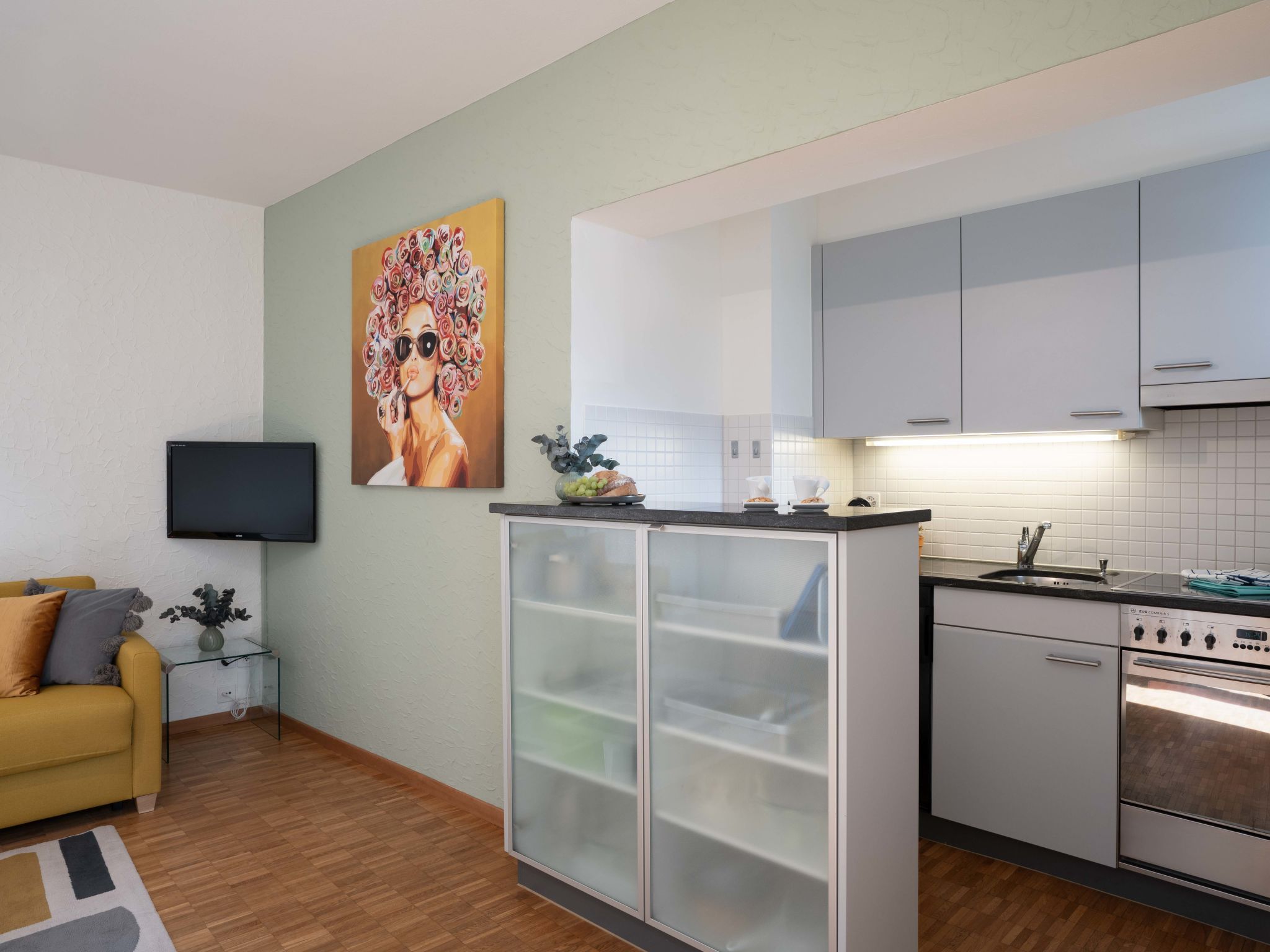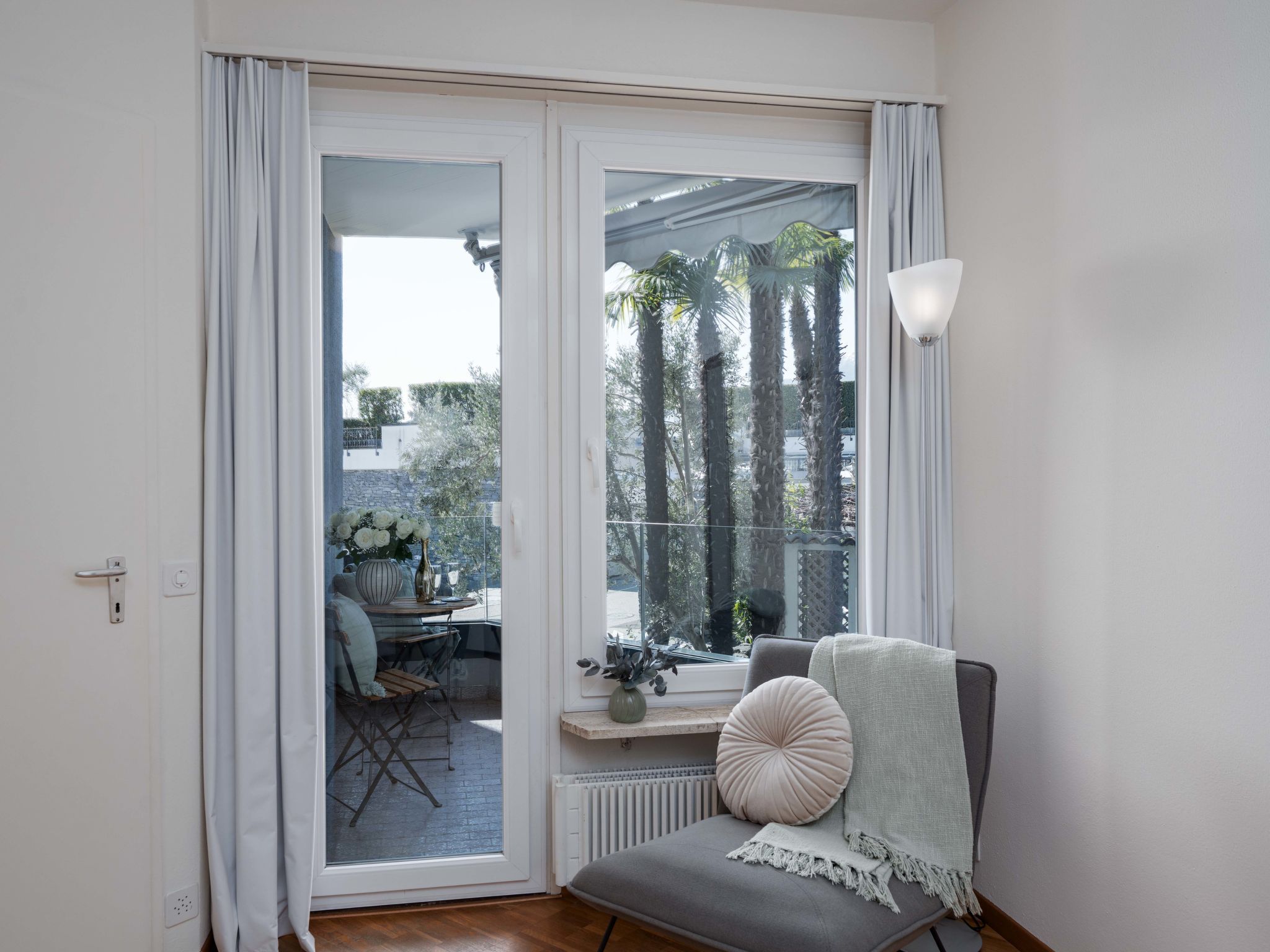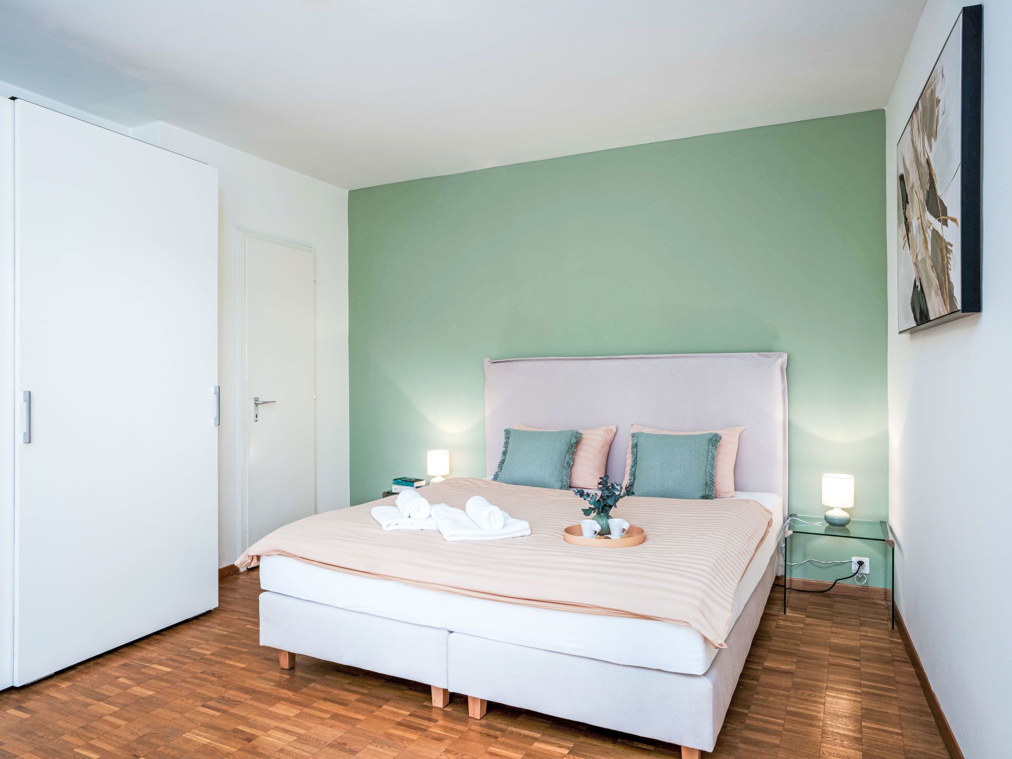 Suite Modern, 2-Zimmer-Wohnung 60 m2 im 1. Stock, Westlage. Renoviert: Wohn-/Esszimmer mit 1 Doppeldiwanbett (1 x 160 cm, Länge 200 cm), TV und Radio. 1 Zimmer mit 1 Doppelbett (1 x 180 cm, Länge 200 cm). Offene Küche (Backofen, elektrische Kaffeemaschine, Kapseln für die Kaffeemaschine (Nespresso) extra). Bad/WC. Ölheizung. 2 Balkone, Westlage. Eingeschränkte Sicht auf den See, die Berge und die Ortschaft. Zur Verfügung: Internet (WLAN, gratis). Bitte beachten: Nichtraucher-Haus. Maximal 1 Haustier/Hund erlaubt. NL-