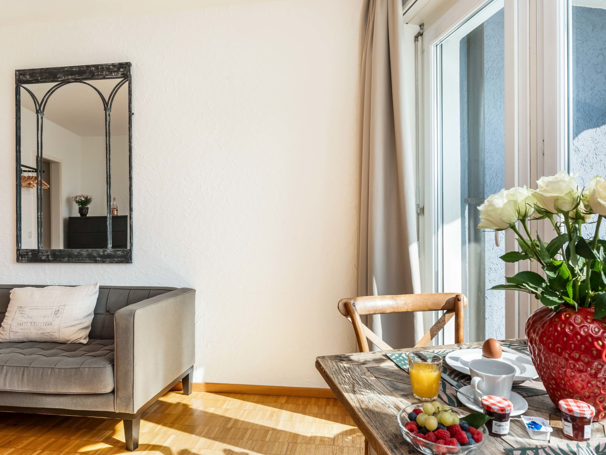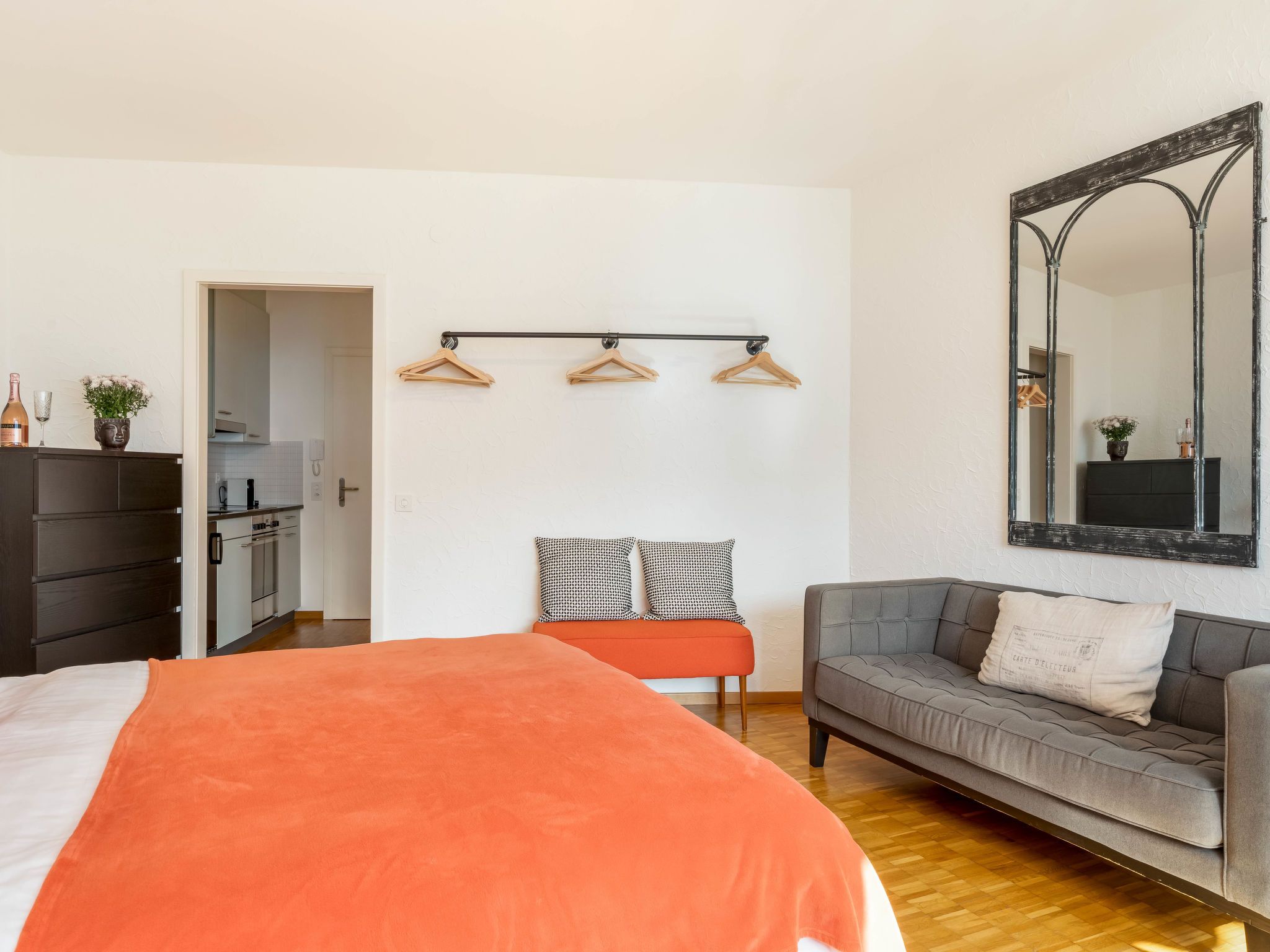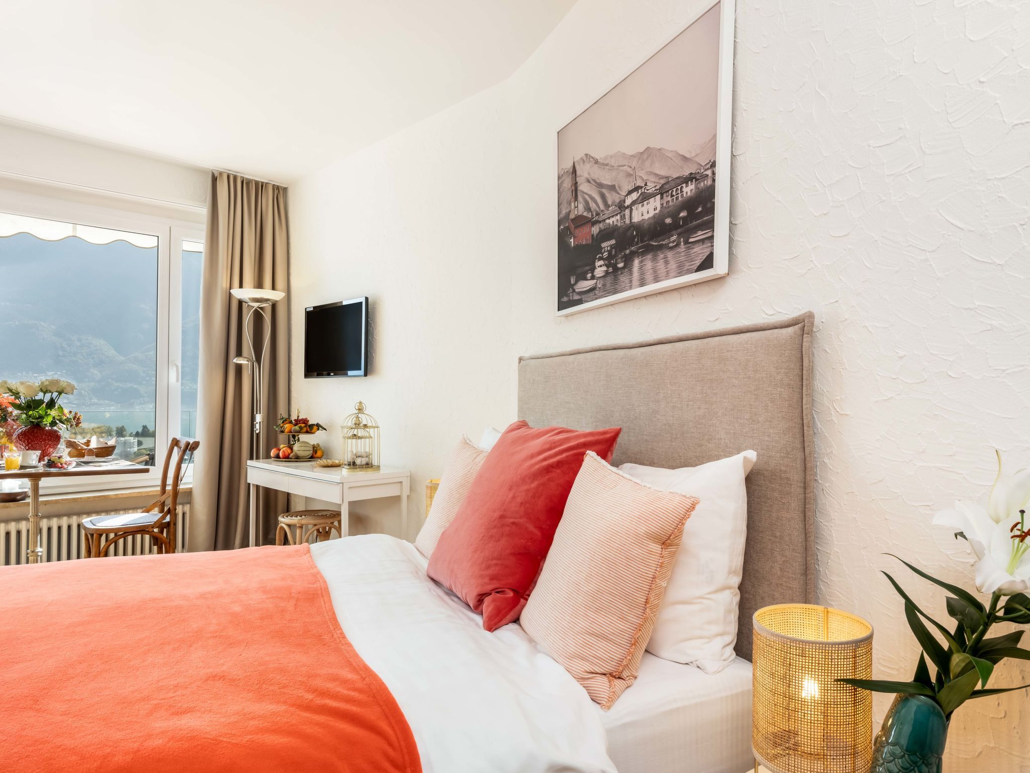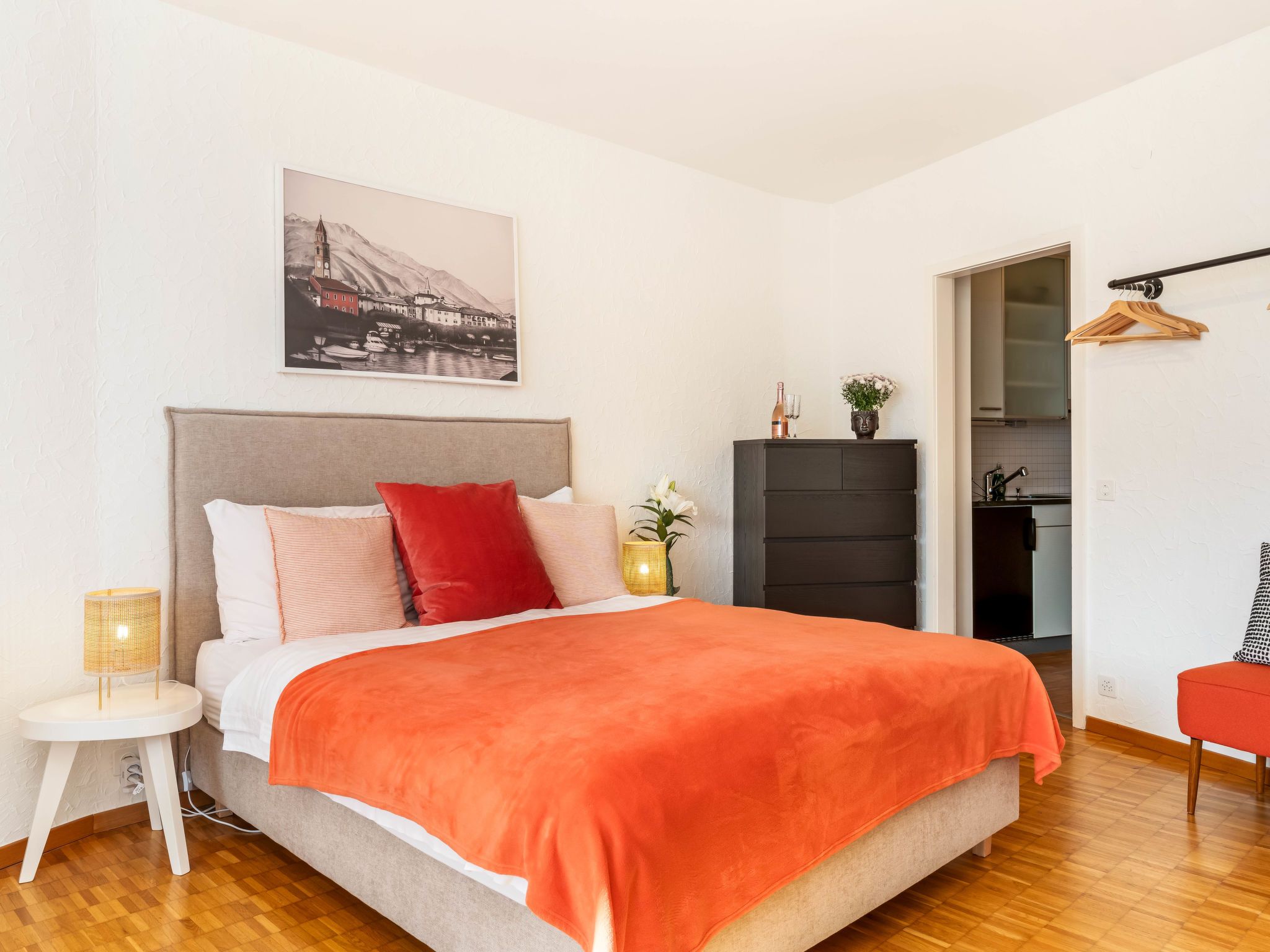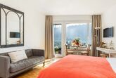 Double Room Modern, 1-Zimmer-Wohnung 35 m2, Südlage. Renoviert: Wohn-/Esszimmer mit 1 Doppelbett (1 x 180 cm, Länge 200 cm), Sat-TV und Radio. Kochnische (Backofen, elektrische Kaffeemaschine, Kapseln für die Kaffeemaschine (Nespresso) extra). Bad/WC. Ölheizung. Balkon, Südlage. Herrliche Sicht auf den See, die Berge und die Ortschaft. Zur Verfügung: Internet (Wireless LAN, gratis). Bitte beachten: Nichtraucher-Unterkunft, Nichtraucher-Haus. Maximal 1 Haustier/Hund erlaubt. NL-