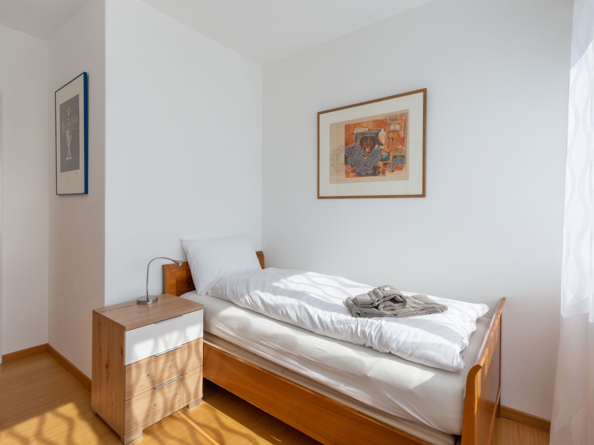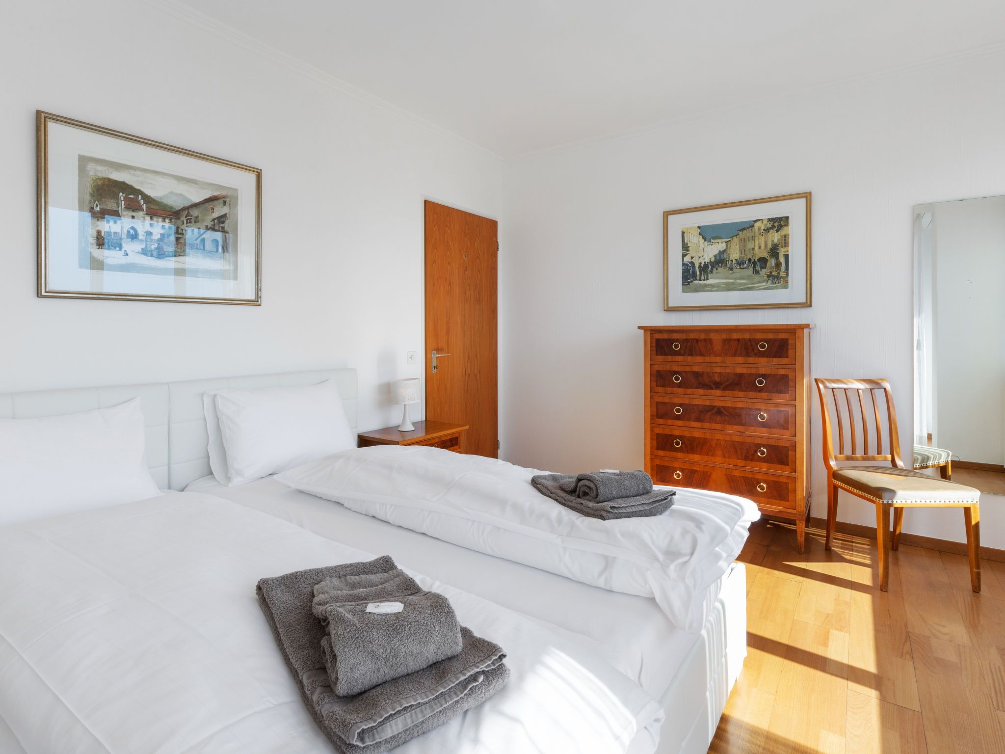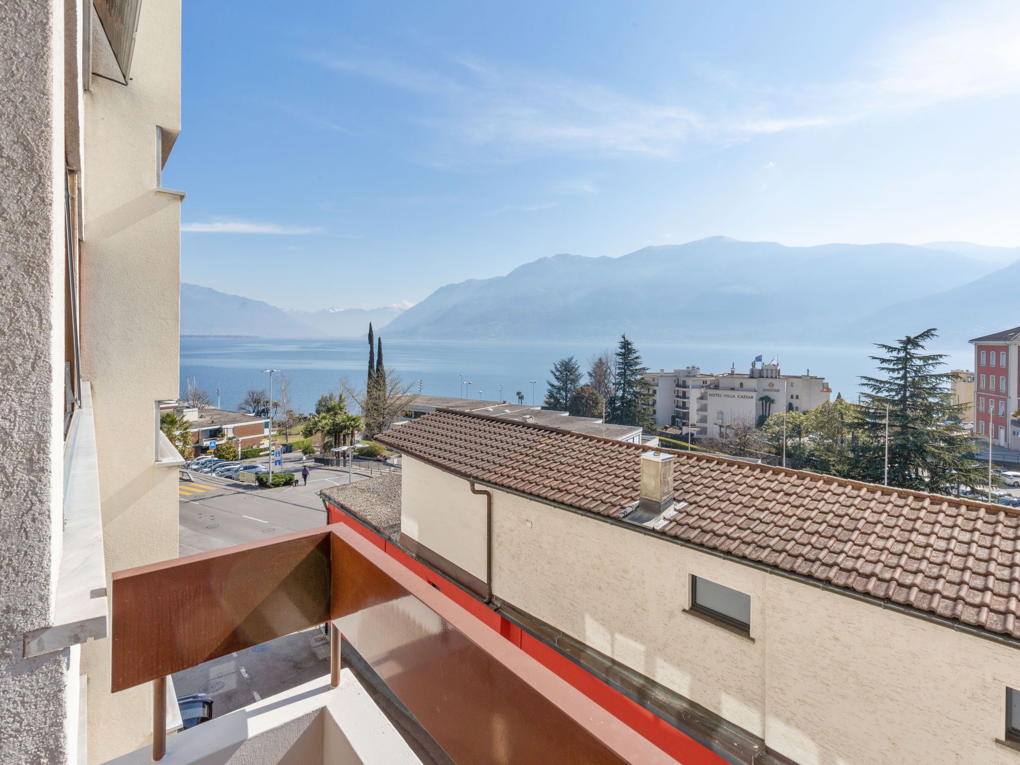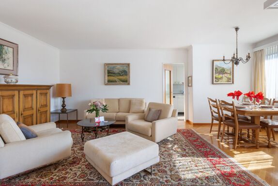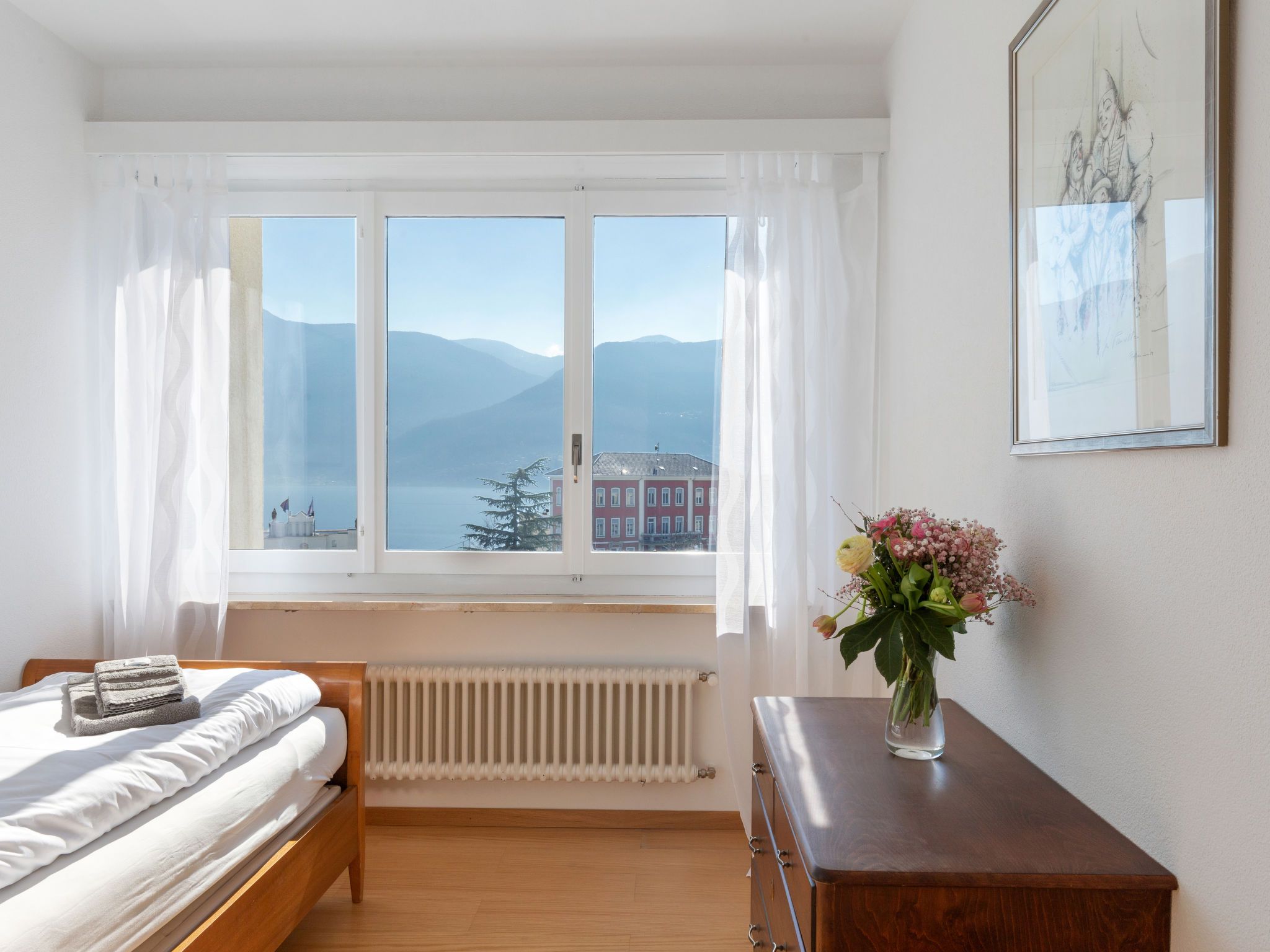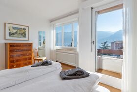 Alga Lakeview, 4-Zimmer-Wohnung 120 m2 im 3. Stock, Nordostlage. Geräumig und hell, renoviert im Jahre 2023, komfortabel und gemütlich eingerichtet: offenes grosses Wohn-/Esszimmer mit Esstisch, Kabel-TV und Internationale TV-Sender (Flachbildschirm). Ausgang zum Balkon. 1 Zimmer mit 1 Bett (90 cm, Länge 200 cm), 20 Diwanbetten. 1 Doppelzimmer mit 1 Doppelbett (2 x 90 cm, Länge 200 cm). Ausgang zum Balkon. 1 Zimmer mit 1 Bett (90 cm, Länge 200 cm). Küche (3 Kochplatten, Backofen, Toaster, Wasserkocher, elektrische Kaffeemaschine, Kapseln für die Kaffeemaschine (Nespresso) extra). Bad/WC, Dusche, sep. WC. Balkon 8 m2, Nordostlage. Balkonmöbel. Sehr schöne Panoramasicht auf den See, die Berge und die Landschaft. Zur Verfügung: Bügeleisen, Kinderhochstuhl, Babybett bis 2 Jahre (extra), Haartrockner. Internet (WLAN, gratis). Bitte beachten: Nichtraucher-Unterkunft. NL-