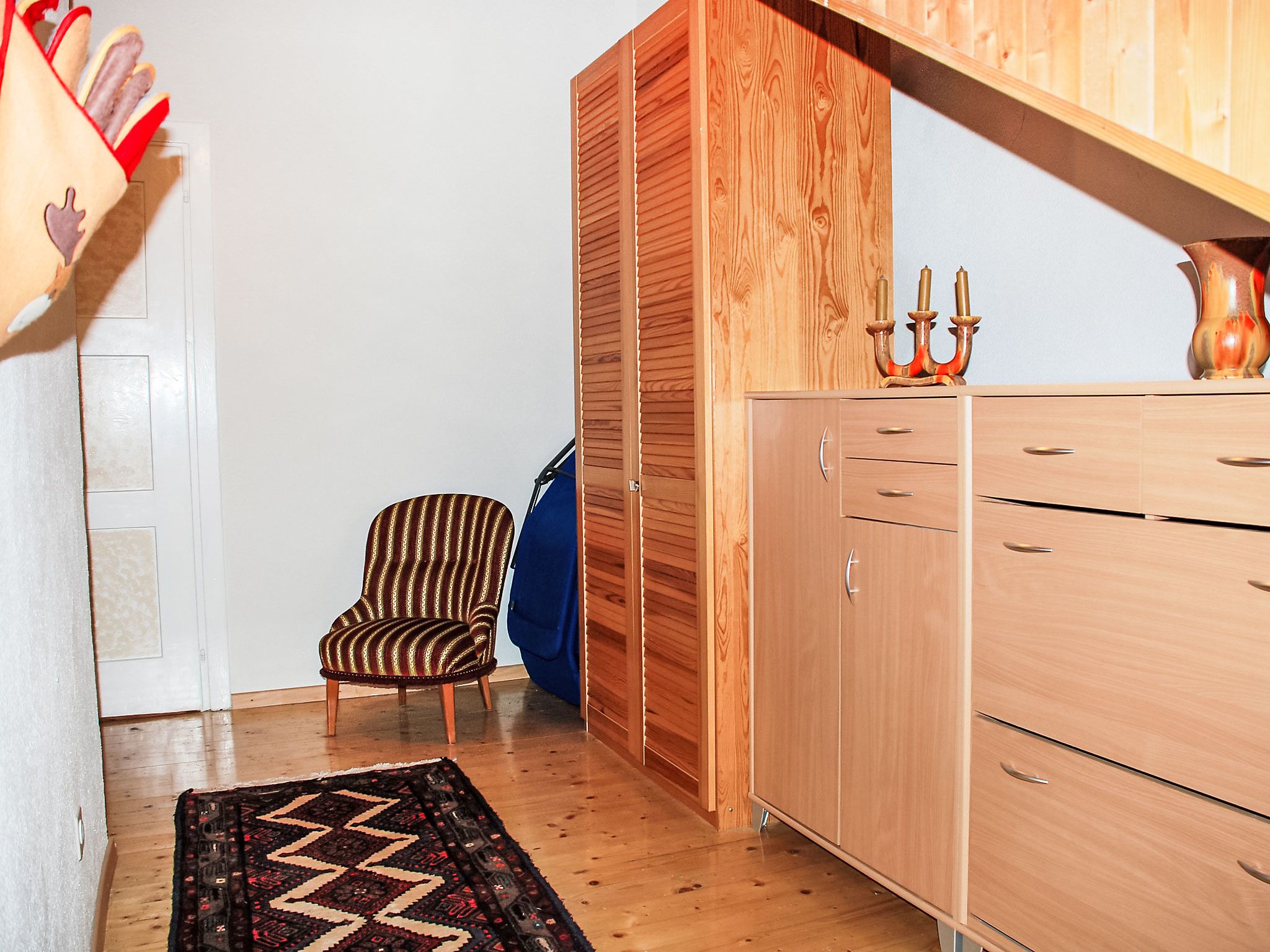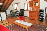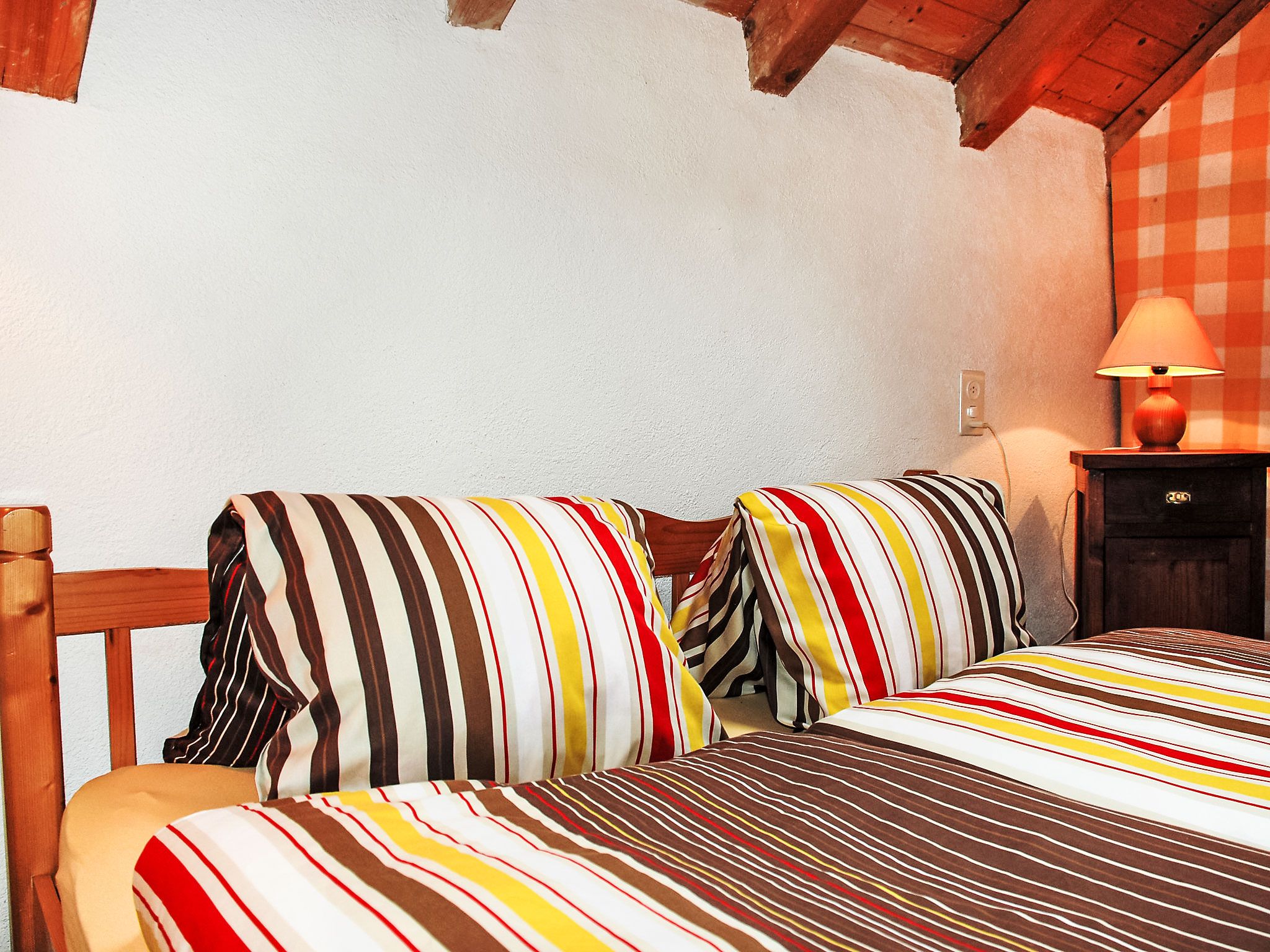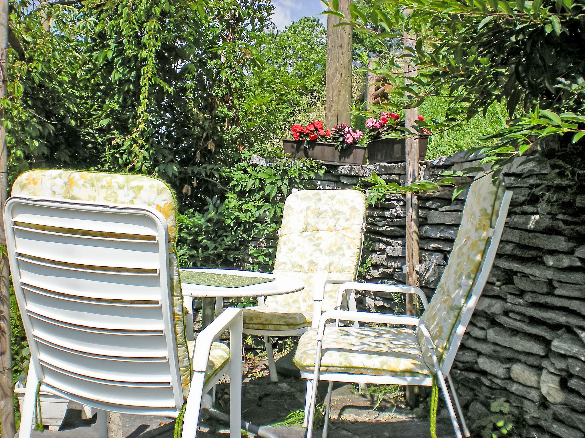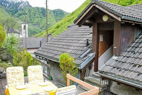 Strecce 1, 2-Zimmer-Wohnung 60 m2. Abgeschrägt, zweckmässig und gemütlich eingerichtet: abgeschrägtes Wohn-/Esszimmer mit 1 Diwanbett (140 cm, Länge 200 cm), Sat-TV, DVD und E-Heizung. Ausgang zum Garten. 1 Doppelzimmer mit 1 franz. Bett (1 x 160 cm, Länge 200 cm). Abgeschrägte, offene Küche (4 Kochplatten, Backofen). Dusche/WC. Holzdielenboden. Terrasse 10 m2, Gartensitzplatz 12 m2. Balkonmöbel, Gartengrill (mobil), Liegestühle (4). Seitliche Sicht auf die Berge und das Tal. Bitte beachten: Nichtraucher-Unterkunft. NL-