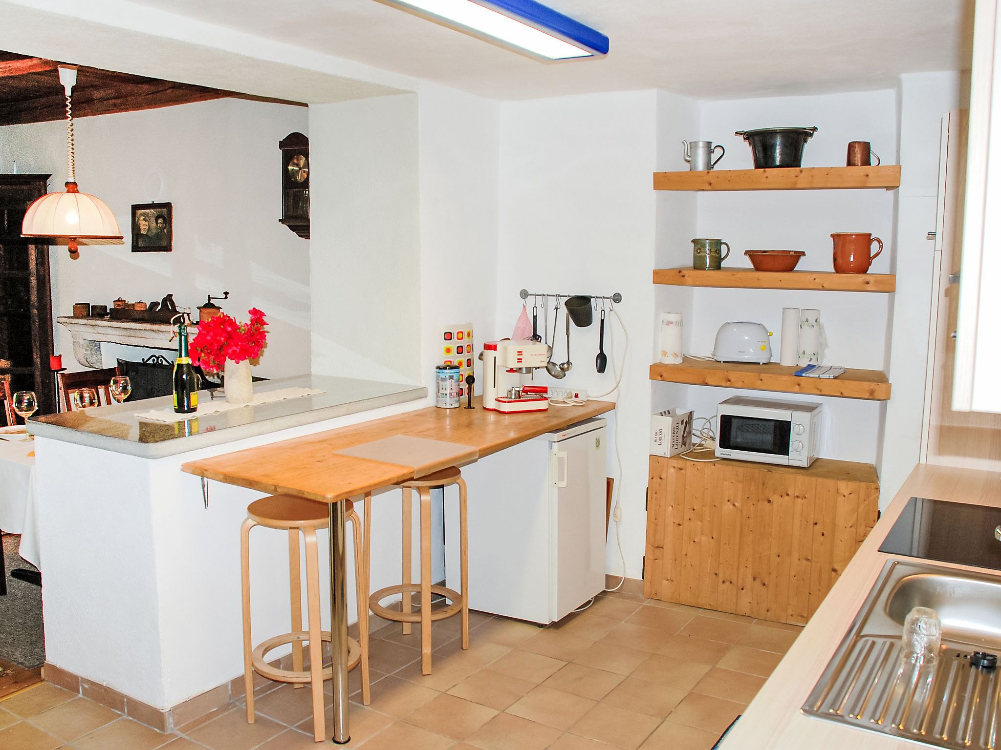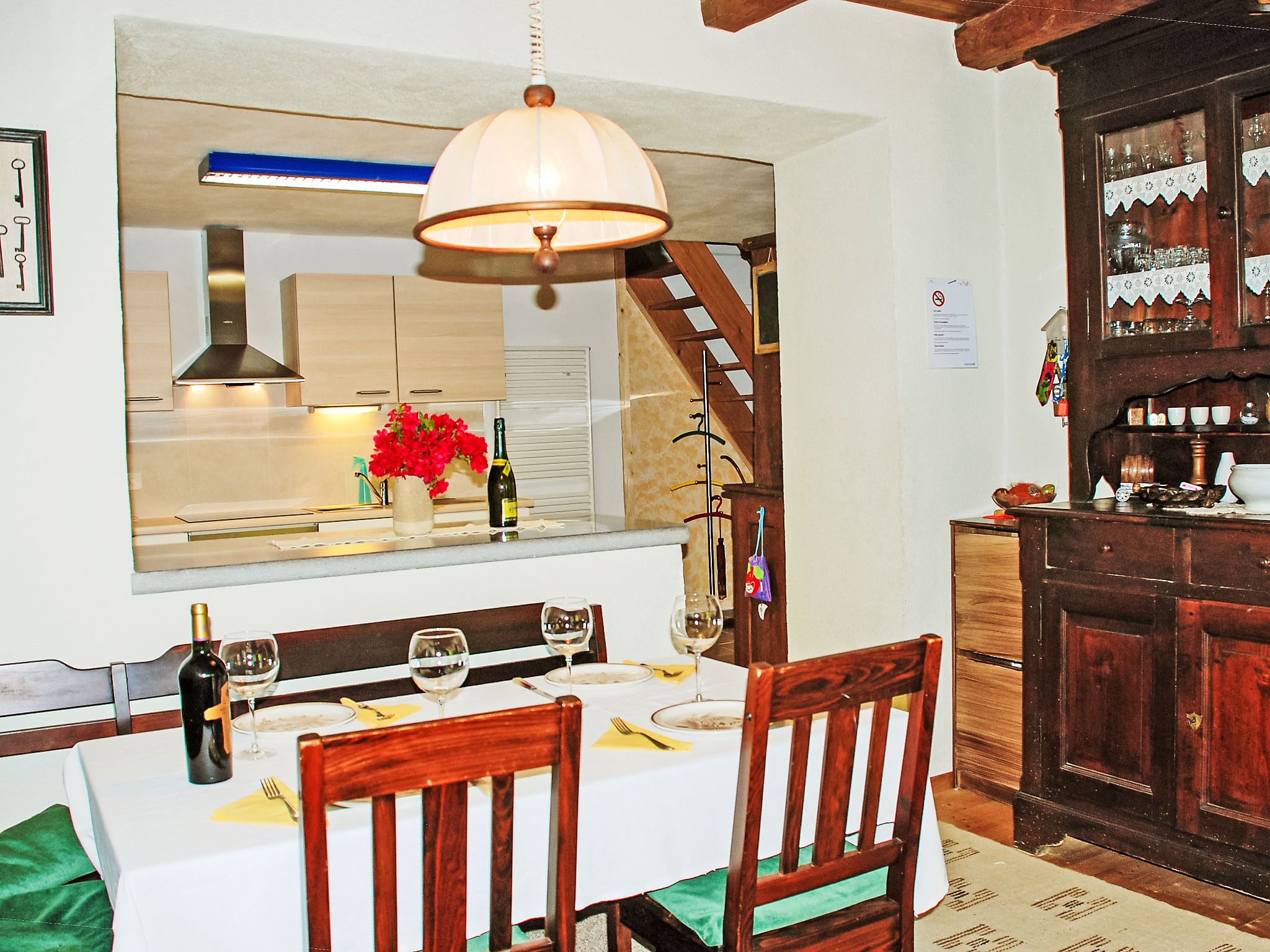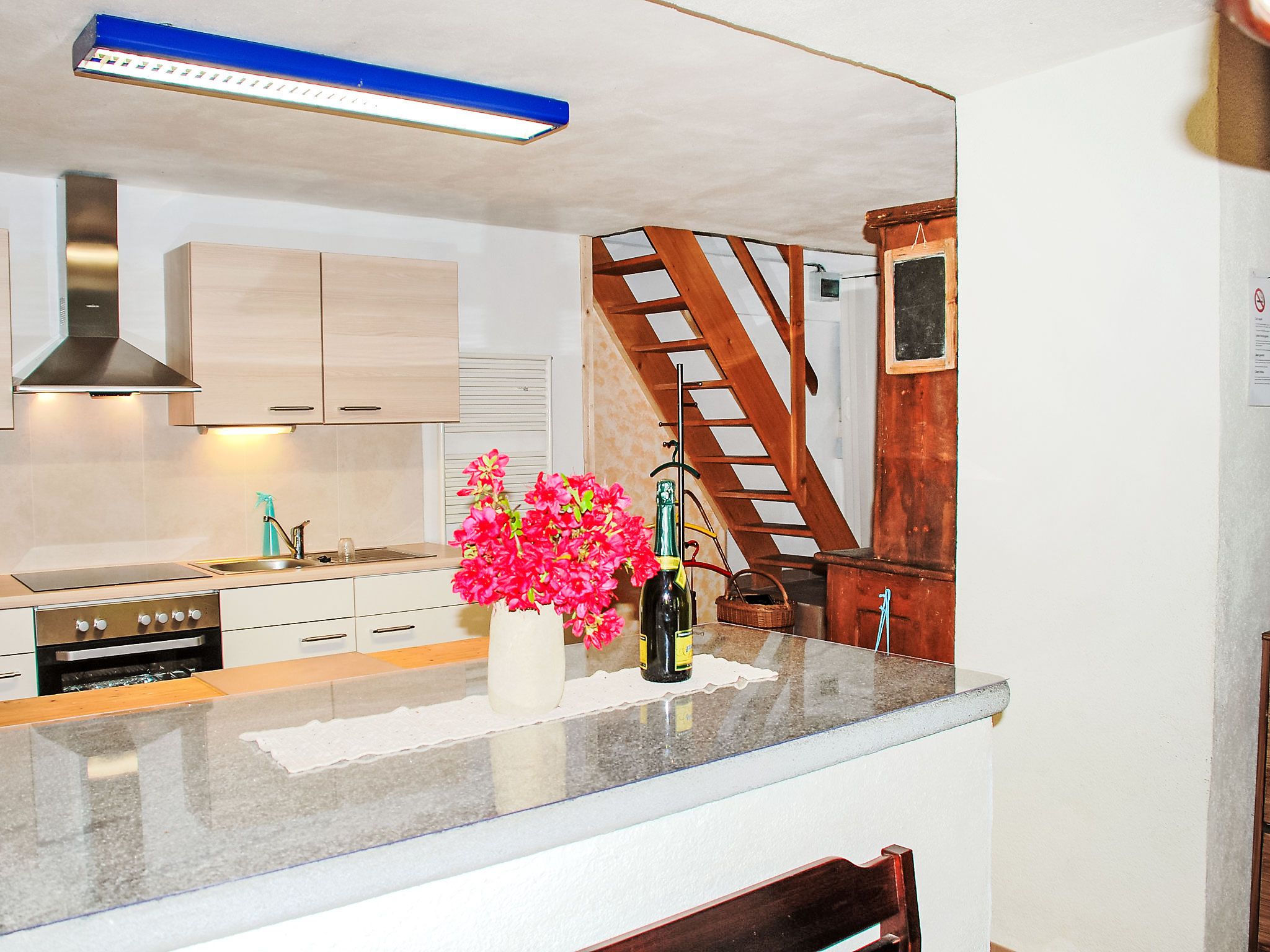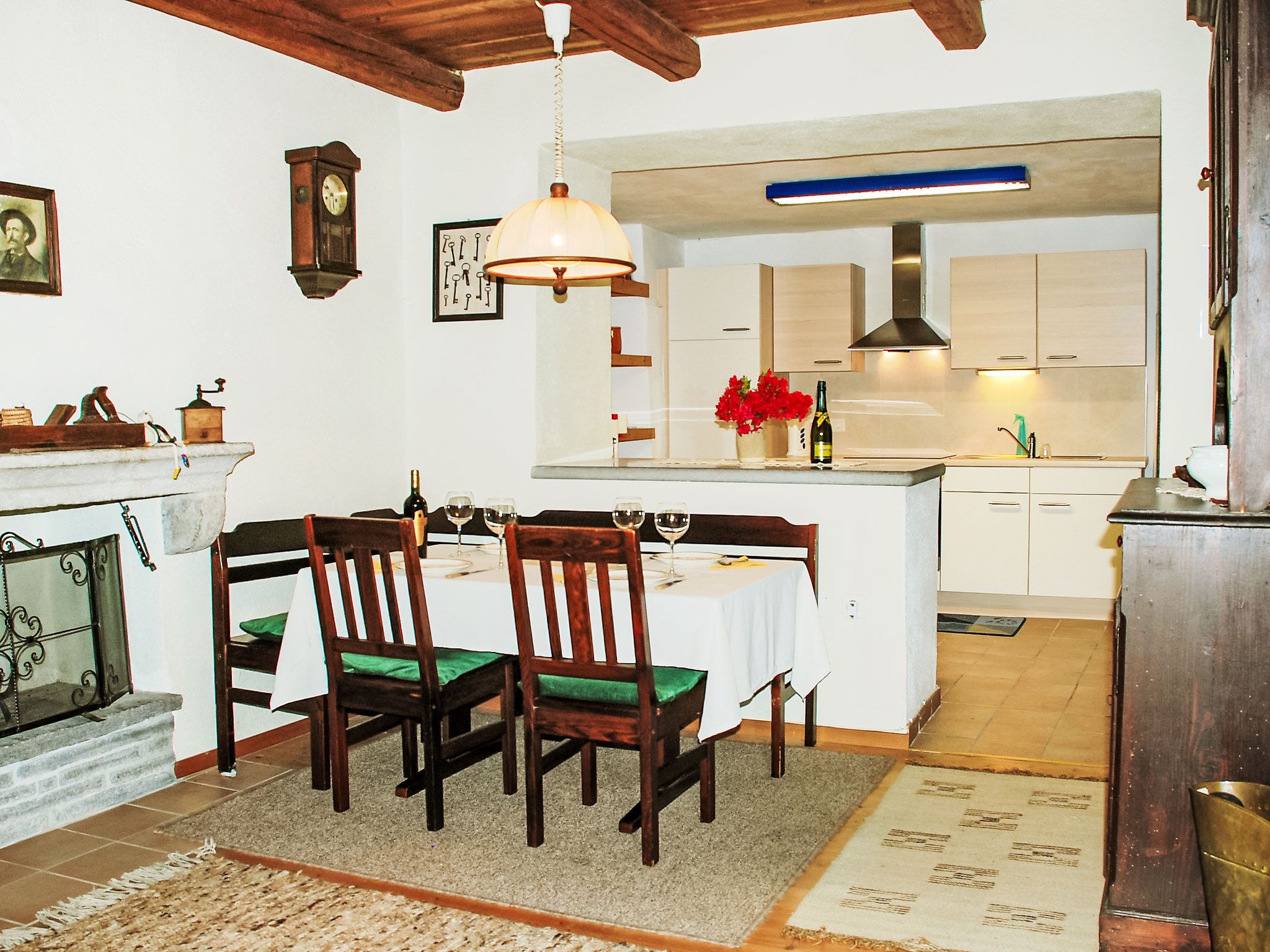 Strecce 2, 4-Zimmer-Wohnung auf 2 Stockwerken, im erhöhten Erdgeschoss. Zweckmässig und gemütlich eingerichtet: Wohnzimmer mit offenem Kamin, Sat-TV und Flachbildschirm. Grosse Wohnküche (Backofen, 4 Glaskeramikplatten, elektrische Kaffeemaschine) mit offenem Kamin. Ausgang zur Terrasse. Sep. WC. E-Heizung. Obergeschoss: 1 Doppelzimmer mit 1 franz. Bett (1 x 160 cm, Länge 200 cm). Ausgang zum Balkon. 1 Zimmer mit 1 Doppelbett (2 x 90 cm, Länge 200 cm). 1 Zimmer, Fenster zum Hof mit 1 Bett (90 cm, Länge 200 cm). Dusche/Bidet/WC. Holzdielenboden. Balkon, Terrasse. Terrassenmöbel, Liegestühle (2). Eingeschränkte Sicht auf die Berge. Zur Verfügung: Waschmaschine, Wäschetrockner. Bitte beachten: Nichtraucher-Unterkunft. NL-