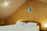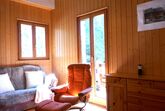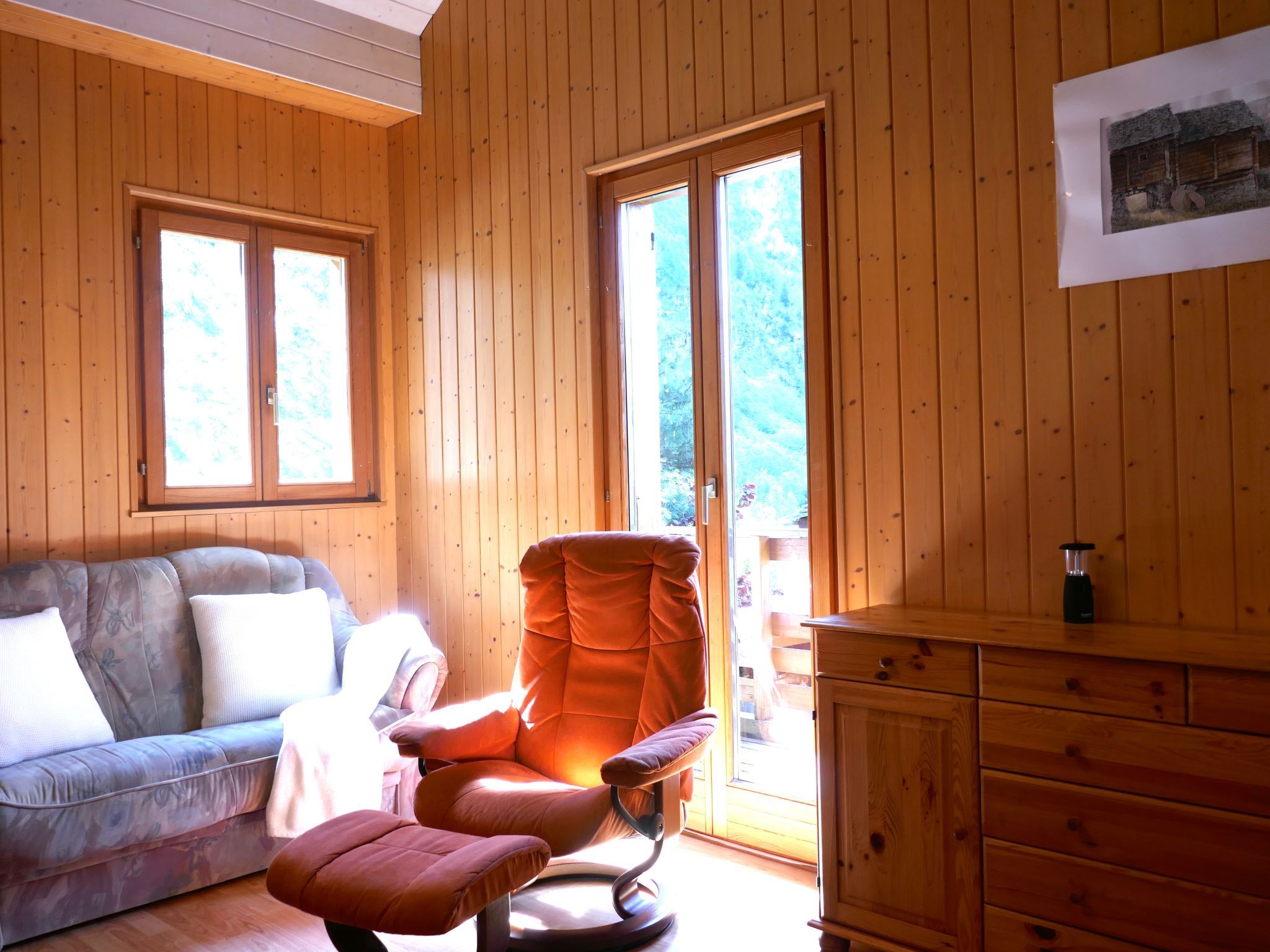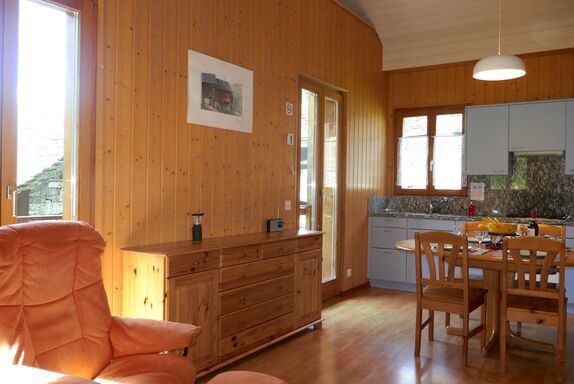 Rustico Fortuna, 3-Zimmer-Chalet 80 m2 auf 3 Stockwerken. Teilweise abgeschrägt, einfach und rustikal eingerichtet: offenes Wohn-/Esszimmer mit offenem Kamin, Esstisch und Radio. Ausgang zum Balkon. 1 Zimmer mit 1 x 2 Etagenbetten (90 cm, Länge 200 cm). Offene Küche (Backofen, Gasherd, 4 Flammen, Fondue Set (Käse)). Ausgang zum Balkon. Dusche/WC. G-Heizung, Holzheizung. Solarstrom. Obergeschoss: abgeschrägte, offene Galerie mit 1 Doppelbett (1 x 160 cm, Länge 200 cm). Gartensitzplatz. Terrassenmöbel, Gartengrill, Liegestühle (2), Sitzplatz. Schöne Sicht auf die Berge. Zur Verfügung: Kinderhochstuhl, Babybett bis 2 Jahre (extra). Bitte beachten: geeignet für Familien. Nichtraucher-Haus. NL-