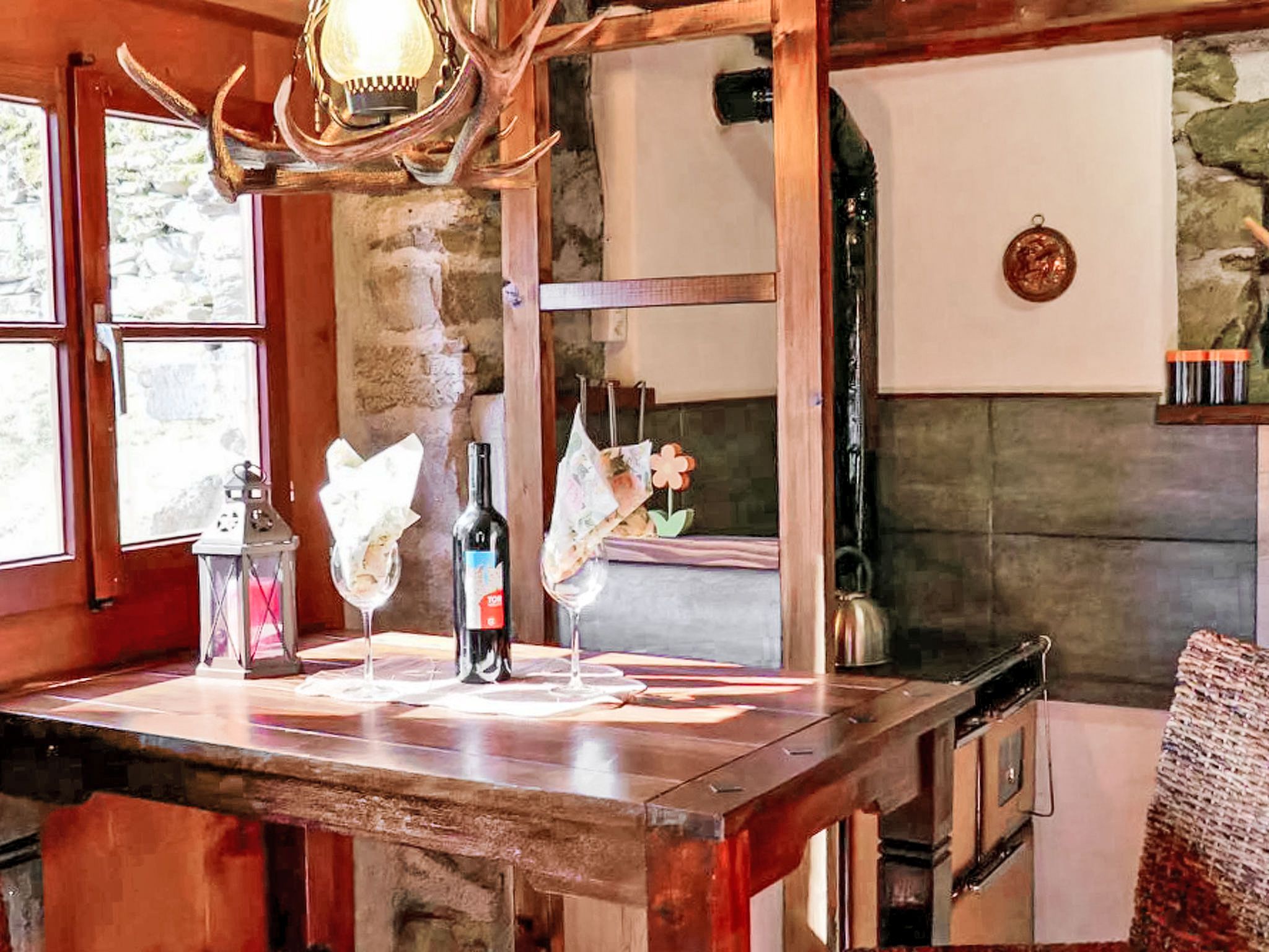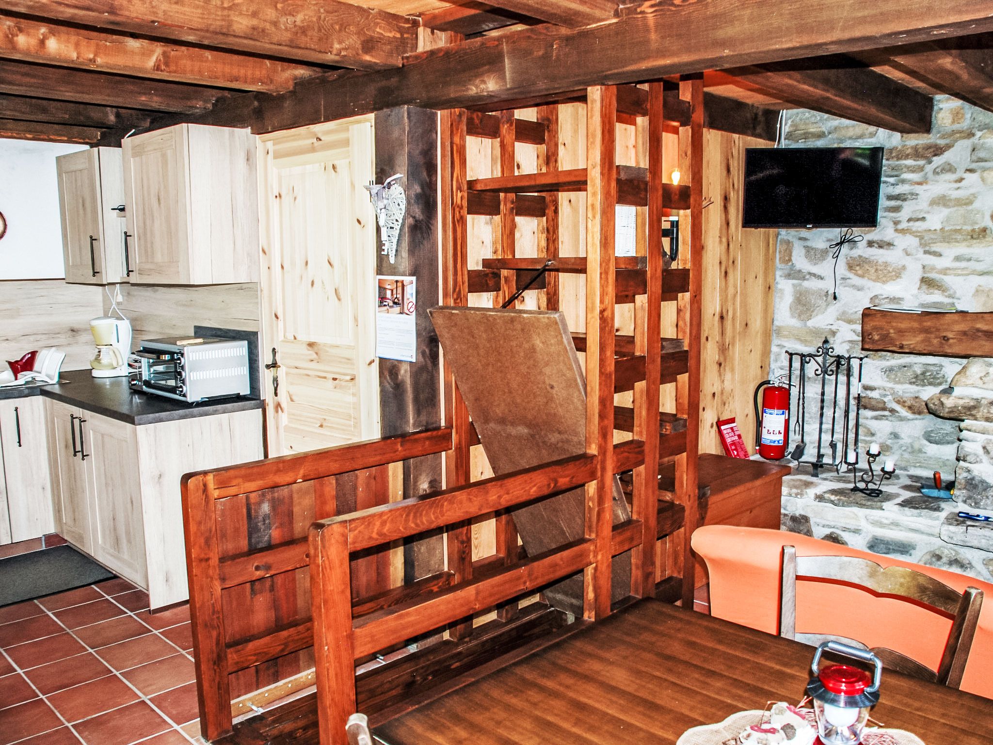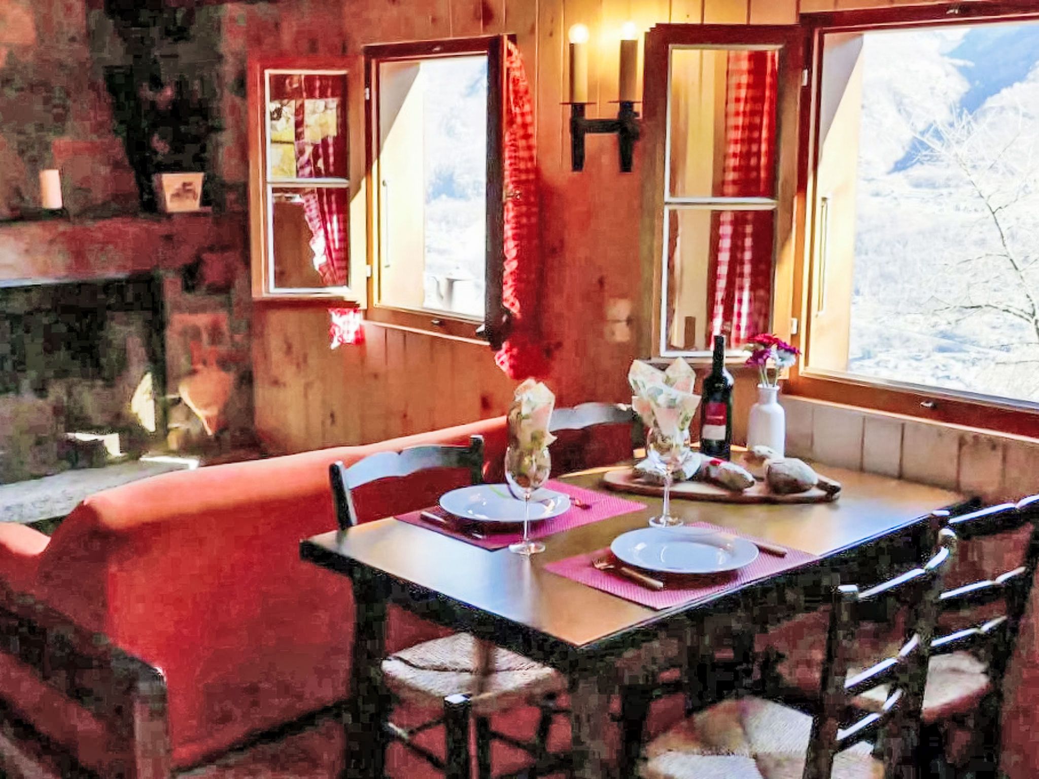 Rustico Fey, 2-Zimmer-Landhaus 50 m2 auf 2 Stockwerken, Südlage. Komfortabel und gemütlich eingerichtet: offenes Wohn-/Esszimmer mit offenem Kamin, Esstisch und TV (Flachbildschirm), Radio. 1 Zimmer mit 2 Betten (90 cm, Länge 200 cm). Offene Küche (Mini-Backofen, Gasherd, 3 Flammen, Toaster, elektrische Kaffeemaschine) mit Bar und Holzofen. Ausgang zum Gartensitzplatz. Unteres Geschoss: (steile Treppe). Dusche/WC. Terrassenmöbel, Gartengrill (mobil), Liegestühle (2). Herrliche Panoramasicht auf die Berge, das Tal und die Landschaft. Zur Verfügung: Kinderhochstuhl, Babybett bis 2 Jahre (extra), Haartrockner. Bitte beachten: Nichtraucher-Haus. Maximal 1 kleines Haustier/Hund erlaubt. Feuerlöscher. NL-