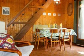 Chalet Al Portic, 4-Zimmer-Haus 60 m2. Rustikal und gemütlich eingerichtet: Wohn-/Esszimmer mit offenem Kamin, Essecke und Sat-TV. Ausgang zum Garten. 1 Doppelzimmer mit 1 Doppelbett (1 x 160 cm, Länge 200 cm). 2 Zimmer, jedes Zimmer mit 1 x 2 Etagenbetten (90 cm, Länge 190 cm). Küche (Backofen, Geschirrspüler, 4 Induktionskochplatten, Toaster, Wasserkocher, elektrische Kaffeemaschine, Fondue Set (Käse)). Dusche/WC. E-Heizung. Grosser Garten. Terrassenmöbel, Gartengrill, Liegestühle (6), Sitzplatz. Schöne Sicht auf die Berge und den Garten. Zur Verfügung: Kinderhochstuhl, Babybett bis 2 Jahre (extra), Haartrockner. Internet (WLAN, gratis). Bitte beachten: Nichtraucher-Haus. Maximal 2 Haustiere/Hunde erlaubt. NL-