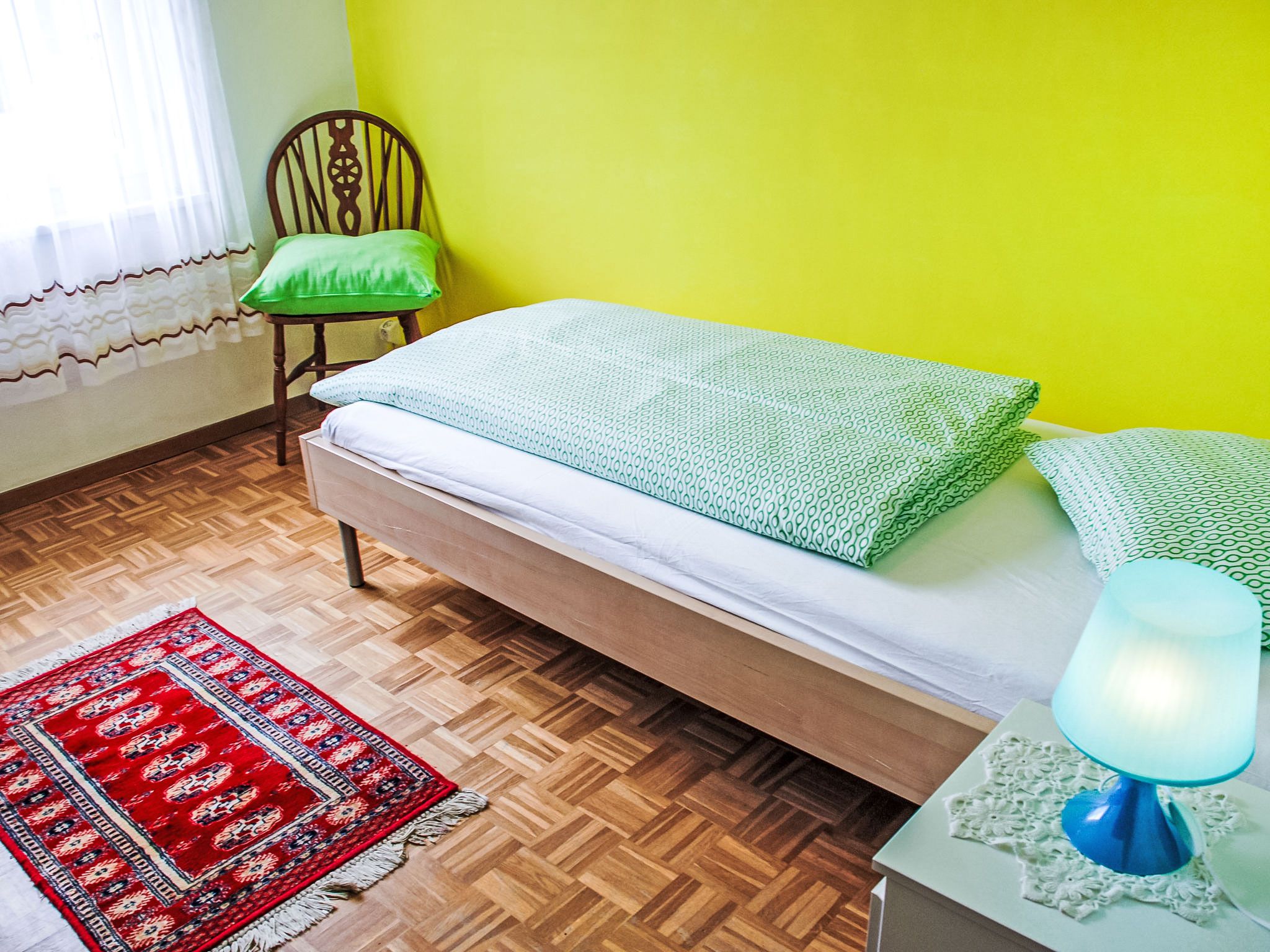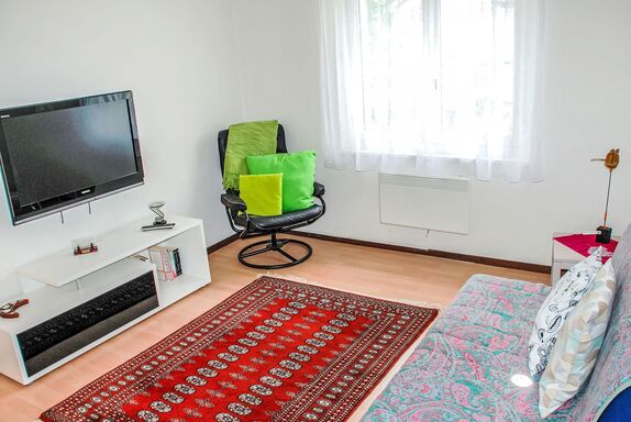 Gemma, 4-Zimmer-Wohnung 70 m2 im 2. Stock. Geräumig und hell, einfach und komfortabel eingerichtet: Wohnzimmer mit 1 Diwanbett, Kabel-TV, Flachbildschirm, Radio und CD. 1 Doppelzimmer mit 1 Doppelbett (1 x 160 cm, Länge 200 cm). 2 Zimmer, jedes Zimmer mit 1 Bett (90 cm, Länge 200 cm). Wohnküche (4 Kochplatten, Backofen, Geschirrspüler, Mikrowelle, elektrische Kaffeemaschine, Kapseln für die Kaffeemaschine (Nespresso) extra, Racletteofen, Fondue Set (Käse)) mit Esstisch. Ausgang zum Balkon. Sitzbad/WC. E-Heizung. Balkon. Balkonmöbel, Gartengrill. Sicht auf die Berge und die Landschaft. Zur Verfügung: Kinderhochstuhl, Babybett bis 3 Jahre (extra), Haartrockner. Internet (Wireless LAN, gratis). Bitte beachten: Nichtraucher-Haus. NL-