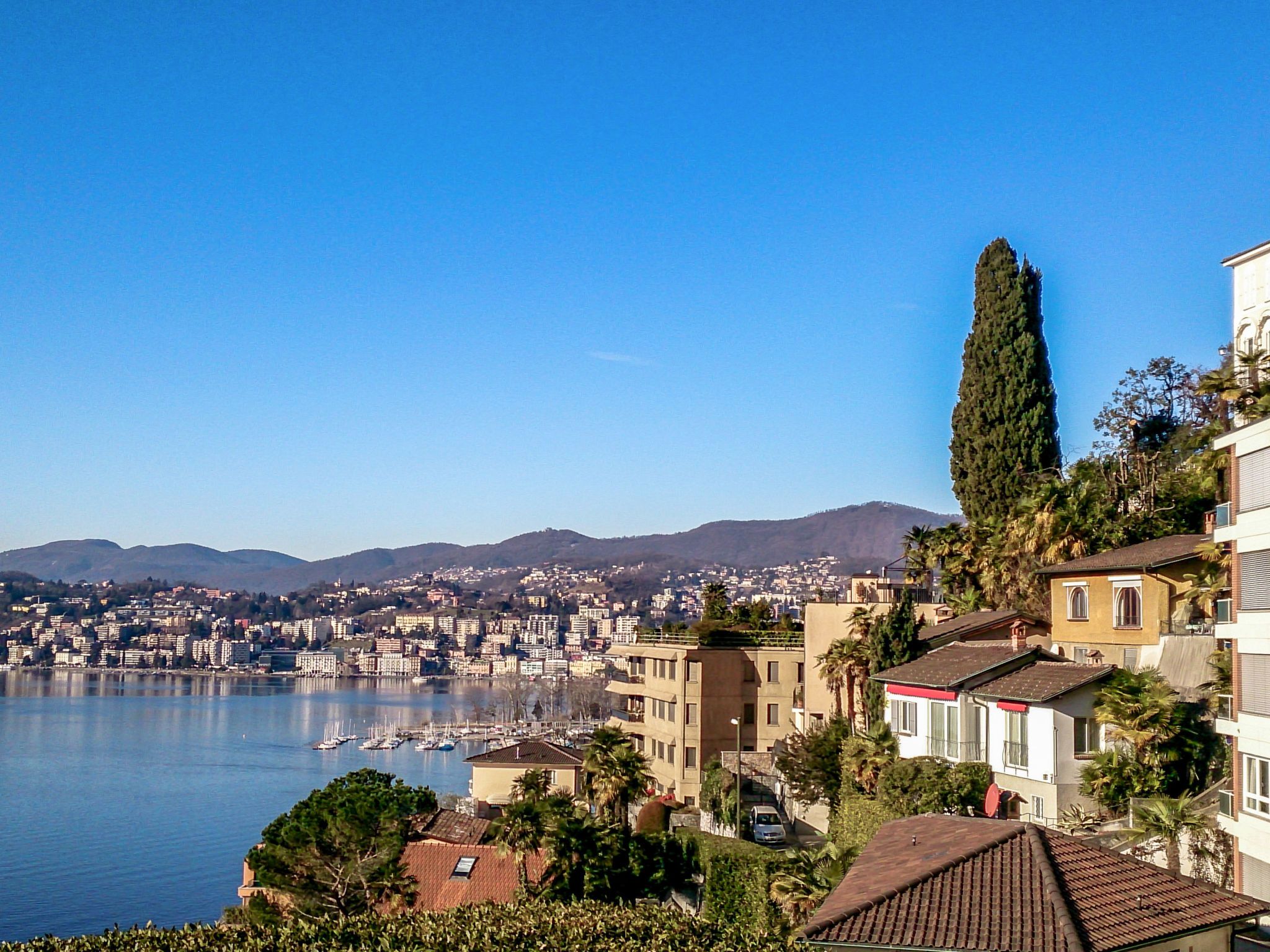 Appartementhaus Castagnola (Utoring). Im Ort, 3 km vom Zentrum von Lugano, ruhige, sonnige Lage am Hang, Richtung Südosten. Im Hause: Empfang, Fahrstuhl, Waschmaschine, Wäschetrockner (zur Mitbenutzung, extra). Zufahrt bis zum Haus. Öffentliche Parkplätze 15 m auf der Strasse extra. Einkaufsgeschäft 1.6 km, Restaurant 200 m, Café 200 m, Zentrum zu Fuss in 20 Minuten erreichbar, Bushaltestelle San Michele 30 m, Bahnstation Lugano SBB-CFF-FFS. Golfplatz (18 Loch) 13 km, Tennis 1.6 km, Minigolf 13 km, Wanderwege ab Haus 10 m. Nahe gelegene Sehenswürdigkeiten: Gandria 2 km, Swiss Miniatur, Melide 10 km, Museum of Chocolat, Caslano 13 km, Outlet Fox Town, Mendrisio 22 km, Lido di Lugano 1.6 km, Mercato: Ponte Tresa IT, Como IT. Bekannte Seen in der Umgebung sind gut erreichbar: Lago di Lugano, Lago di Como, Lago Maggiore. Wandergebiete: Monte Bré, San Salvatore, Monte Tamaro, & Splash and SPA, Malcantone, Monte Lema. Bitte beachten: Weitere Unterkünfte sind buchbar. Ferienwohnung Ref. CH6976.100 befindet sich auf dem gleichen Grundstück. Alle Häuser/Wohnungen sind individuell eingerichtet. Das Appartementhaus steht am Fusse des Monte Bré. Es verfügt über eine wundervolle Sicht auf die Bucht von Lugano und den Monte San Salvatore. (nicht von der Wohnung 208, diese hat keine Sicht auf den See.) Wenige Parkplätze (total 10) sind vorhanden (CHF 56.00/Woche). Achtung: Der Parkplatz kann erst bei Anreise bestätigt und zugeteilt werden. Öffentliche Parkplätze (Blaue Zone, kostenpflichtig) in der Nähe. Wichtig: Die Parkkarte für die Blaue Zone muss bei der Stadt/Polizei bezogen werden (CHF 10.00/Tag, CHF 30.00/Woche, max. 3 Wochen). Informationen vor Ort. Das Einstellen von Fahrrädern ist nicht möglich. Die Buslinie 2 fährt direkt von/bis zum Bahnhof von Lugano bis 200m vor der Residenz!