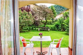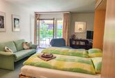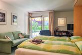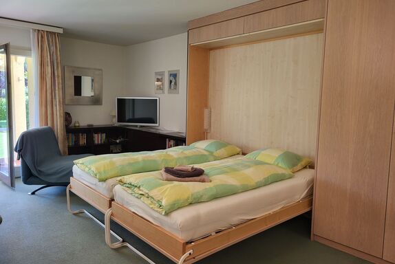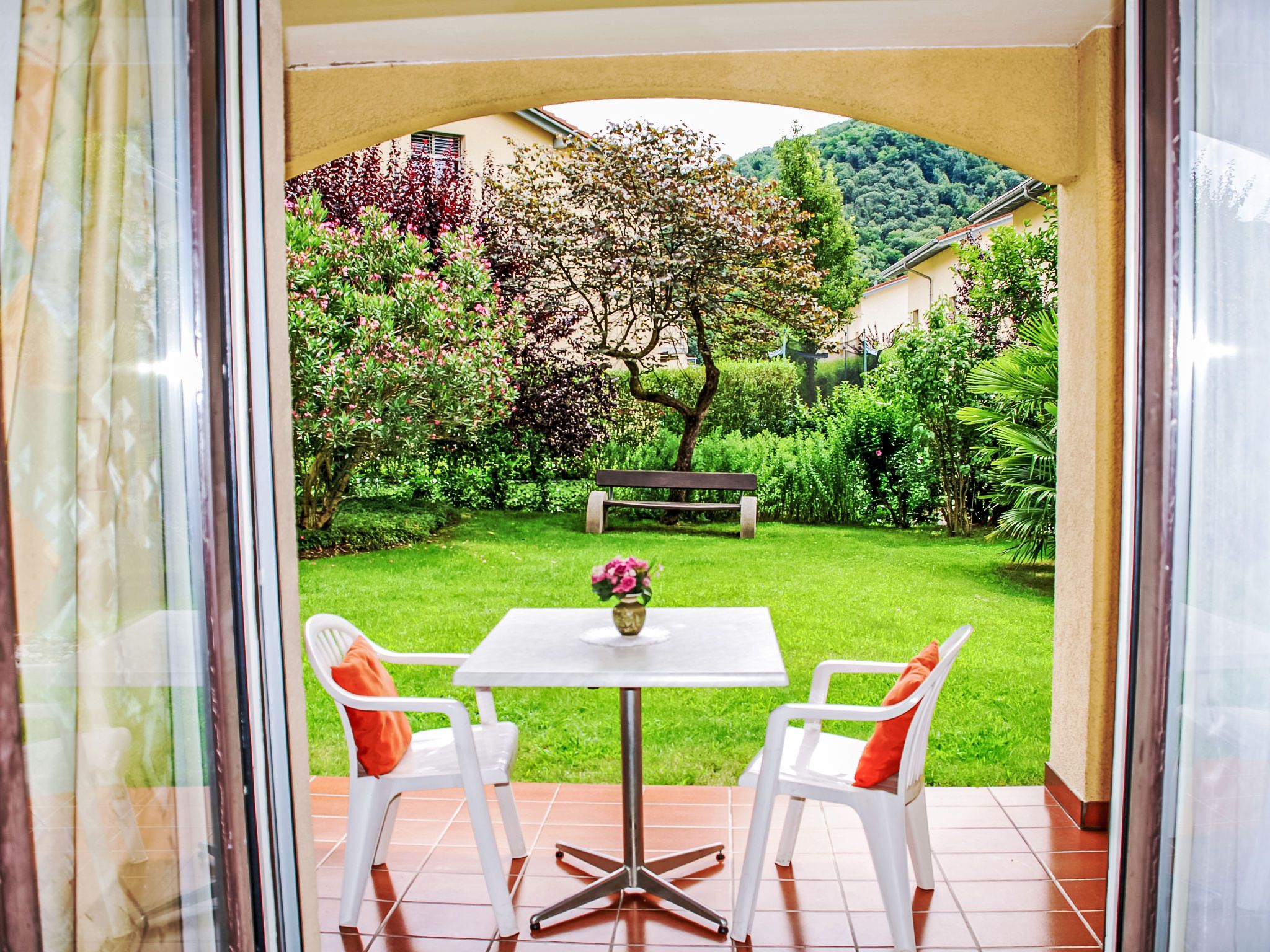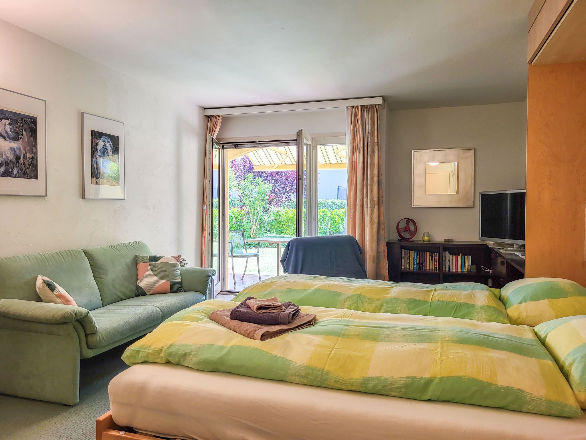 Residenza Parcolago Apt 018 mit Garten, 1-Zimmer-Wohnung 37 m2, im Erdgeschoss. Objekt geeignet für 2 Erwachsene + 1 Kind. Komfortabel und gemütlich eingerichtet: offenes Wohn-/Esszimmer mit 1 Doppelwandschrankbett (2 x 90 cm, Länge 200 cm), 1 Klappbett (90 cm, Länge 200 cm), Essecke und Kabel-TV (Flachbildschirm), Radio. Ausgang zum Gartensitzplatz. Kochnische im Eingang (2 Kochplatten). Bad/WC. Heizung. Grosser Gartensitzplatz. Terrassenmöbel, Liegestühle (2). Sicht auf den Garten. Zur Verfügung: Kinderhochstuhl, Babybett bis 2 Jahre (extra), Haartrockner. Parkplatz Nr. App. 029 (Aussen PP) beim Haus. Bitte beachten: Nichtraucher-Unterkunft. Sonnenstoren. Die Wohnung befindet sich neben dem Restaurant. NL-