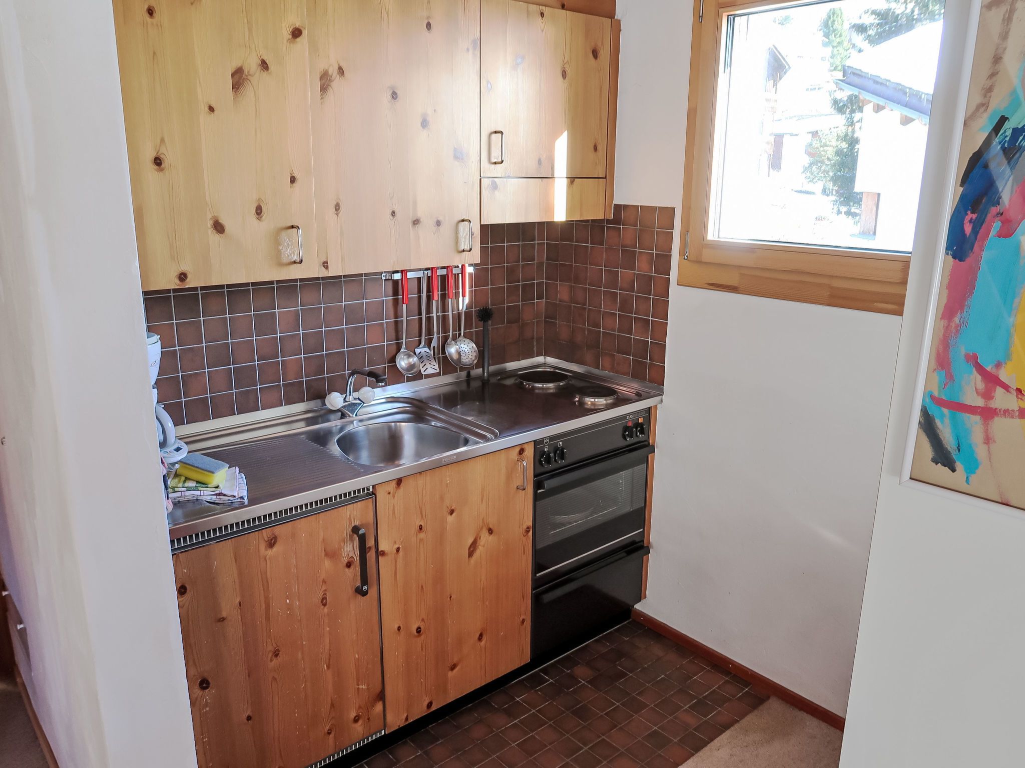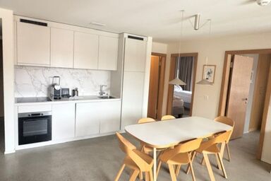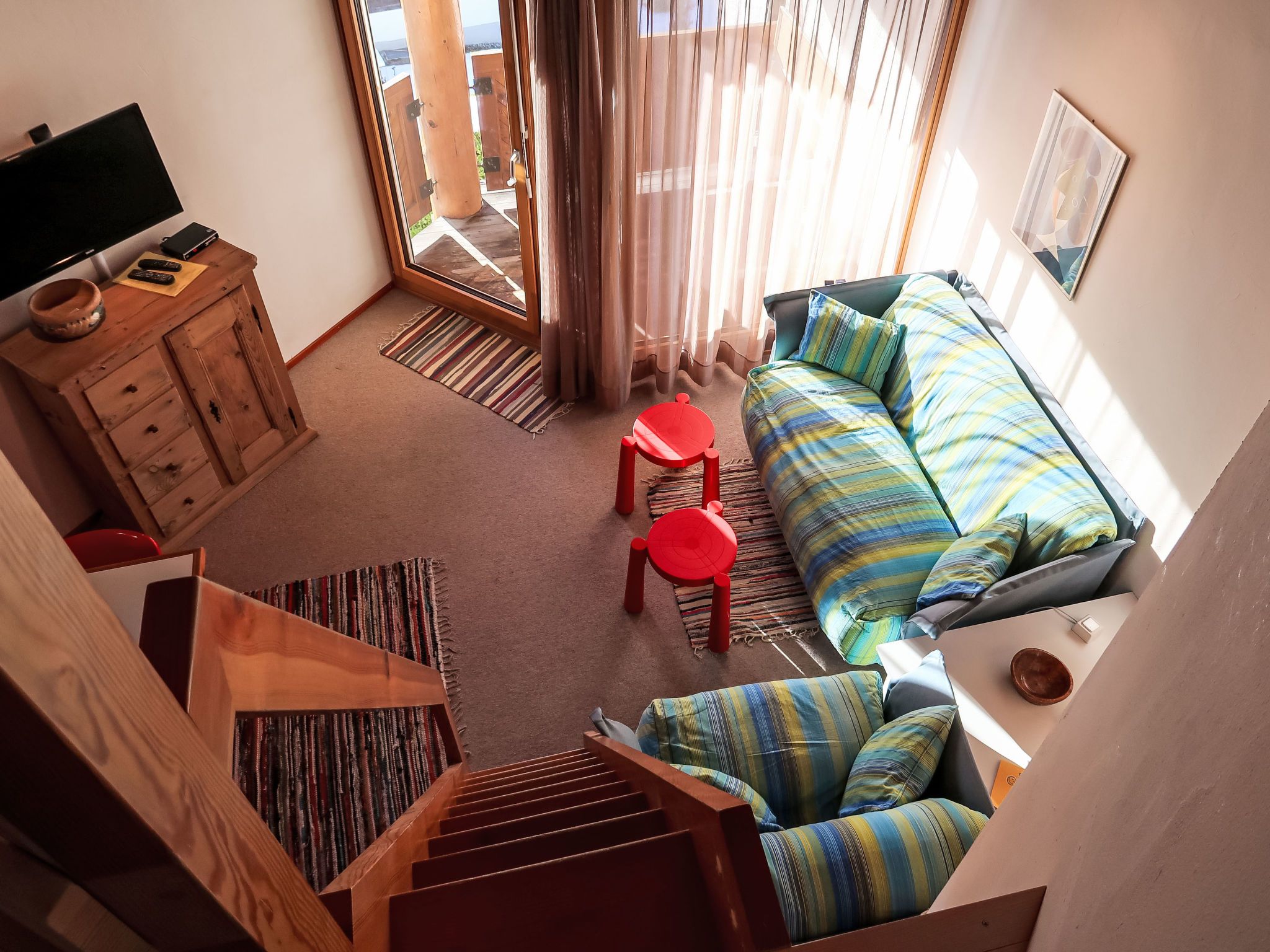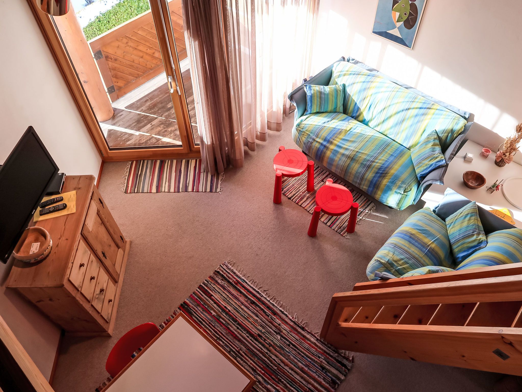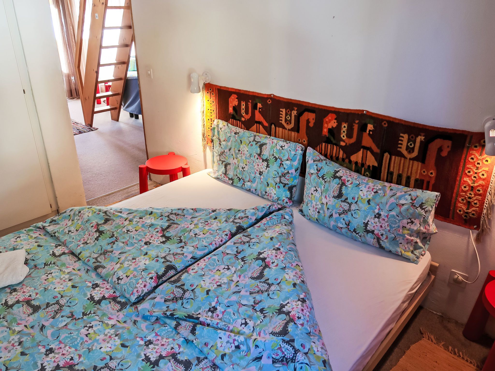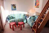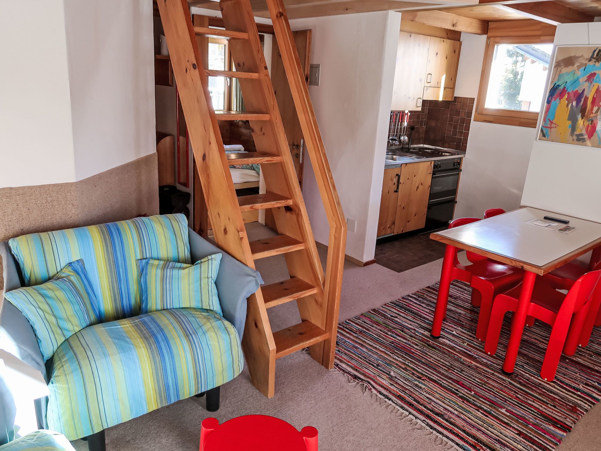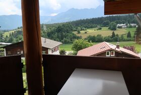 2-Zimmer-Wohnung 43 m2 im 3. Stock. Komfortabel und gemütlich eingerichtet: Wohn-/Esszimmer mit Kabel-TV (Flachbildschirm), Radio. Ausgang zum Balkon. 1 Zimmer mit 1 Doppelbett. Abgeschrägte, offene kleine Galerie mit 2 Betten. Offene Küche (2 Kochplatten, Backofen) mit Esstisch. Dusche/WC. Balkon, Südlage und Ostlage. Terrassenmöbel. Schöne Sicht auf die Berge und die Landschaft. Zur Verfügung: Babybett. Internet (Wireless LAN, gratis). Parkplatz Nr. 15 in 30 m. Anstelle eines abgeschlossenen Schlafzimmers befinden sich manche Schlafplätze in einem offenen Bereich (Galerie, Nische etc.).