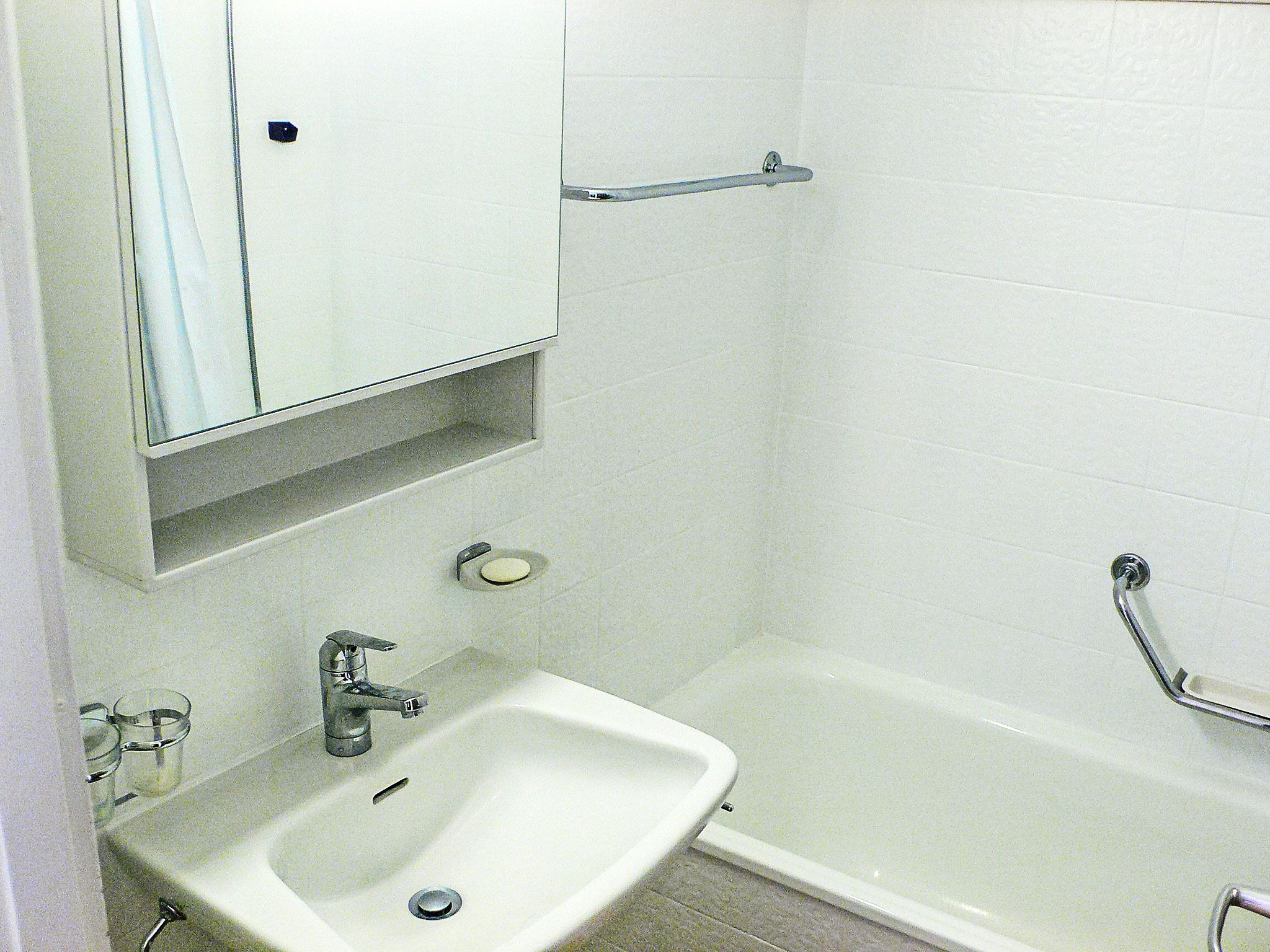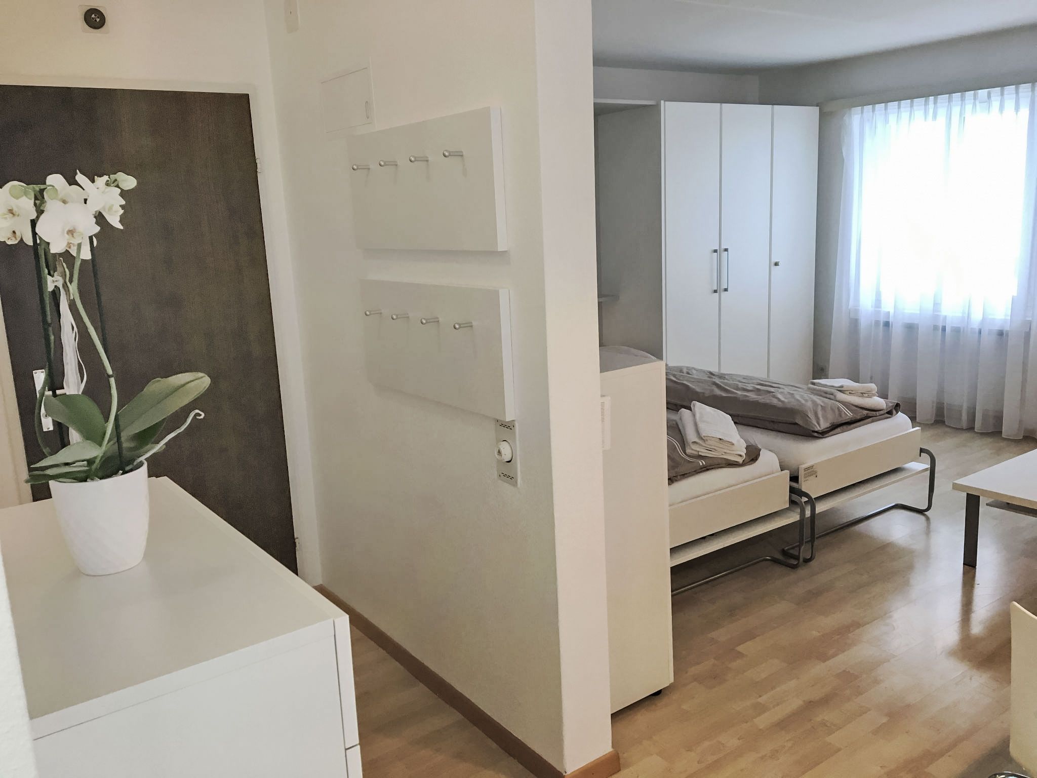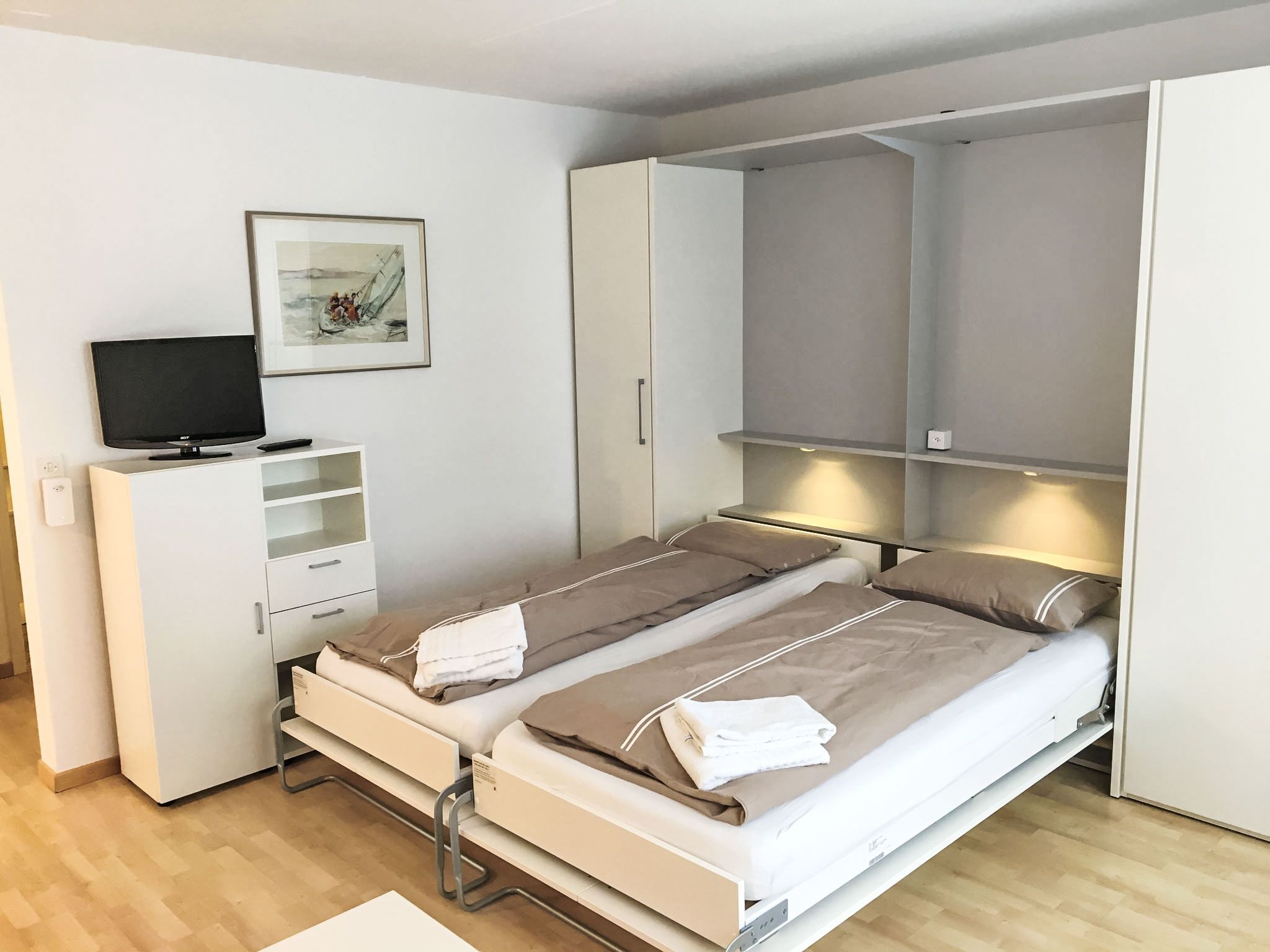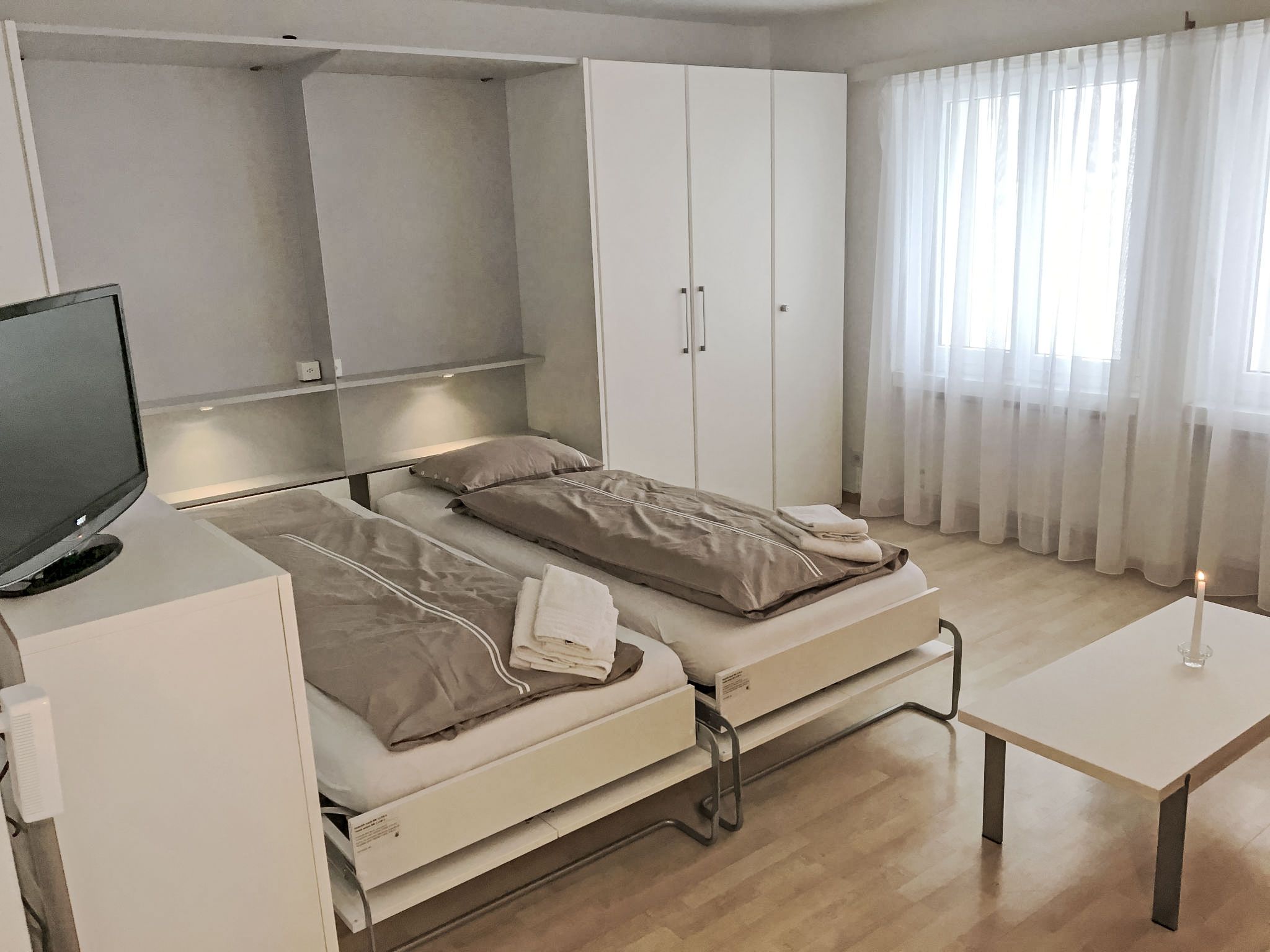 1-Zimmer-Wohnung 32 m2, Nordwestlage. Komfortabel und gemütlich eingerichtet: Wohn-/Esszimmer mit 2 Wandschrankbetten und Sat-TV (Flachbildschirm), Radio und CD. Ausgang zum Balkon. Kochnische (Backofen, 4 Glaskeramikplatten) mit Esstisch. Bad/WC. Kleiner Balkon, Nordlage und Westlage. Eingeschränkte Sicht auf die Berge und die Landschaft. Zur Verfügung: Internet (Wireless LAN, gratis). Garage Nr. 7-5 beim Haus, Höhe 194 cm. Bitte beachten: Nichtraucher-Unterkunft. Im Winter keine Skis und Skischuhe in der Wohnung erlaubt.