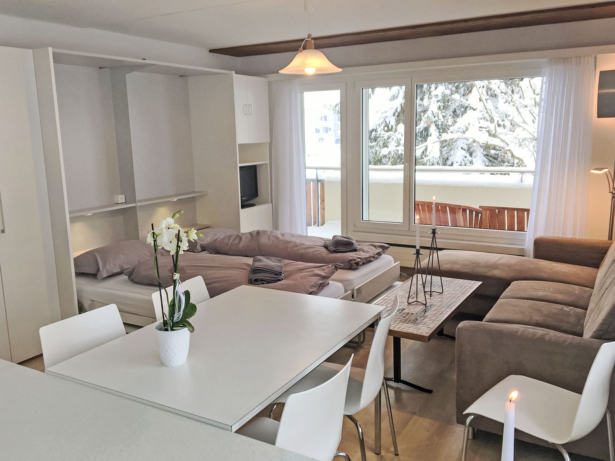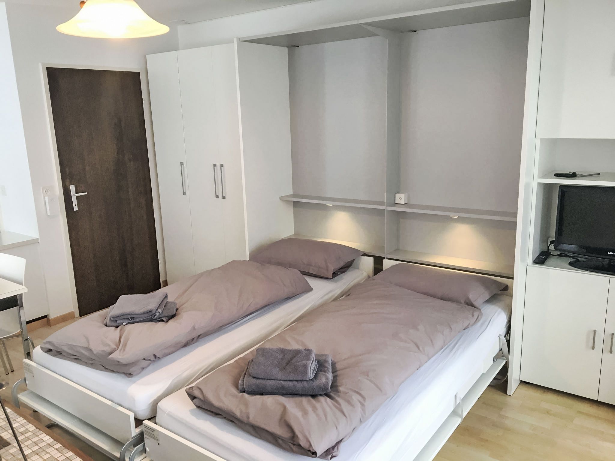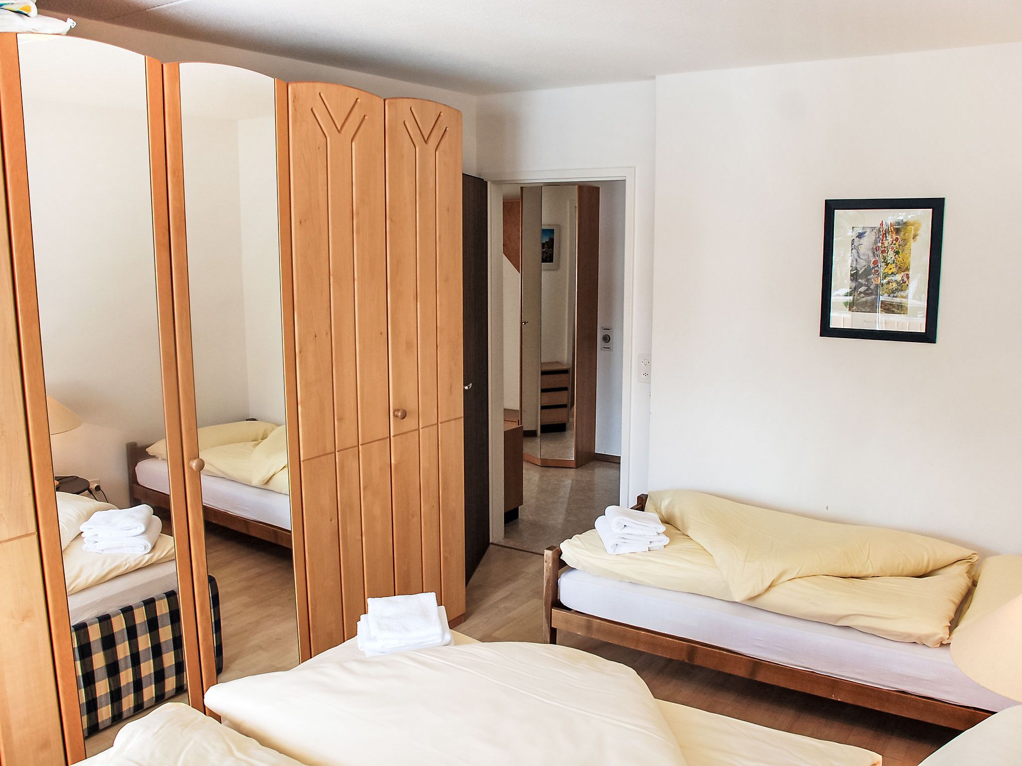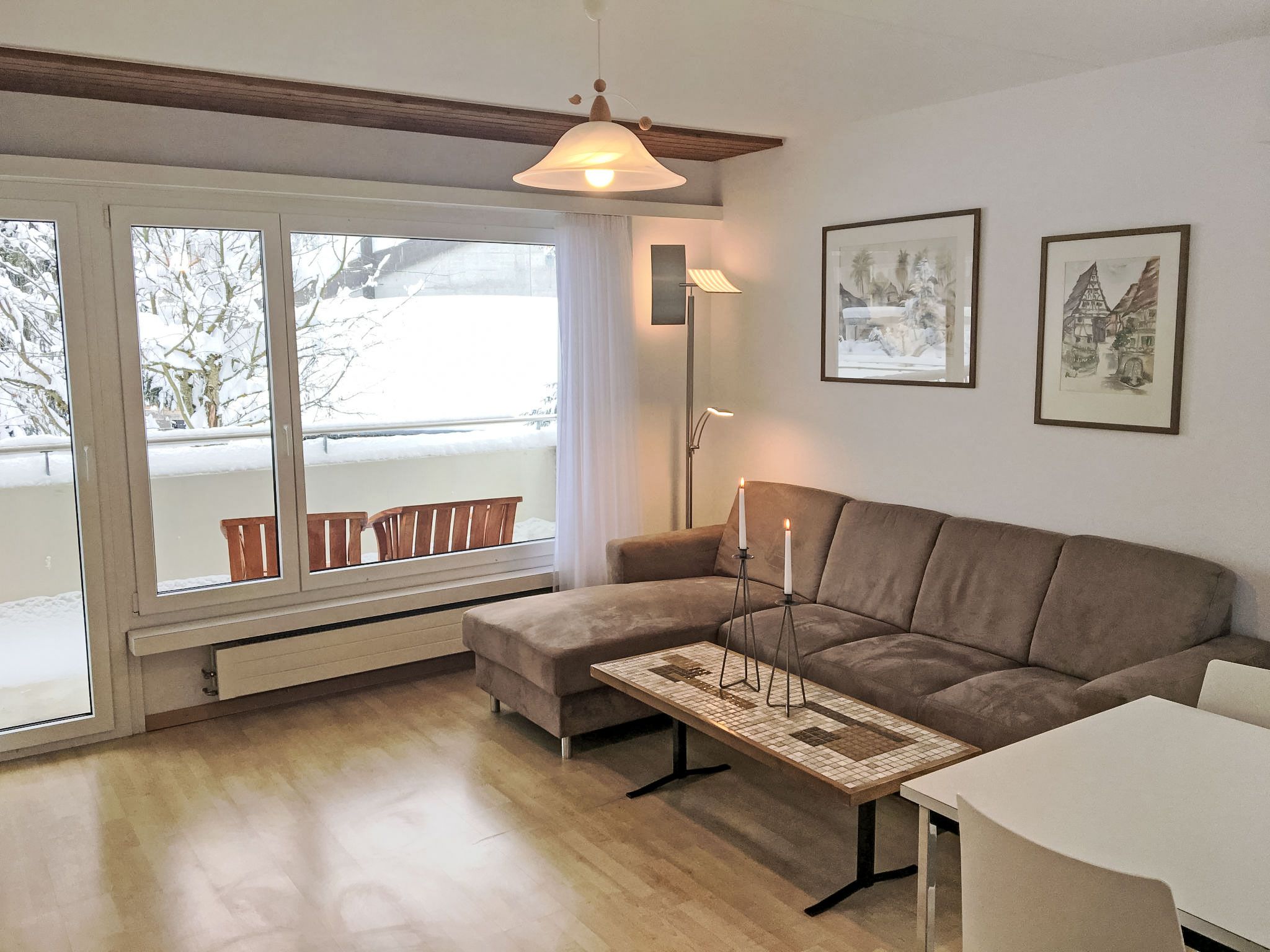 2-Zimmer-Wohnung 50 m2 im 1. Stock, Südlage. Hell, komfortabel und gemütlich eingerichtet: offenes grosses Wohn-/Schlafzimmer mit 1 Doppelwandschrankbett (2 x 90 cm, Länge 200 cm), Esstisch, Sat-TV und Flachbildschirm. Ausgang zum Balkon. 1 Doppelzimmer mit 1 Bett (90 cm, Länge 200 cm), 1 Doppelbett (2 x 90 cm, Länge 200 cm). Ausgang zum Balkon. Offene Küche (Geschirrspüler, 4 Glaskeramikplatten, Fondue Set (Käse)). Bad/WC. Balkon 14 m2. Schöne Sicht auf die Berge und die Landschaft. Zur Verfügung: Kinderhochstuhl. Internet (Wireless LAN, gratis). Garage Nr. 7-6 beim Haus, Höhe 194 cm. Bitte beachten: Nichtraucher-Unterkunft. Im Winter keine Skis und Skischuhe in der Wohnung erlaubt. 571 687.68.266.151