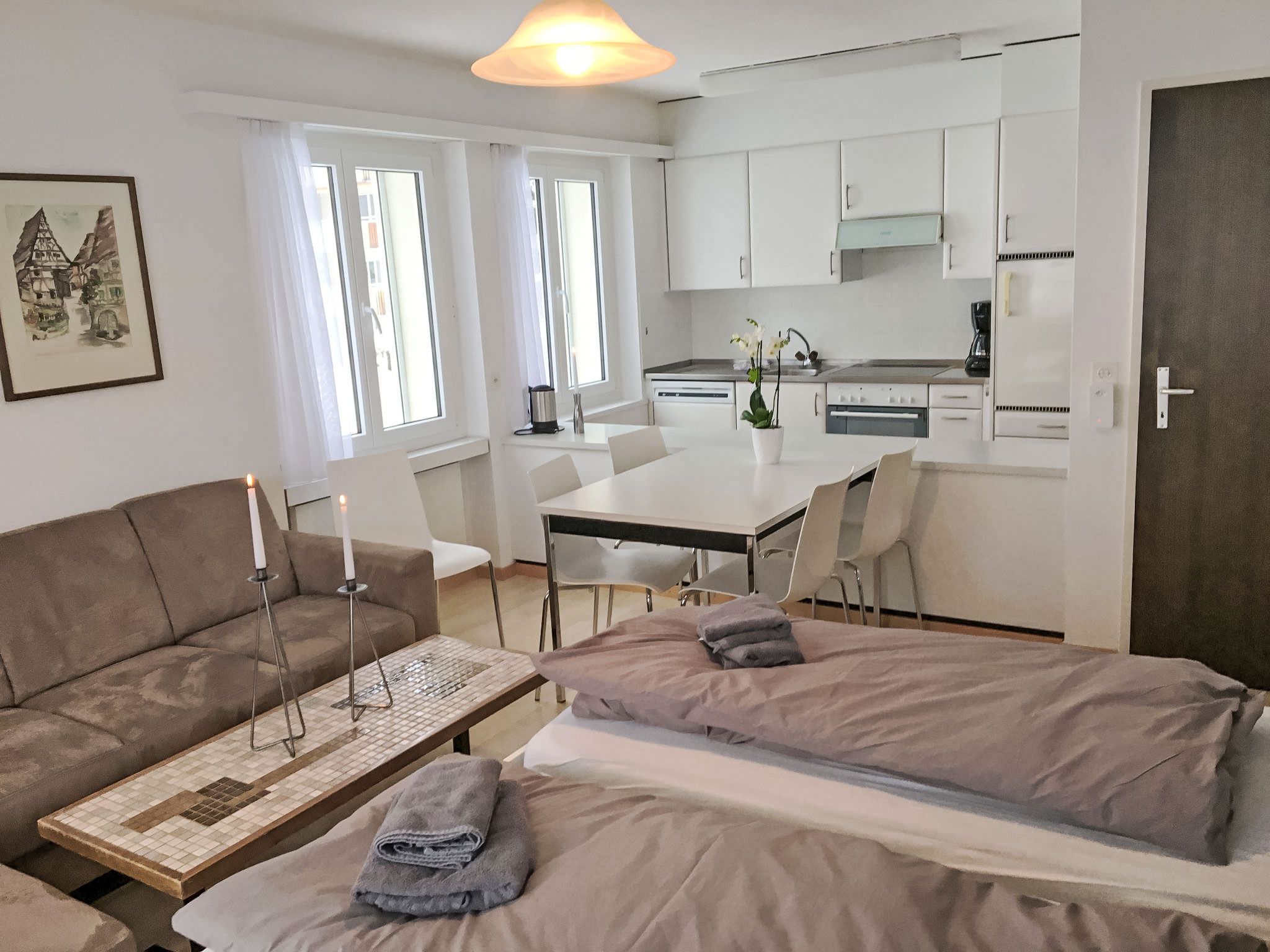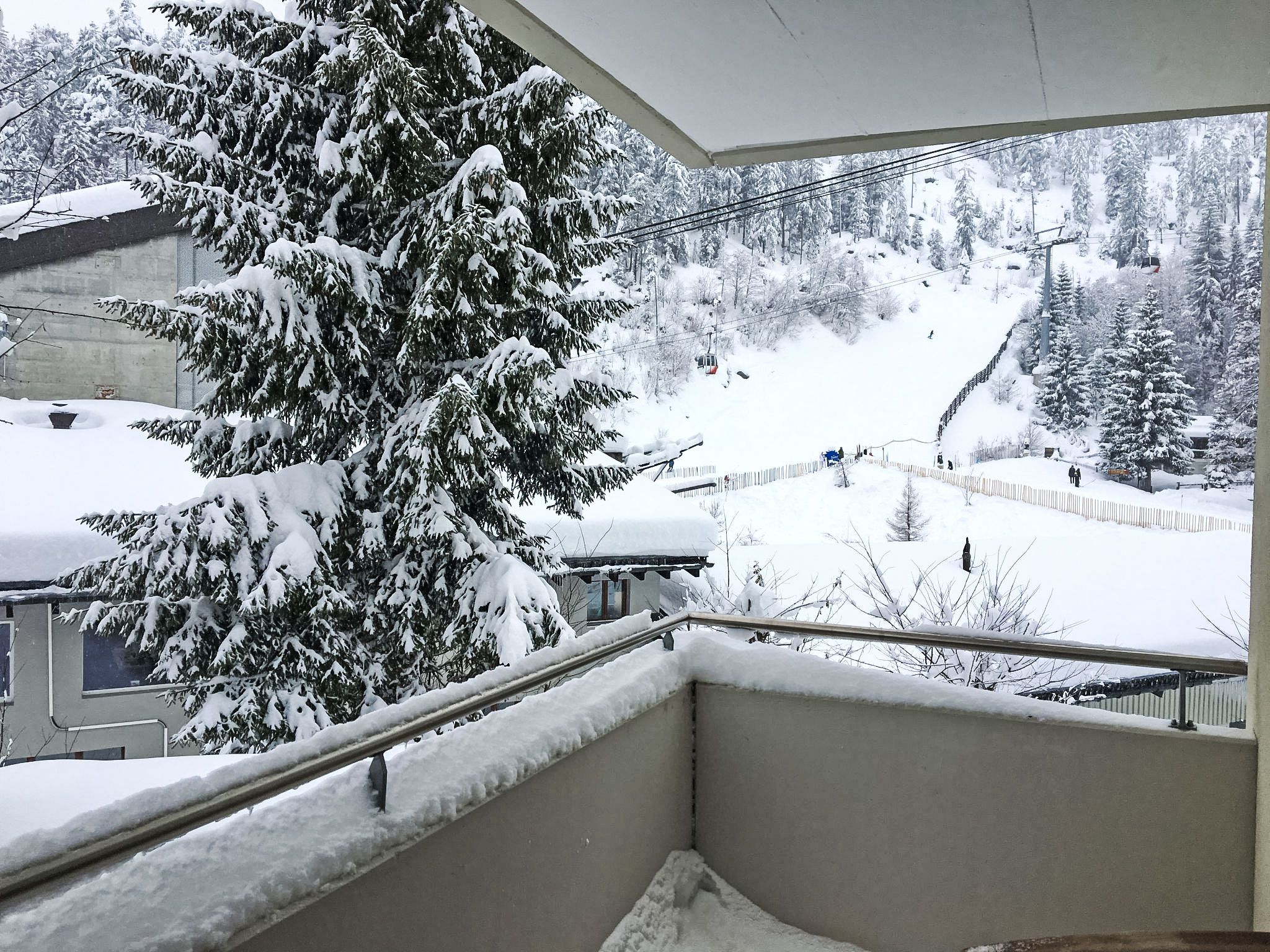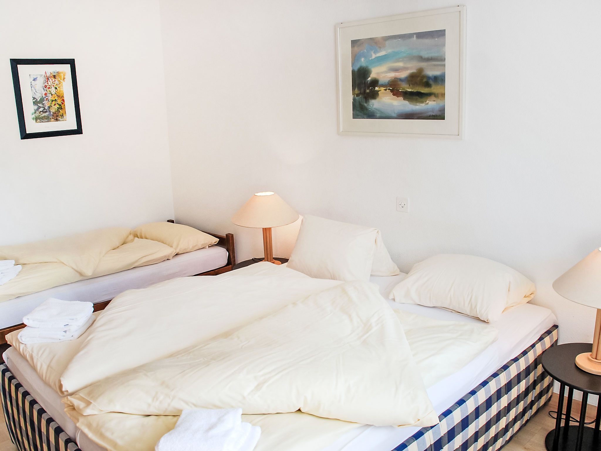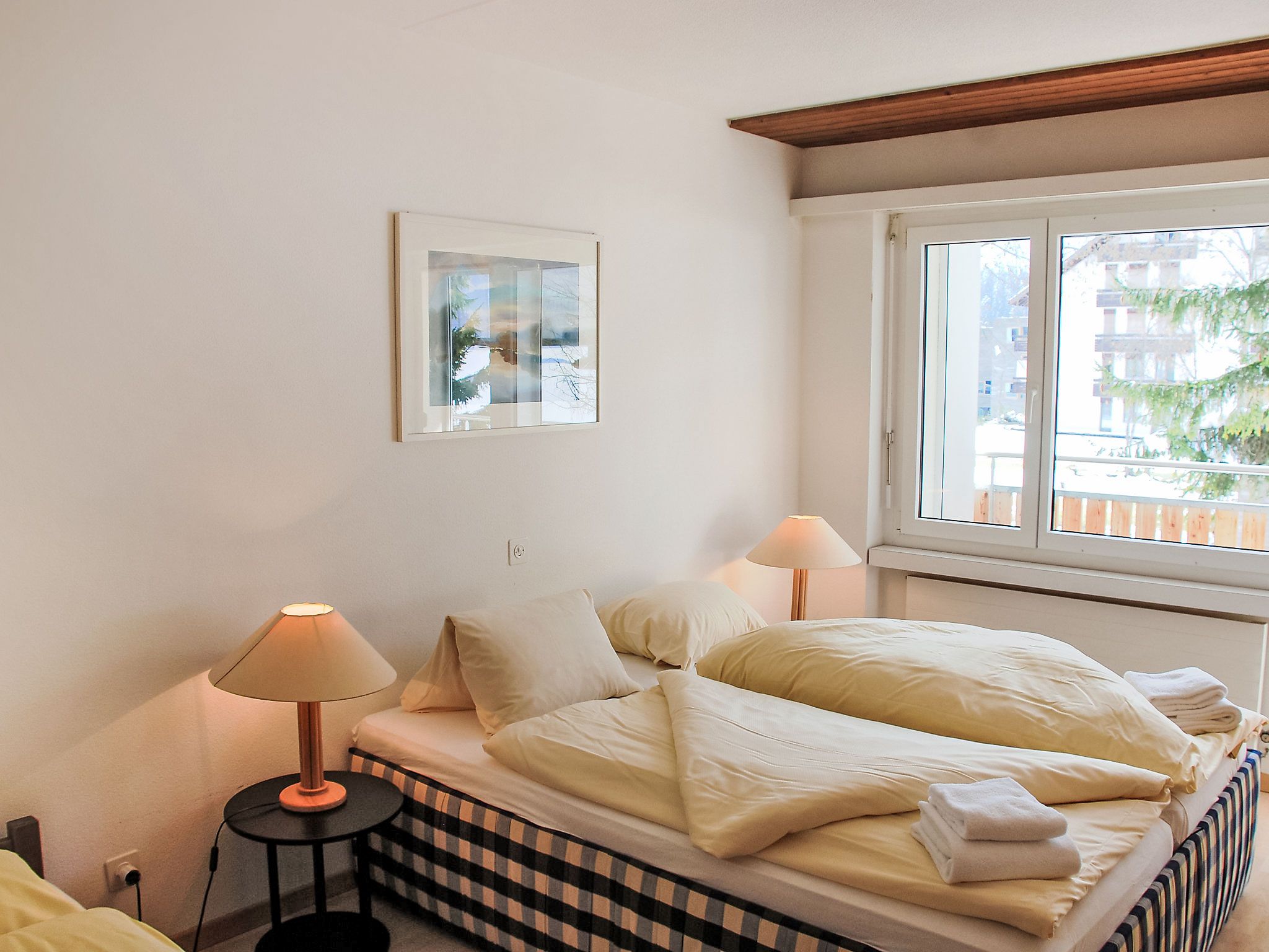 2-Zimmer-Wohnung 50 m2 im 1. Stock, Südlage. Hell, komfortabel und gemütlich eingerichtet: offenes grosses Wohn-/Schlafzimmer mit 1 Doppelwandschrankbett (2 x 90 cm, Länge 200 cm), Esstisch, Sat-TV und Flachbildschirm. Ausgang zum Balkon. 1 Doppelzimmer mit 1 Bett (90 cm, Länge 200 cm), 1 Doppelbett (2 x 90 cm, Länge 200 cm). Ausgang zum Balkon. Offene Küche (Geschirrspüler, 4 Glaskeramikplatten, Fondue Set (Käse)). Bad/WC. Balkon 14 m2. Schöne Sicht auf die Berge und die Landschaft. Zur Verfügung: Kinderhochstuhl. Internet (Wireless LAN, gratis). Garage Nr. 7-6 beim Haus, Höhe 194 cm. Bitte beachten: Nichtraucher-Unterkunft. Im Winter keine Skis und Skischuhe in der Wohnung erlaubt. 571 687.68.266.151
