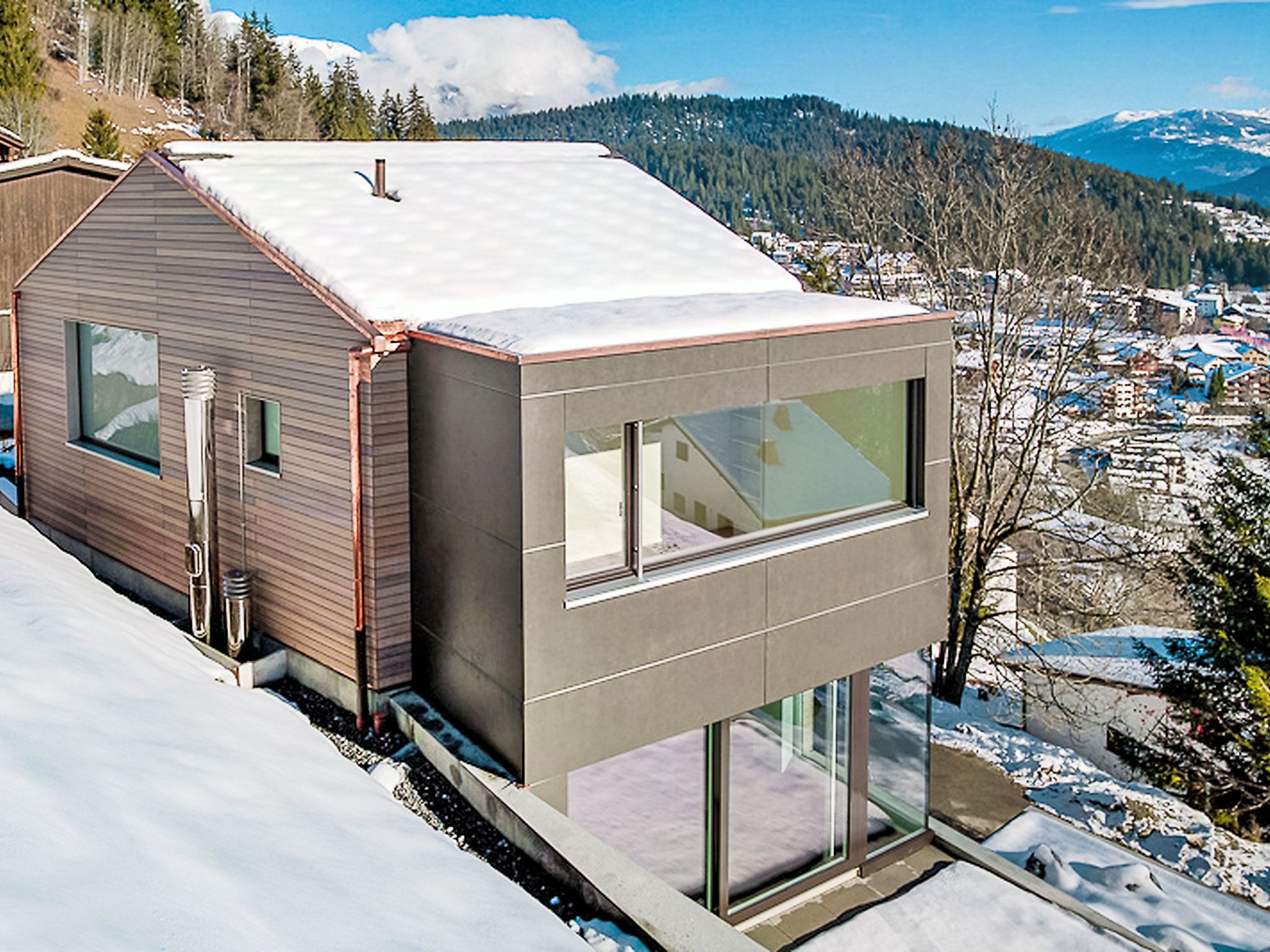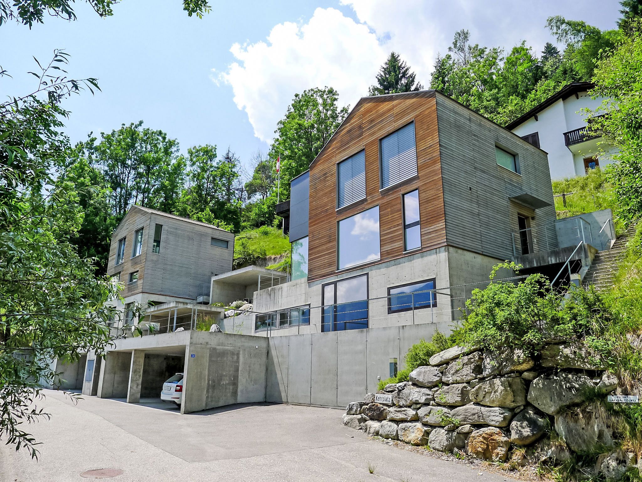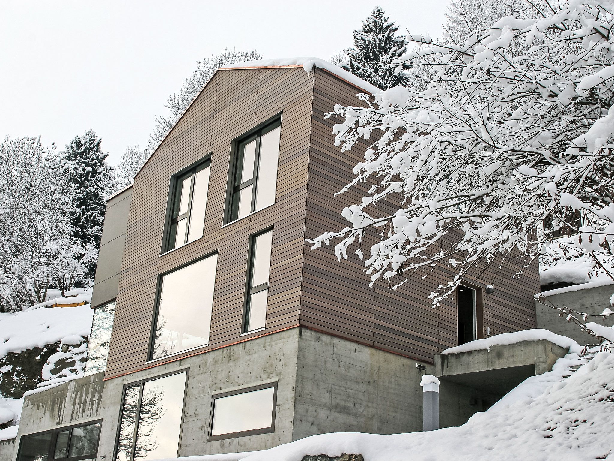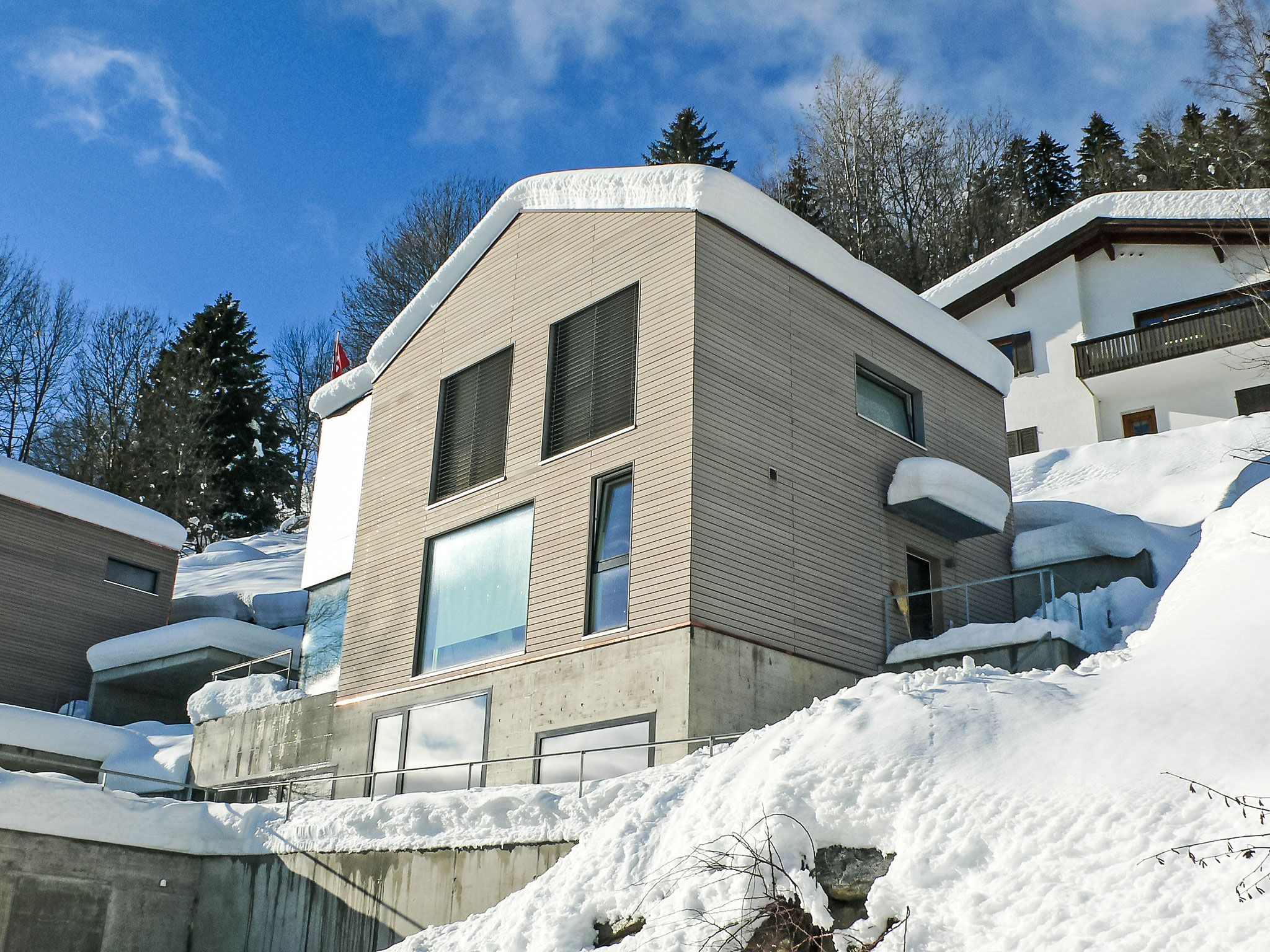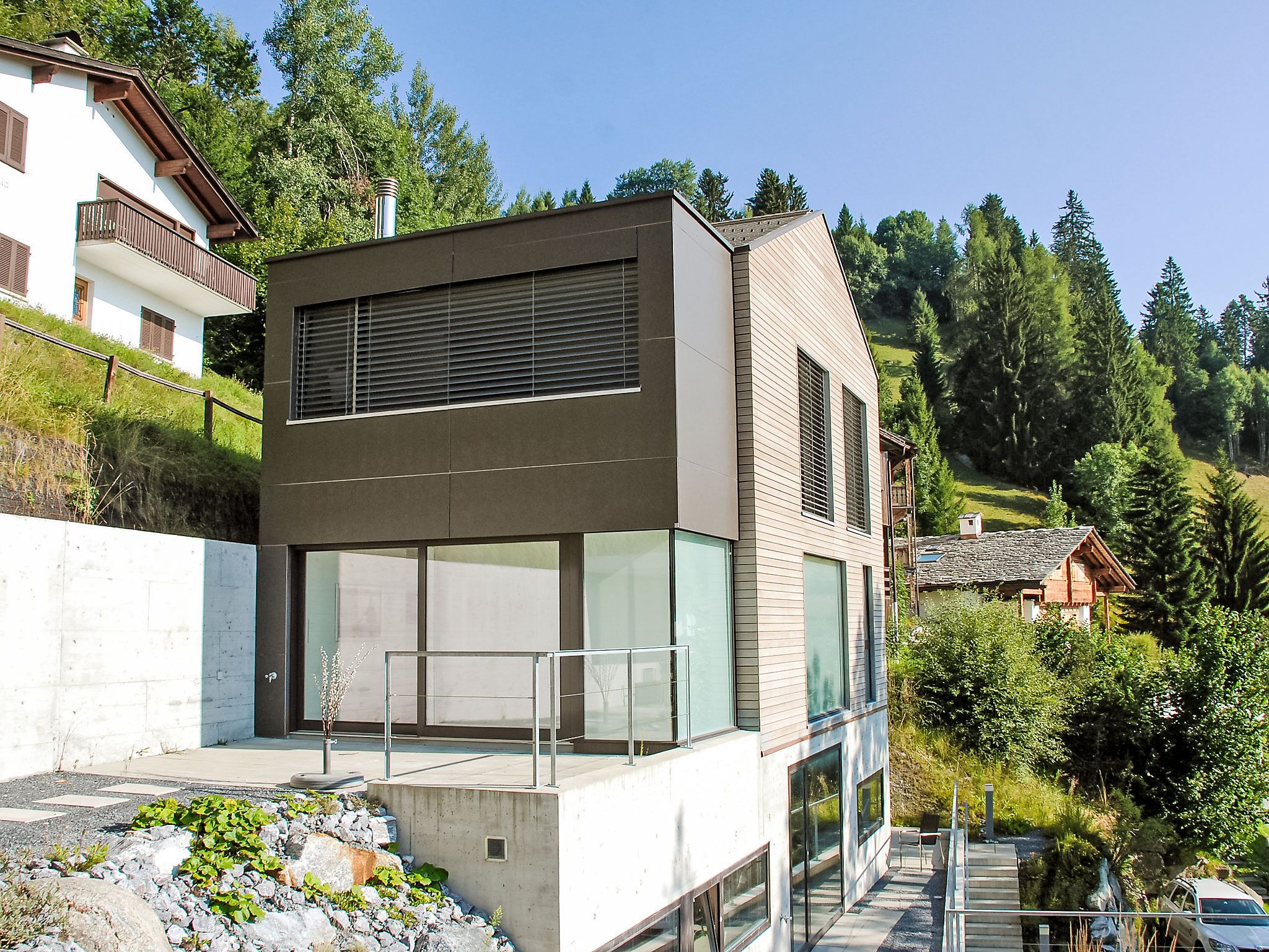 Modernes, schönes, luxuriöses Zweifamilienhaus Melina, Baujahr 2009. Am Ortsrand, alleinstehende, ruhige, sonnige Lage am Hang, in einer Sackgasse, im Grünen. Zur Mitbenutzung: Grill. Im Hause: Zentralheizung. Schmale Zufahrt bis zum Haus. Treppenweg (15 Stufen) bis zum Haus. Einzelgarage. Einkaufsgeschäft 500 m, Lebensmittelgeschäft, Restaurant, Bushaltestelle 200 m, Freibad. Golfplatz (18 Loch) 5 km, Tennis 2.5 km, Luftseilbahn 2.5 km, Skilift 2.5 km, Skischule 2.5 km, Langlaufloipe 500 m.