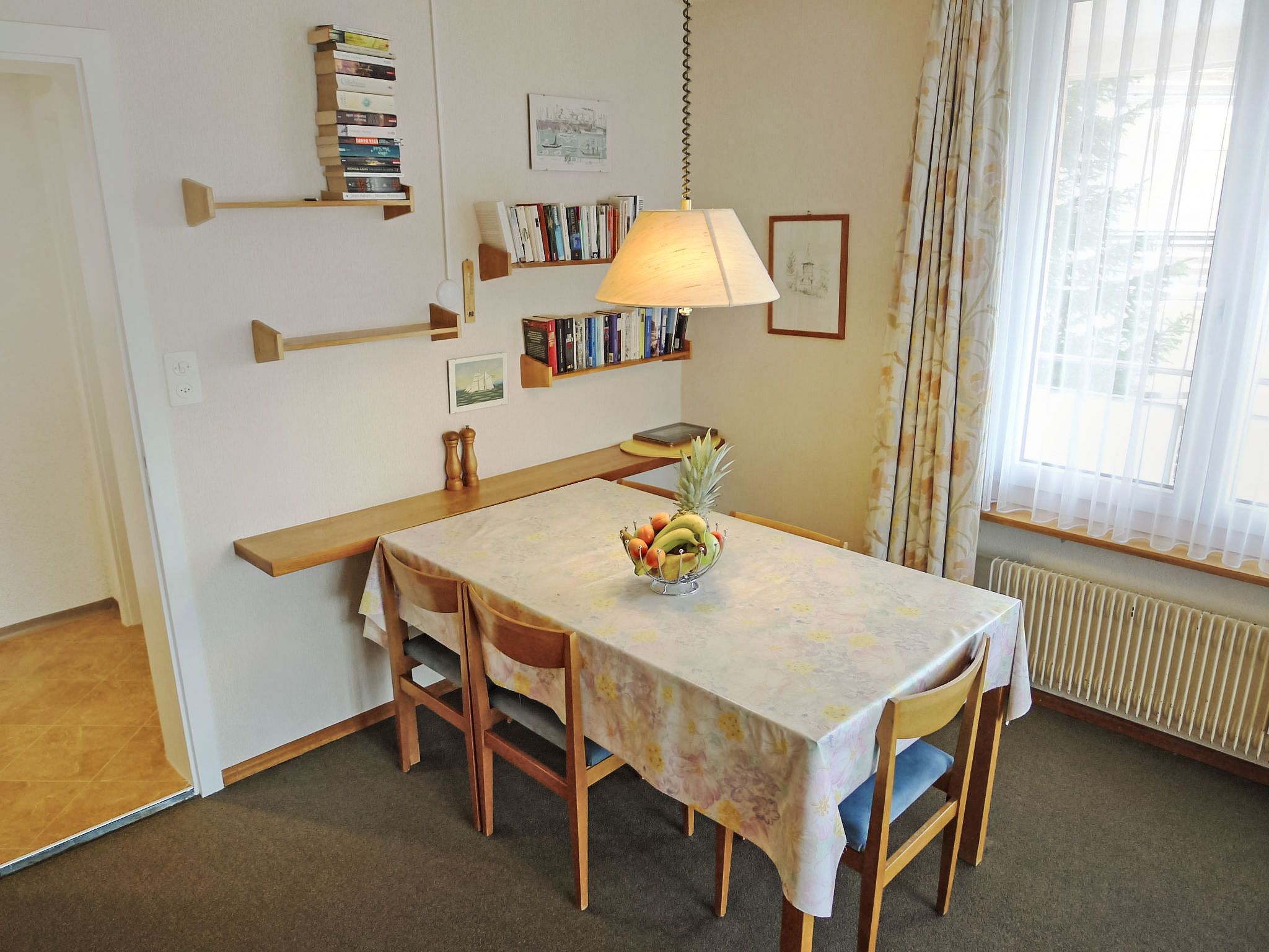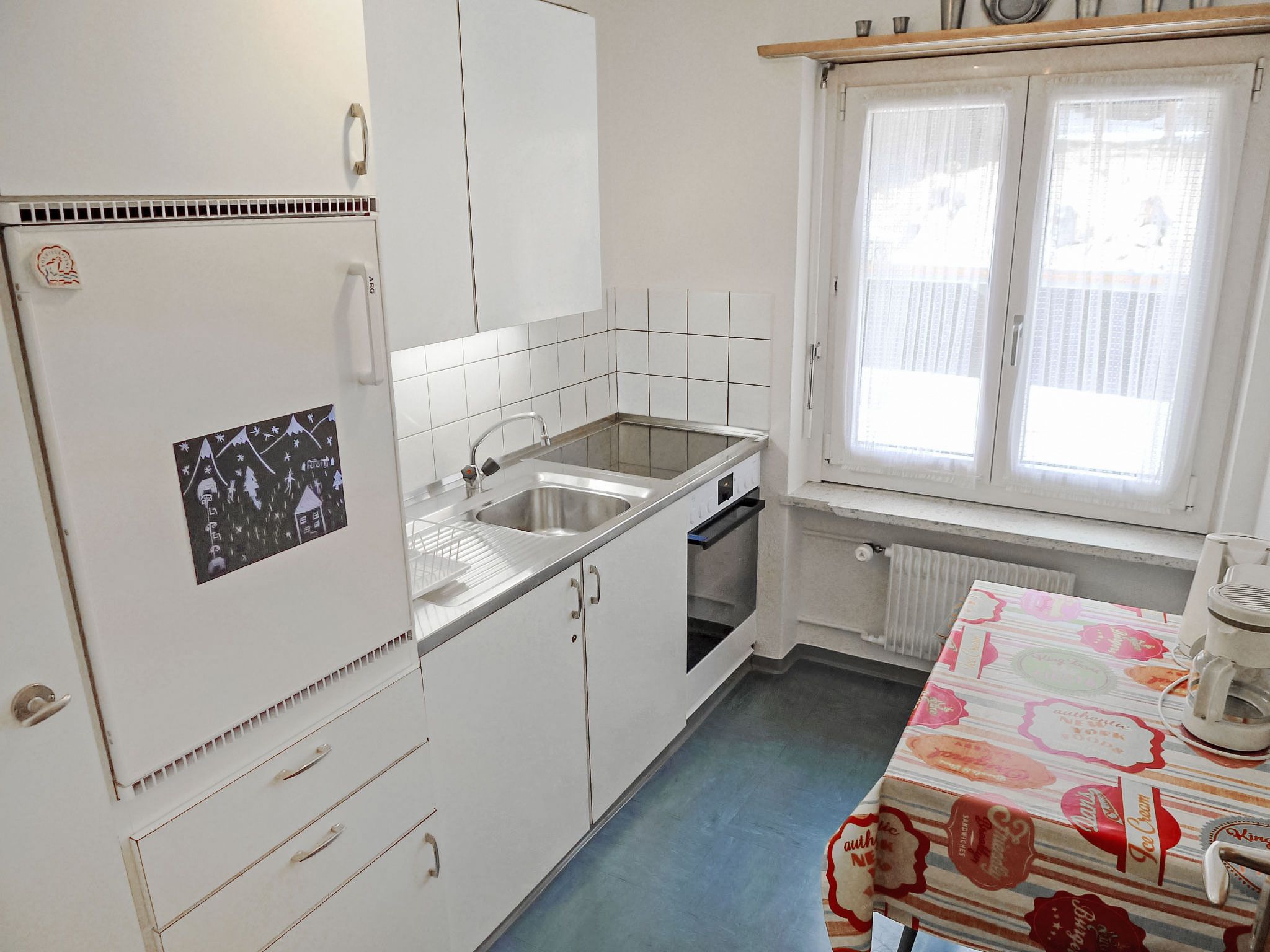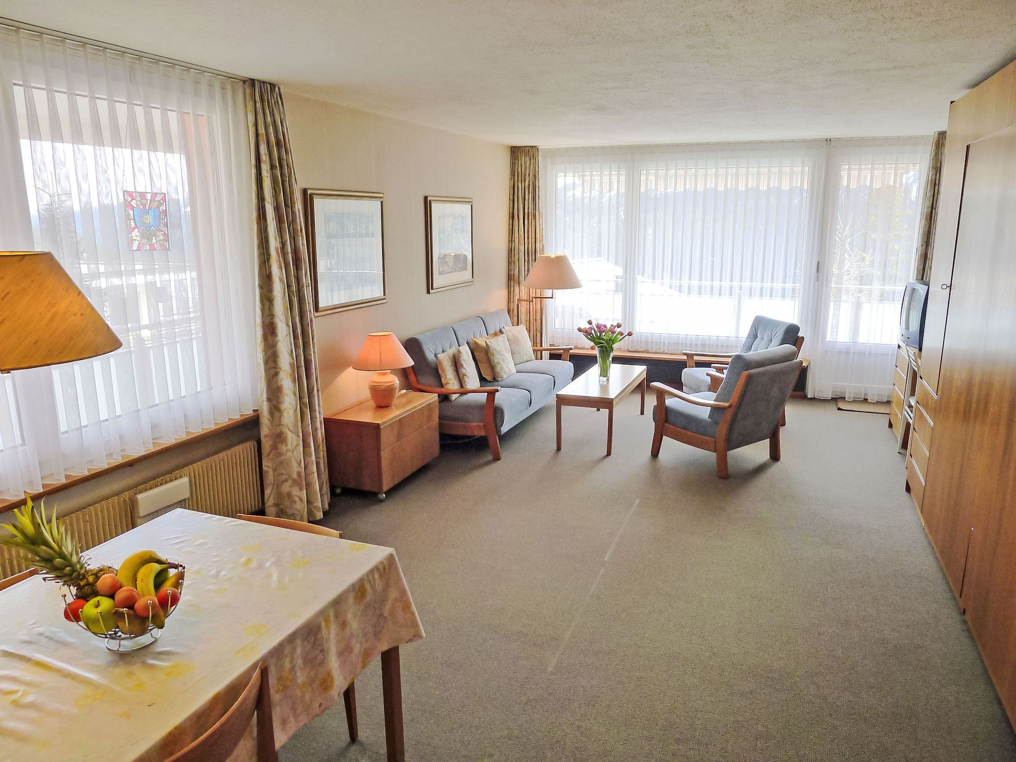 2-Zimmer-Wohnung 57 m2 im 1. Stock. Gemütlich eingerichtet: Wohn-/Esszimmer mit 2 Wandschrankbetten, Sat-TV und Radio. Ausgang zum Balkon. 1 Zimmer mit 2 Betten. Küche (Backofen, Geschirrspüler, 4 Glaskeramikplatten, Toaster) mit Esstisch. Bad/Bidet/WC. Balkon, Nordlage und Ostlage. Balkonmöbel. Schöne Sicht auf die Berge, die Landschaft und die Ortschaft. Zur Verfügung: Internet (Wireless LAN, gratis). Bitte beachten: Nichtraucher-Unterkunft.