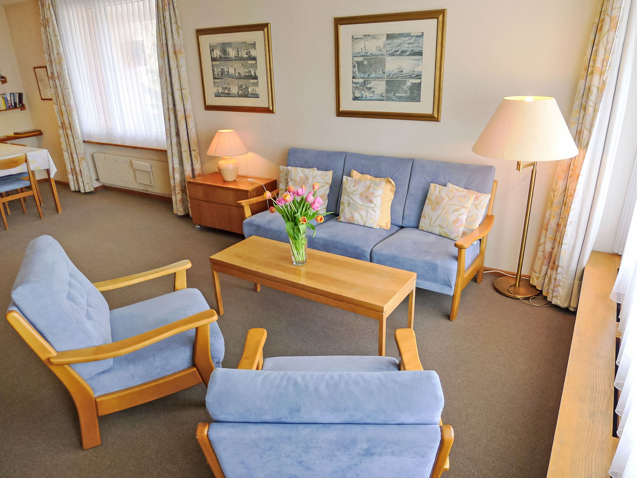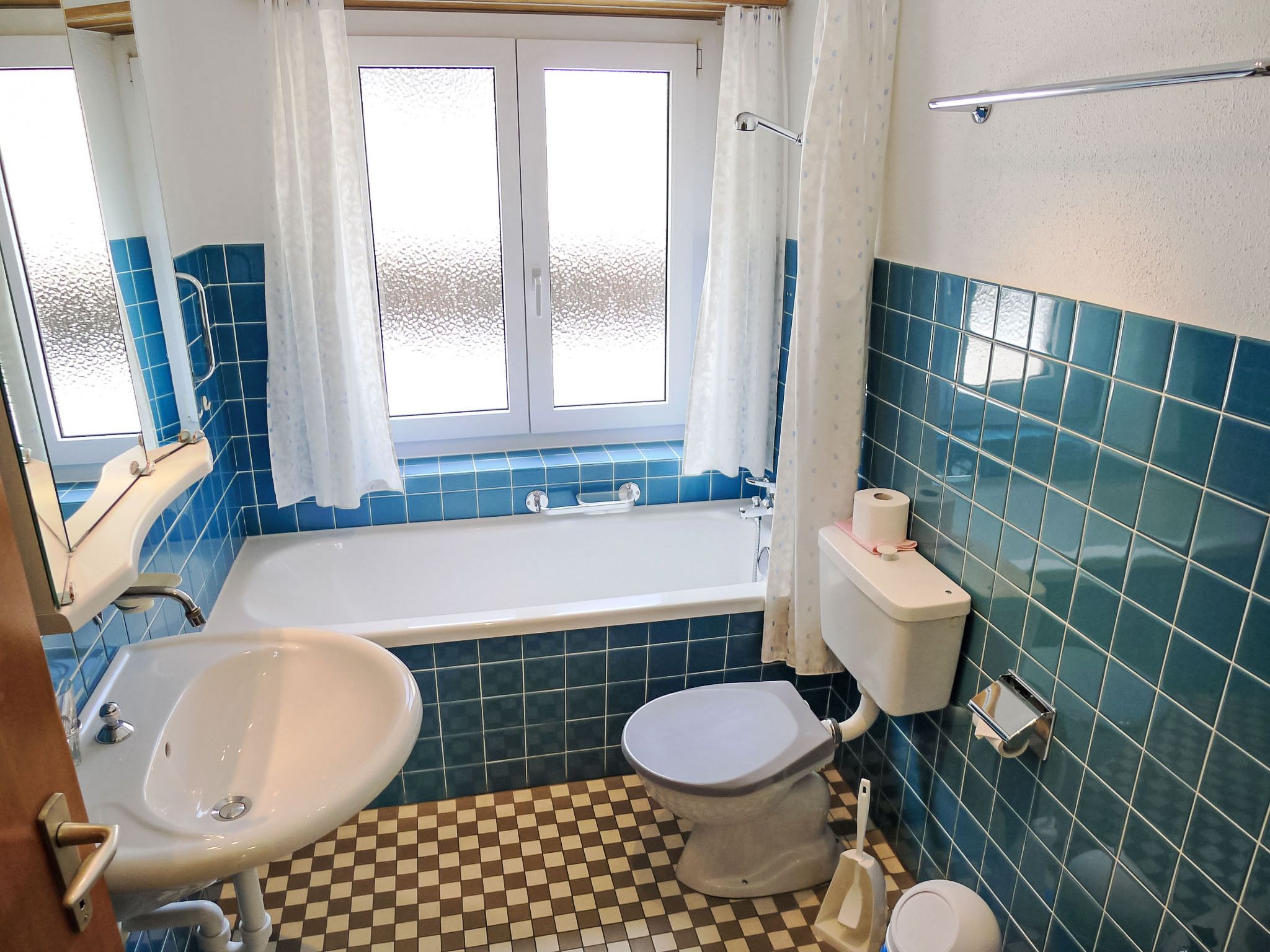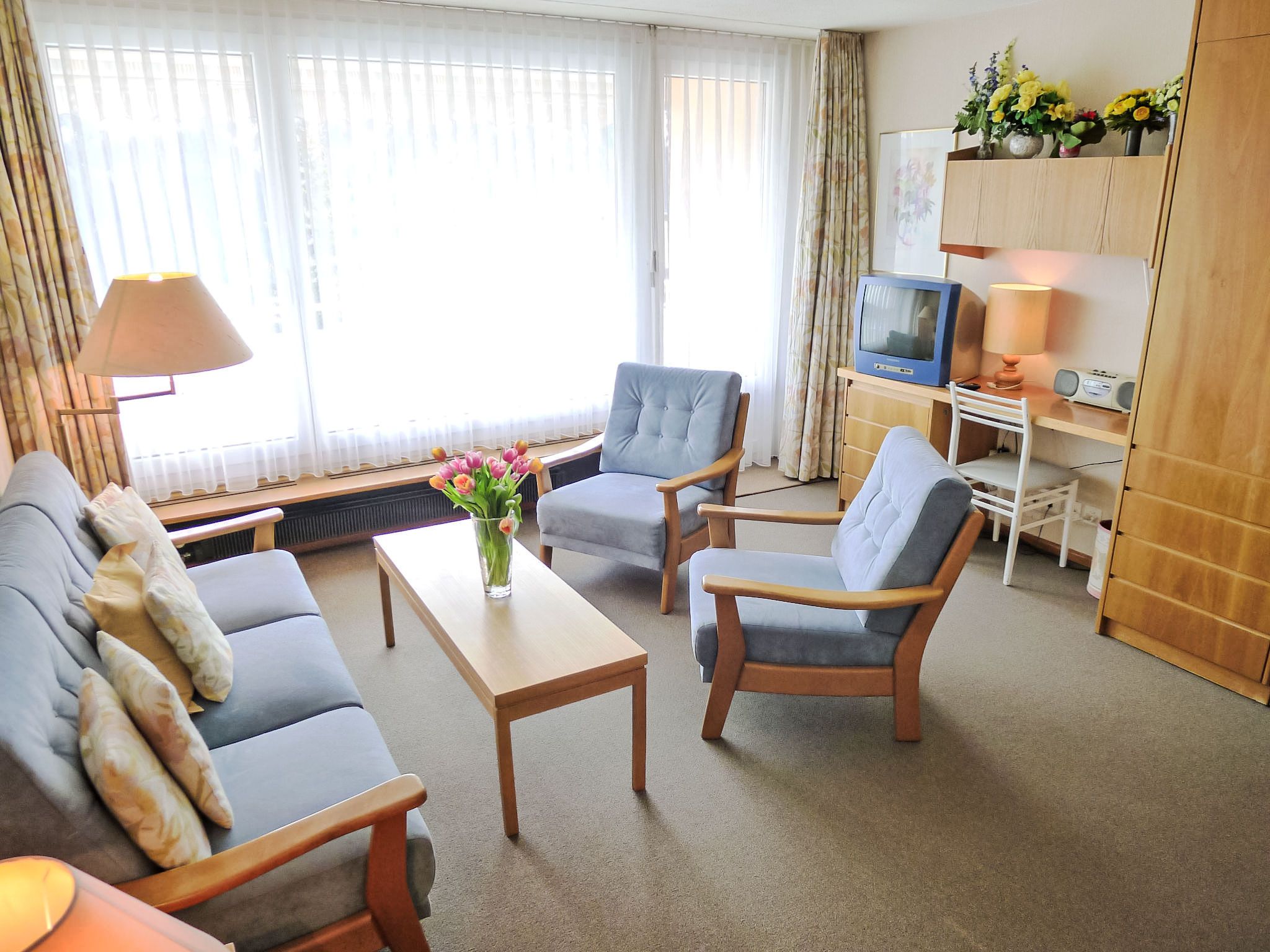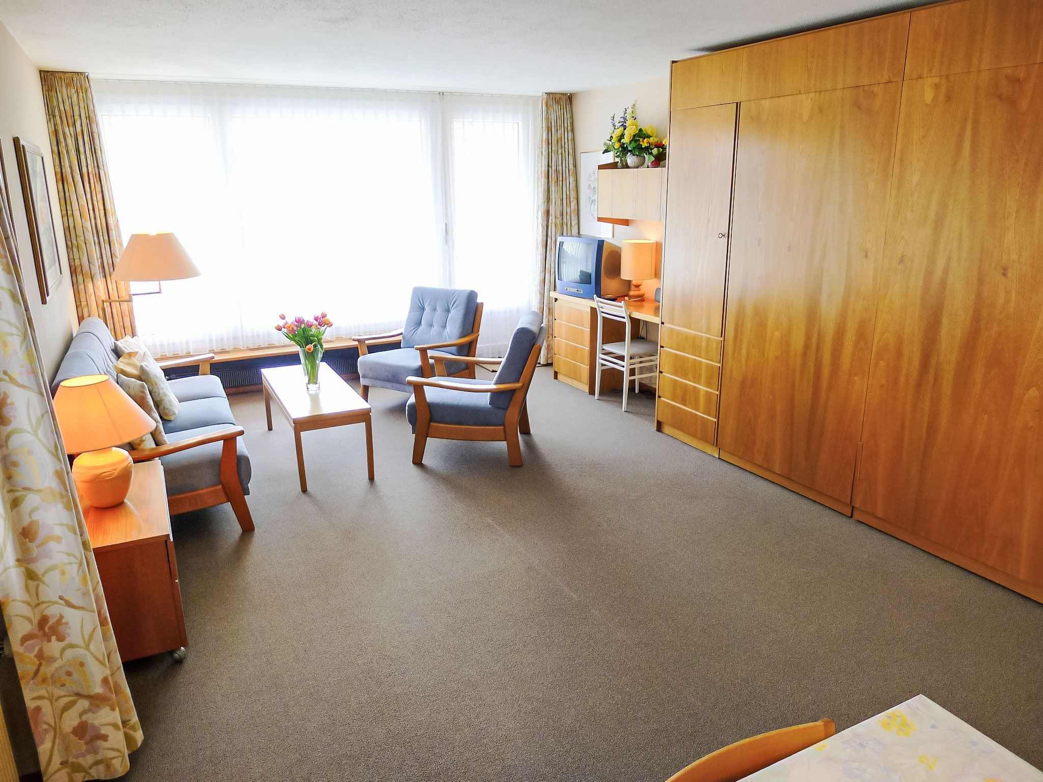 2-Zimmer-Wohnung 57 m2 im 1. Stock. Gemütlich eingerichtet: Wohn-/Esszimmer mit 2 Wandschrankbetten, Sat-TV und Radio. Ausgang zum Balkon. 1 Zimmer mit 2 Betten. Küche (Backofen, Geschirrspüler, 4 Glaskeramikplatten, Toaster) mit Esstisch. Bad/Bidet/WC. Balkon, Nordlage und Ostlage. Balkonmöbel. Schöne Sicht auf die Berge, die Landschaft und die Ortschaft. Zur Verfügung: Internet (Wireless LAN, gratis). Bitte beachten: Nichtraucher-Unterkunft.