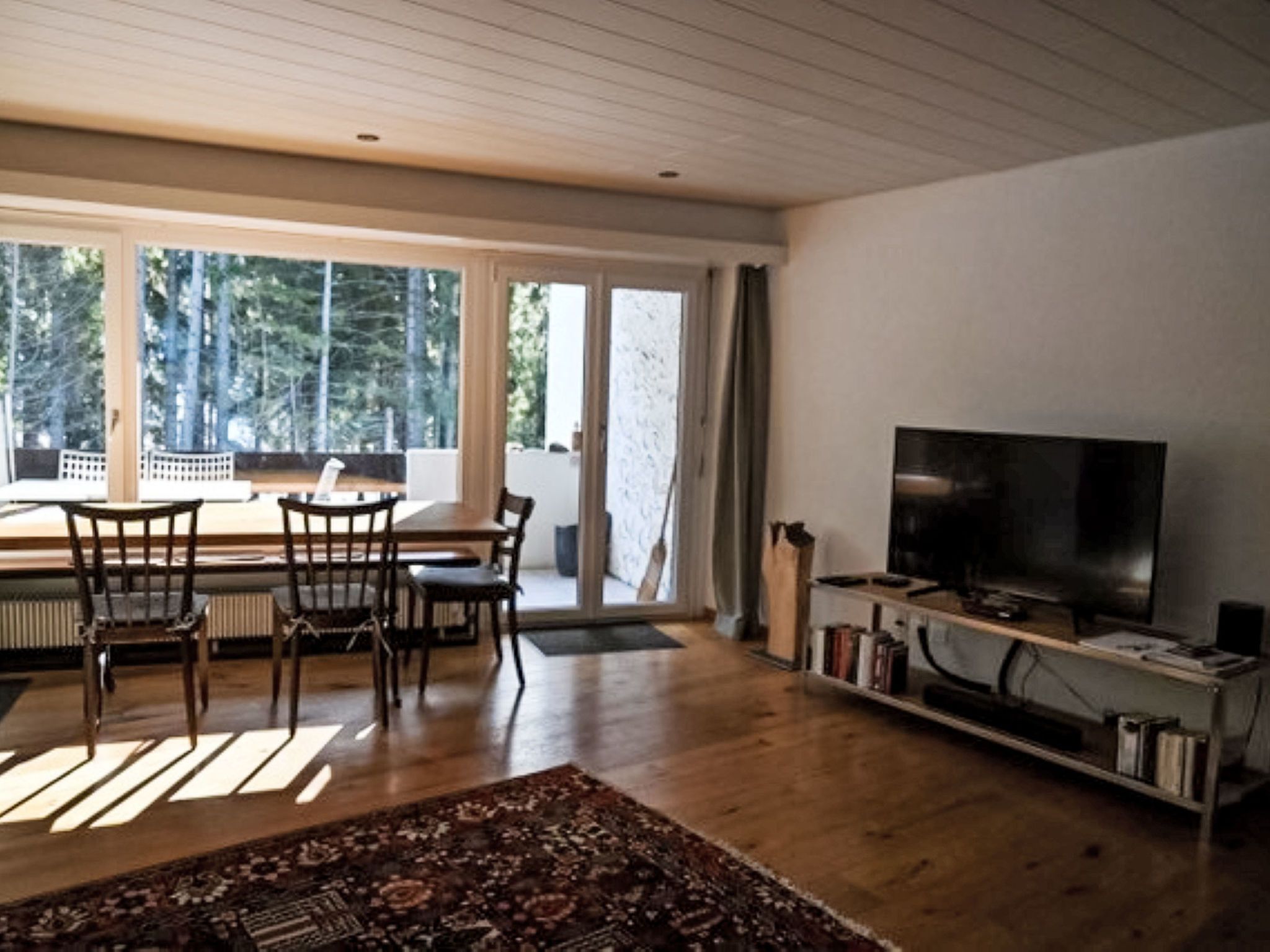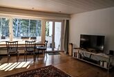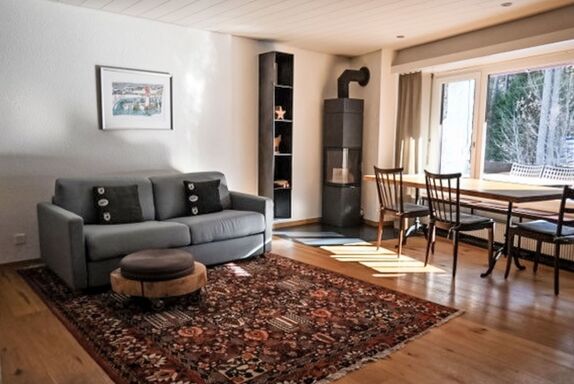 2-Zimmer-Wohnung 62 m2 im 2. Stock. Komfortabel und gemütlich eingerichtet: Wohn-/Esszimmer mit 1 Doppeldiwanbett (140 cm), Schwedenofen und Kabel-TV (Flachbildschirm), Stereoanlage. Ausgang zum Balkon. 1 Doppelzimmer. Offene Küche (Backofen, Geschirrspüler, 4 Glaskeramikplatten, elektrische Kaffeemaschine). Bad/WC. Balkon 8 m2. Balkonmöbel. Sicht auf den Wald. Zur Verfügung: Internet (WLAN, gratis). Parkplatz beim Haus. Bitte beachten: Nichtraucher-Unterkunft.