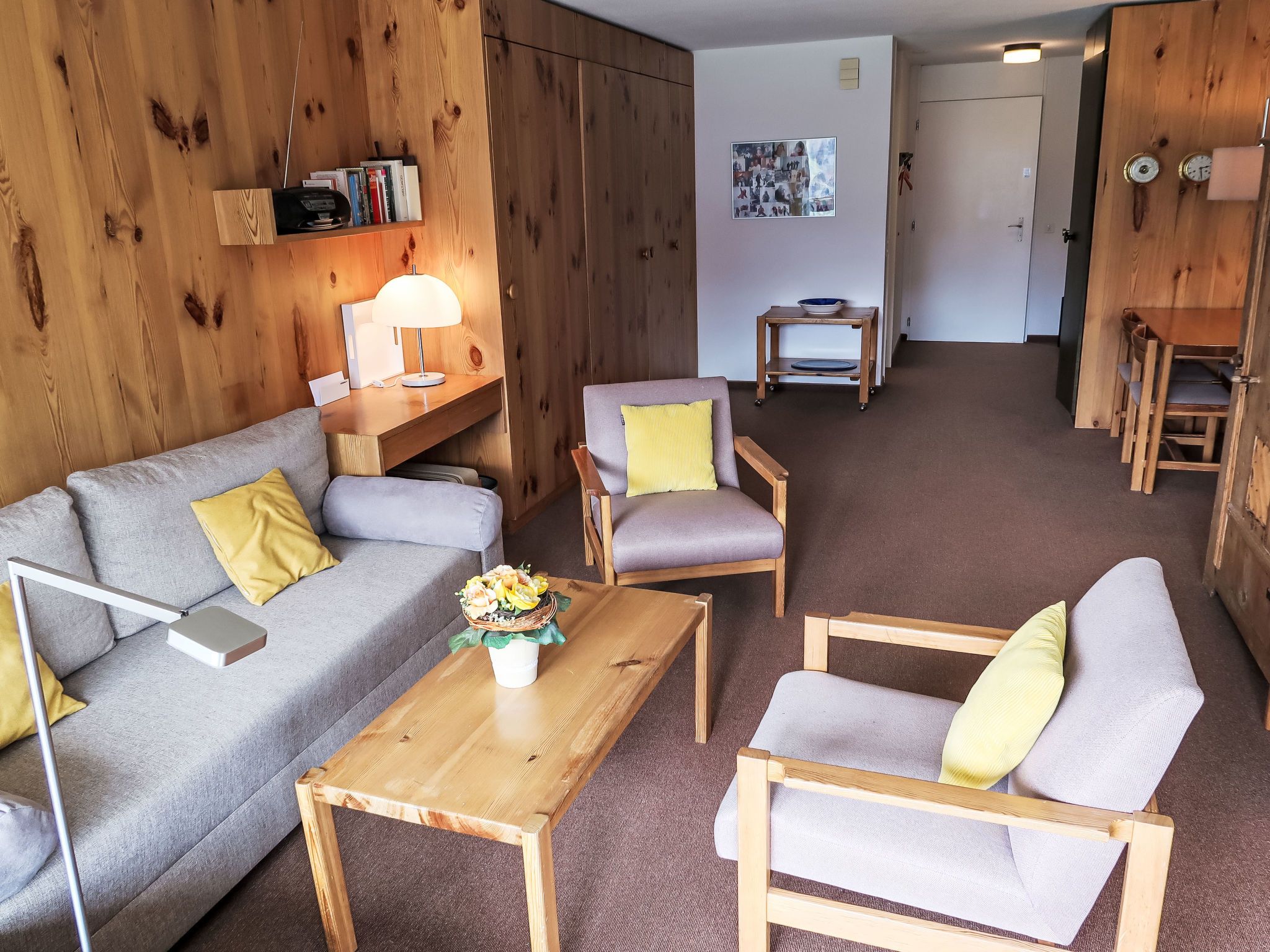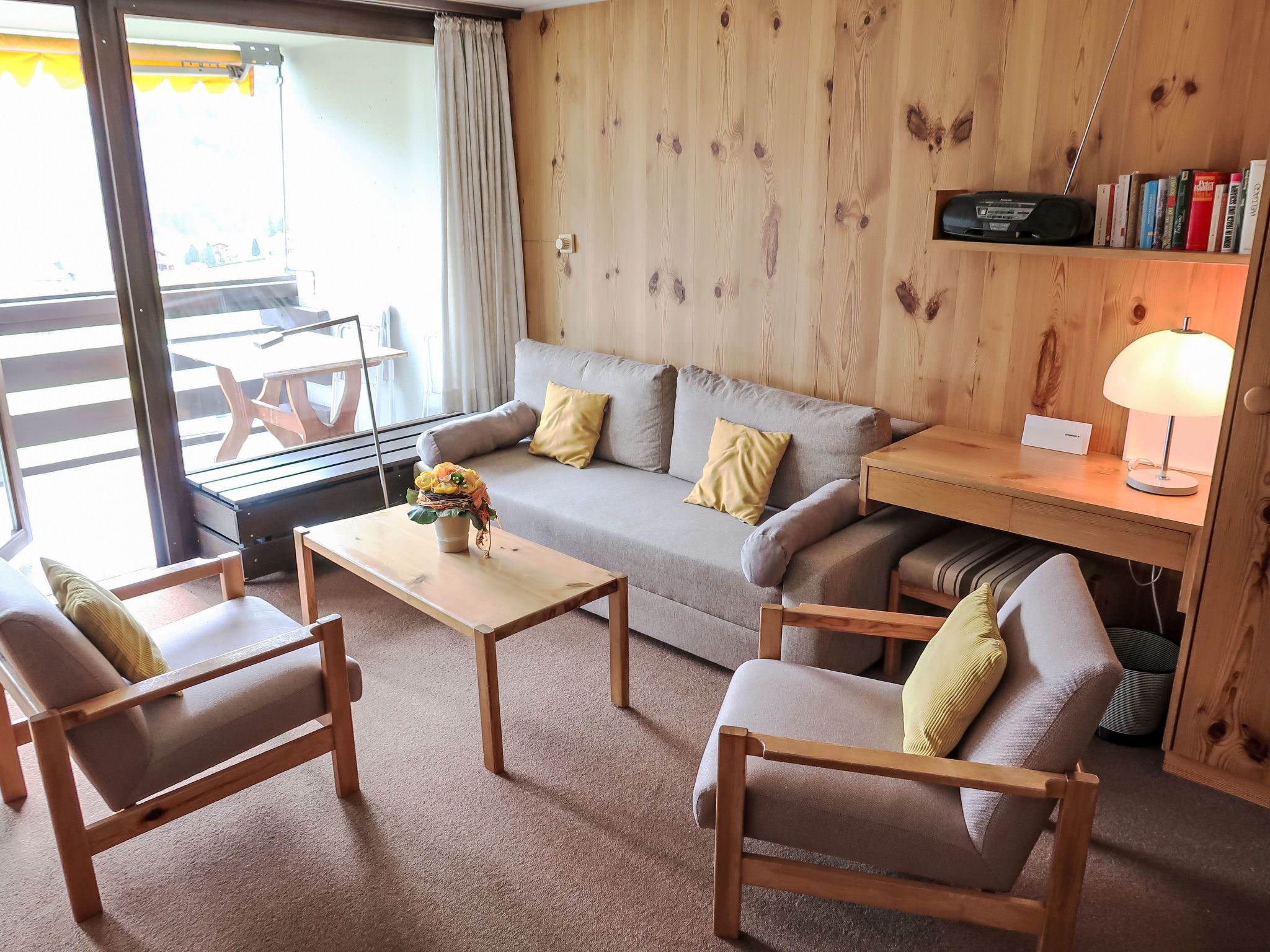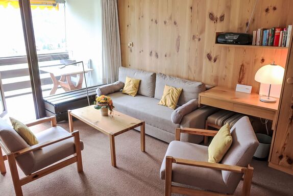 Apt A 084, 2-Zimmer-Wohnung 62 m2 im 8. Stock. Komfortabel und gemütlich eingerichtet: Wohn-/Esszimmer mit 2 Wandschrankbetten und Sat-TV (Flachbildschirm). Ausgang zum Balkon. 1 Zimmer mit 2 Betten. Offene Küche (Backofen, Geschirrspüler, 4 Glaskeramikplatten, Toaster, Wasserkocher). Dusche/WC. Balkon, Südlage. Balkonmöbel. Schöne Sicht auf die Berge, die Landschaft und Medelsergletscher. Zur Verfügung: Internet (Wireless LAN, gratis). Bitte beachten: Nichtraucher-Unterkunft.