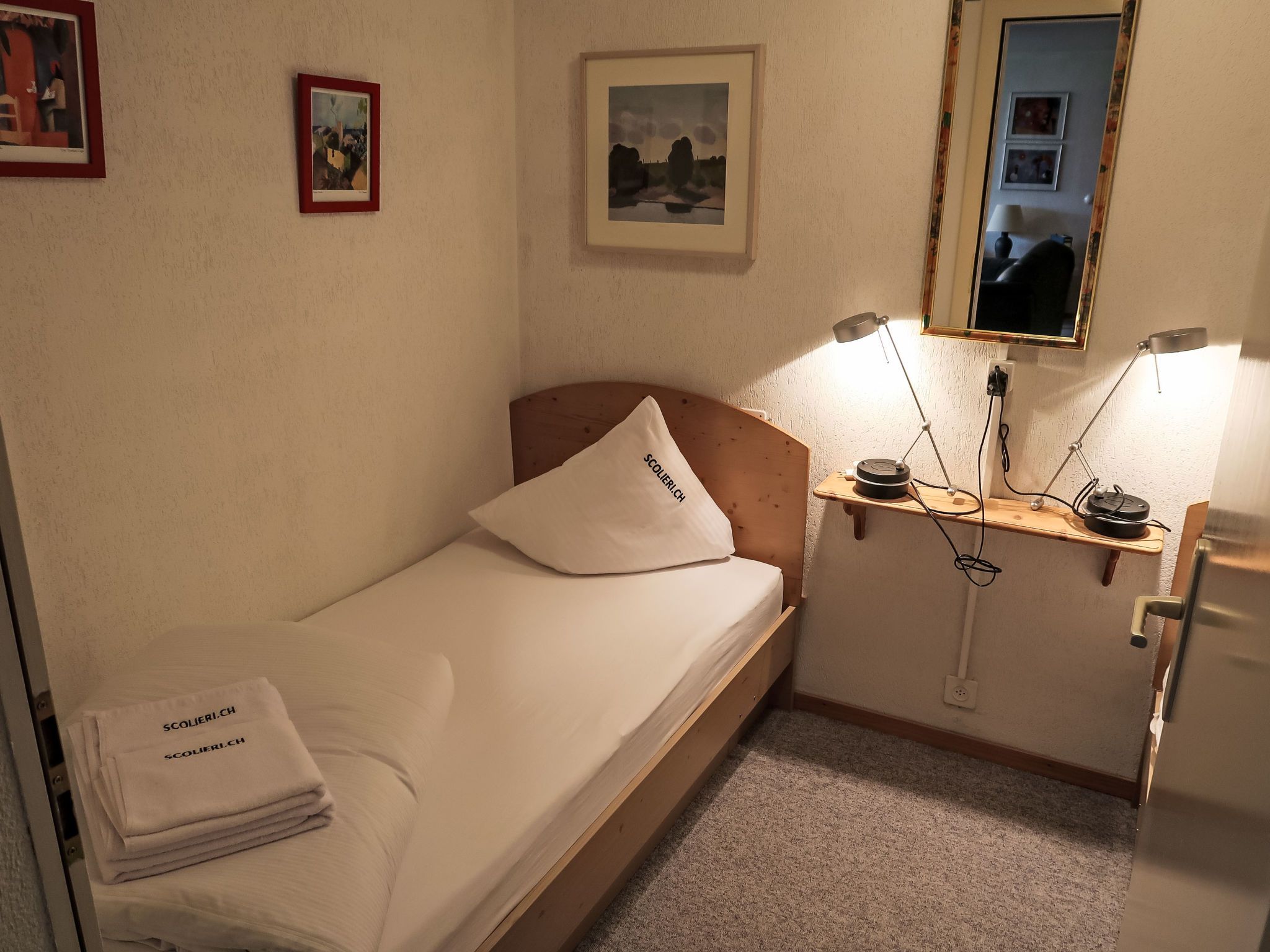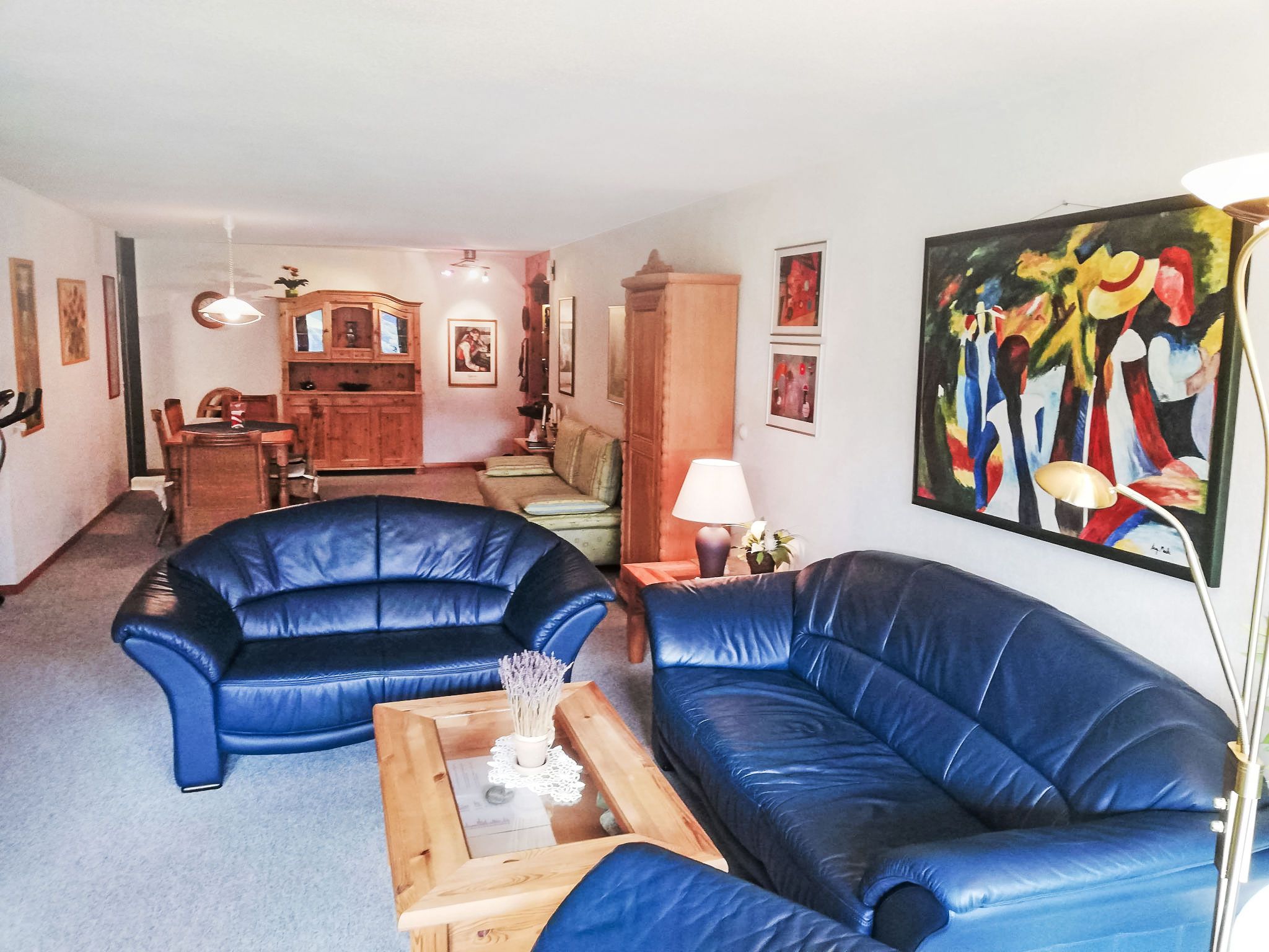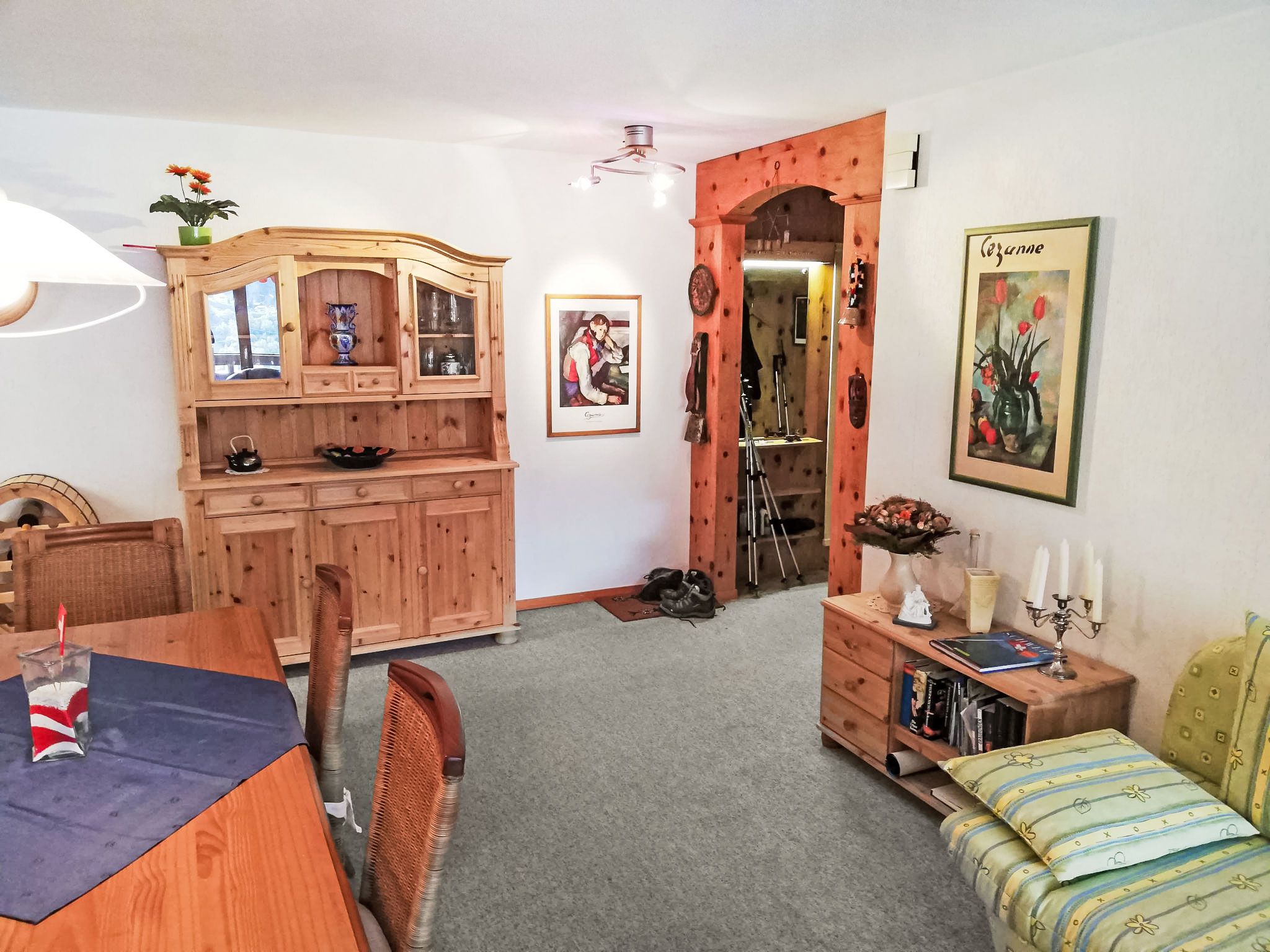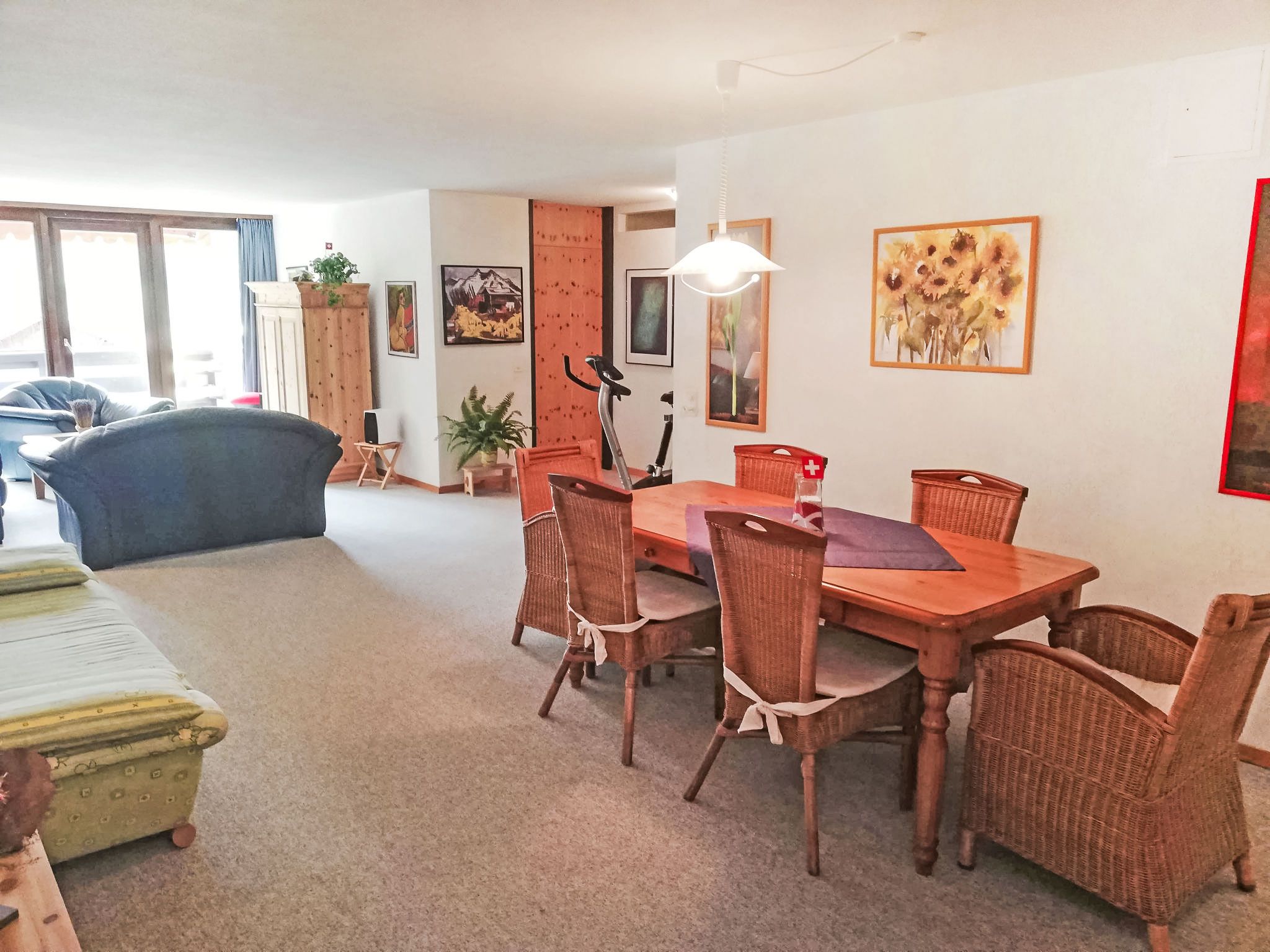 Apt B 032, 3-Zimmer-Wohnung 90 m2 im 3. Stock. Gemütlich eingerichtet: Wohn-/Esszimmer mit Sat-TV (Flachbildschirm), Stereoanlage. Ausgang zum Balkon. 1 Doppelzimmer. Ausgang zum Balkon. 1 kleines Zimmer, ohne Fenster mit 2 Betten. Küche (Backofen, 4 Glaskeramikplatten, Mikrowelle). Bad/WC. Balkon, Südlage. Balkonmöbel. Sehr schöne Sicht auf die Berge, die Landschaft und Medelsergletscher. Zur Verfügung: Babybett. Internet (Wireless LAN, gratis).