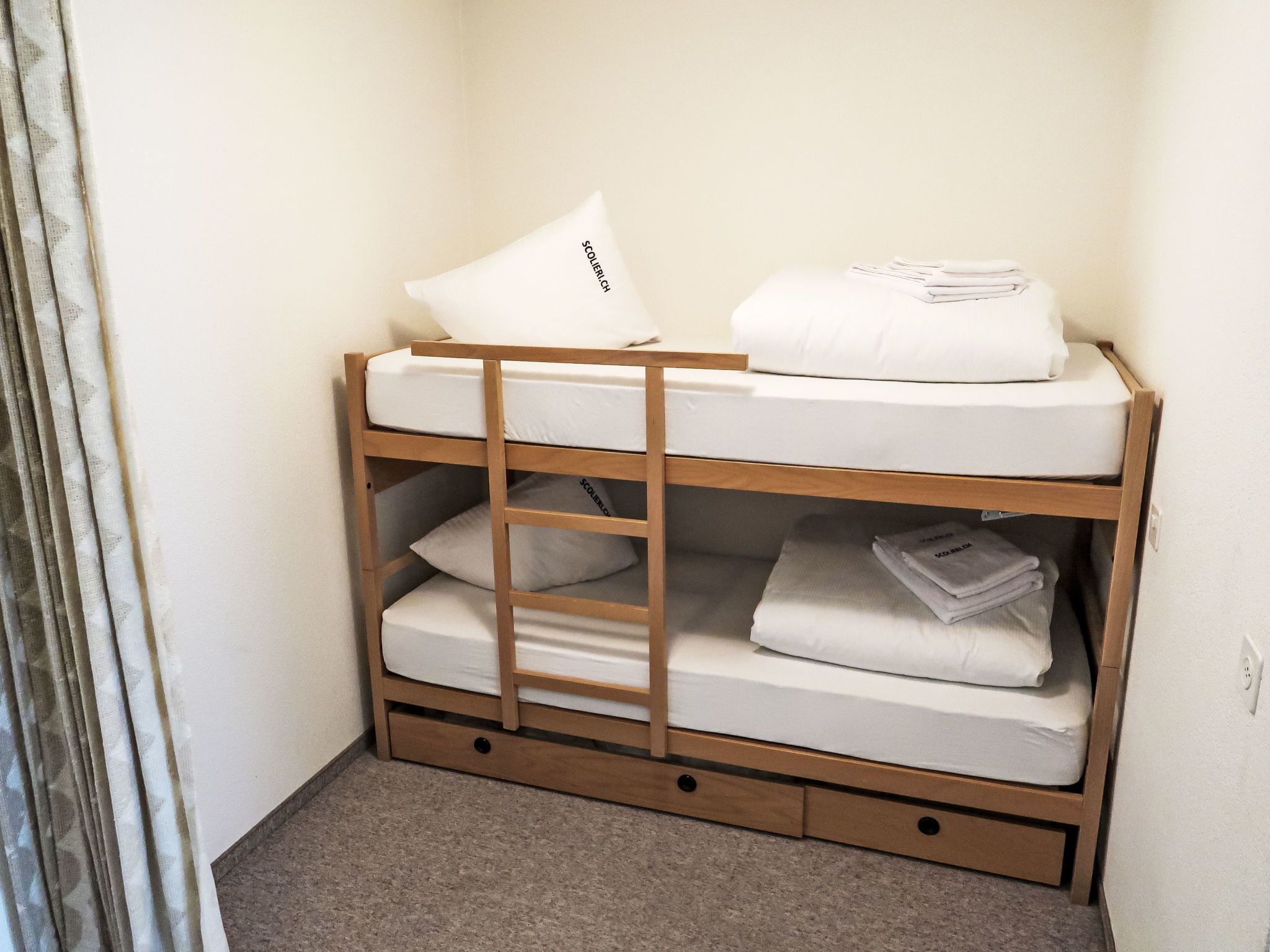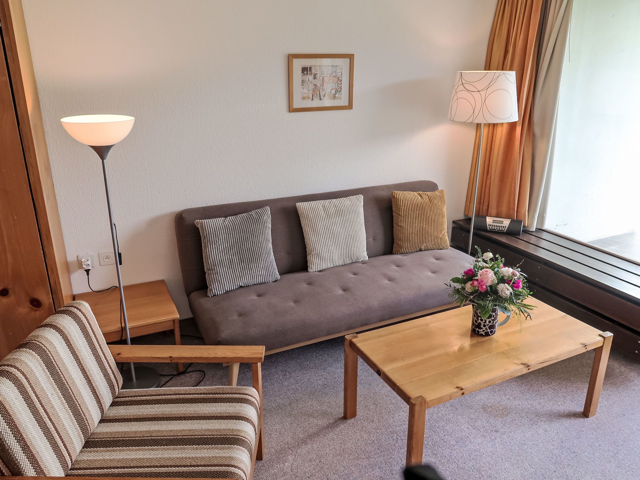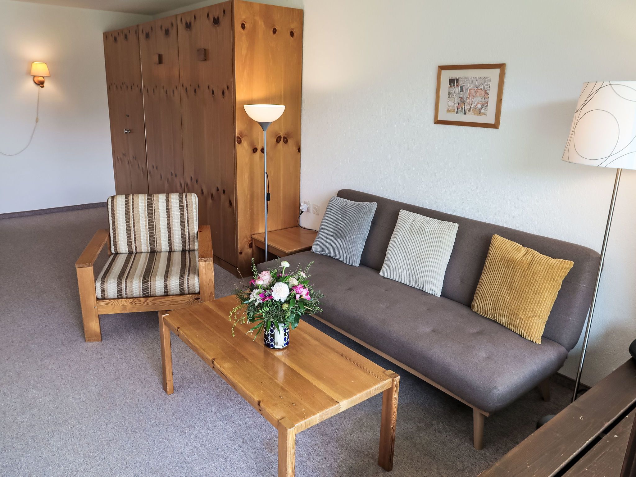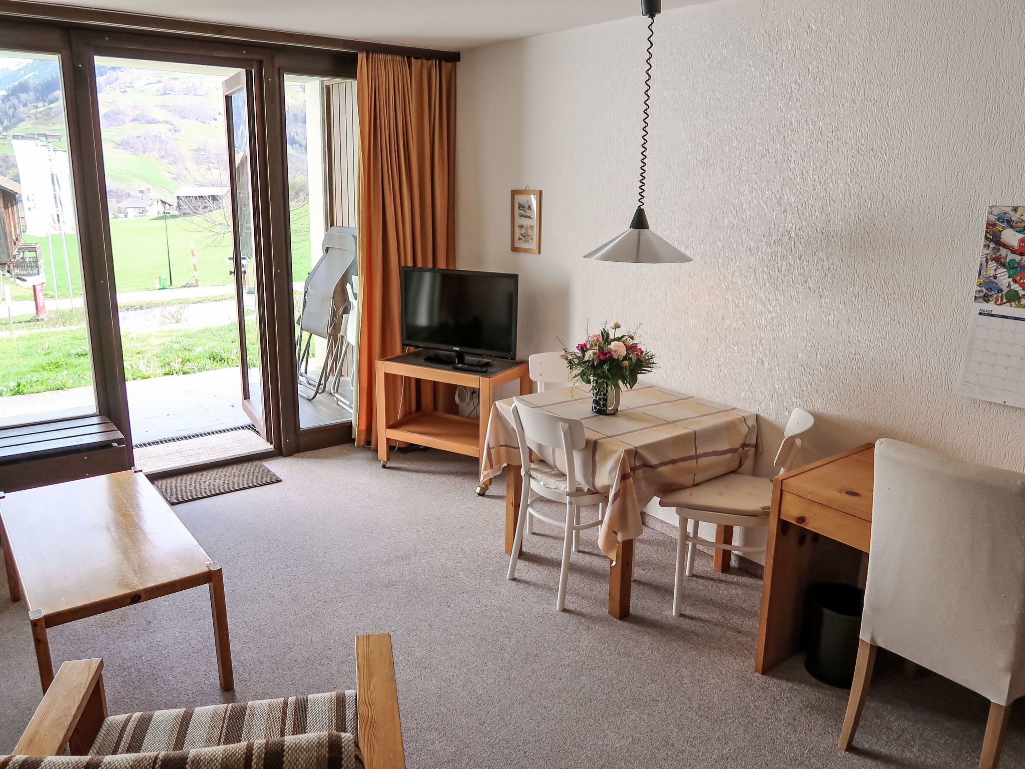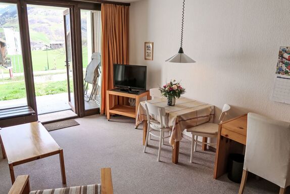 Apt C 015, 1-Zimmer-Wohnung 45 m2, im Erdgeschoss. Einfach und zweckmässig eingerichtet: Wohn-/Esszimmer mit 2 Wandschrankbetten und Sat-TV (Flachbildschirm). Ausgang zum Gartensitzplatz. Schlafnische mit 1 x 2 Etagenbetten. Kochnische im Eingang (4 Glaskeramikplatten). Bad/WC. Südlage, Gartensitzplatz. Schöne Sicht auf die Berge, die Landschaft und Medelsergletscher. Zur Verfügung: Internet (Wireless LAN, gratis). Bitte beachten: Nichtraucher-Unterkunft. Anstelle eines abgeschlossenen Schlafzimmers befinden sich manche Schlafplätze in einem offenen Bereich (Galerie, Nische etc.).
